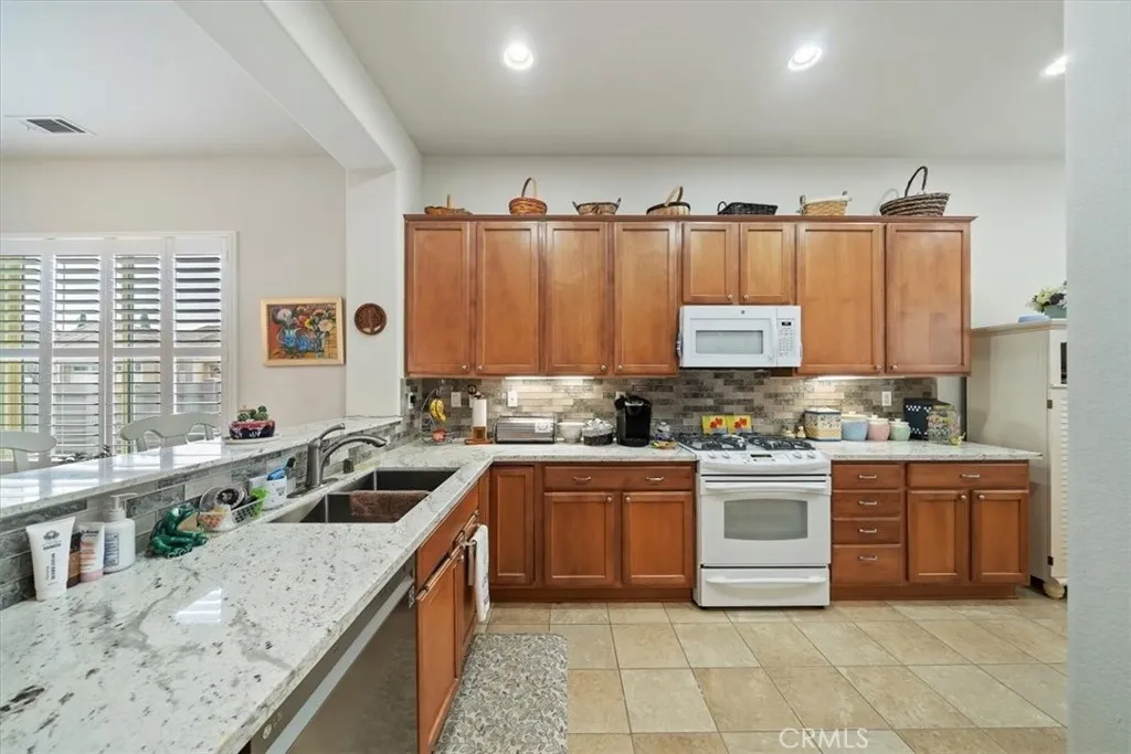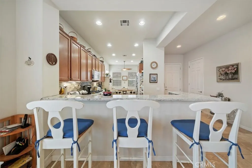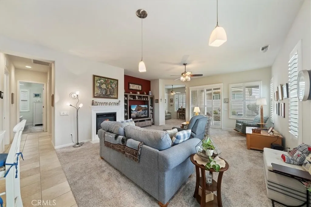 Welcome to your new home!!! This home has everything you need to enjoy within a well-maintained, gated, Senior community with countless activities and events to participate in or relax and enjoy the peaceful comforts of being home! Enjoy entering this beautiful home with an open floor plan featuring spacious rooms and an updated kitchen equipped with newer granite countertops, full backsplash, abundant cabinetry with pull-out drawers, pantry, a dining area with a view, and a large bar counter providing additional space for entertaining. Additional features include lovely plantation shutters, recessed lighting, ceiling fans, a beautiful fireplace, and an indoor laundry room with wash basin and ample storage cabinets. The primary bathroom offers a walk-in closet, walk-in shower, and a dressing area with generous counter space, double sinks, and lighting options. This is a must-see property, full of lovely spaces, beautiful windows, finished two-car garage and spacious driveway, surrounded by professional landscaping and flatwork. Make your appointment today!