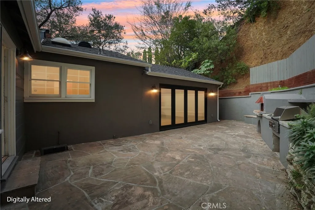Tucked into the heart of Beachwood Canyon, this charming hillside residence blends classic character with thoughtful updates and exceptional indoor-outdoor living. Warm wood floors, abundant natural light, and a welcoming fireplace anchor the living spaces, while the kitchen features butcher block countertops, a professional-grade range, and timeless cabinetry. French doors and multiple outdoor access points lead to expansive stone patios, ideal for entertaining, dining al fresco, or enjoying the serene canyon setting, complete with a built-in outdoor kitchen and pizza oven. A detached garage with exposed beam ceiling offers flexibility for parking, storage, or creative use. Surrounded by mature trees and greenery, yet just minutes from Franklin Village, Griffith Park hiking trails, Hollywood, Los Feliz dining, and easy freeway access, this home offers a rare balance of privacy, charm, and convenience in one of Los Angeles most sought-after neighborhoods.