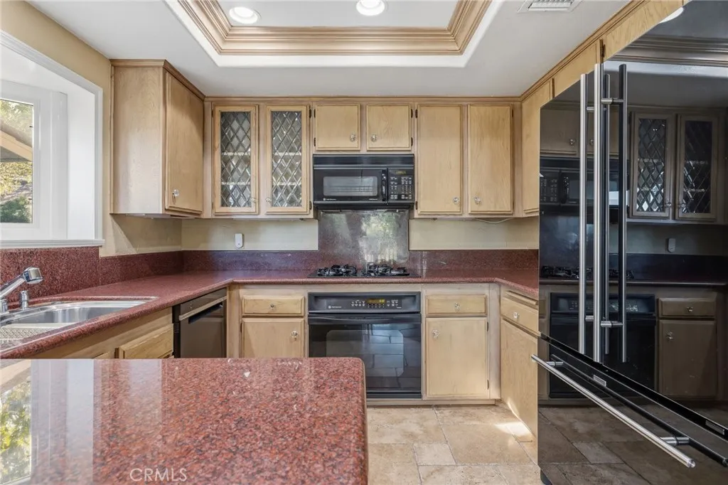 Charming Oak Park Home Beautifully Appointed & Nestled within a serene tranquil setting. Located in the highly desirable Country Vista tract, in a Coveted Prime Location of the development this home stands out!Tucked away off the street on a peaceful Cul de sac this three-bedroom, 2 1/2 bath home offering beautiful expansive views could be yours. Upon entering the home through beveled glass doors, you are greeted by a travertine tile-floor entryway leading you to an expansive living room and dining areas boasting vaulted ceilings that create an open, airy atmosphere. Enjoy the cozy fireplace with custom hearth and mantle as you look upon beautiful views, perfect for gatherings and relaxing evenings. The large slider doors in the living and dining areas invite you to step out onto an expansive balcony, offering you an indoor-outdoor living experience, just perfect for enjoying morning coffee or an evening sunset . A beautiful light and bright kitchen with bay window, wood cabinetry, granite counters with ample space for preparing meals has an open flow feeling to the dining and living areas. The Primary Suite is conveniently located on the same level as the living area features plantation shutters, vaulted ceiling, en suite bath and plenty of closet space. 2nd and 3rd Bedrooms located downstairs are perfect for family or work from home office spaces.. A unique custom-built feature in this home is the large walk-in closet downstairs you must see to appreciate!Downstairs bedroom area has a private entry. The property includes a detached two-car garage, providing ample storage