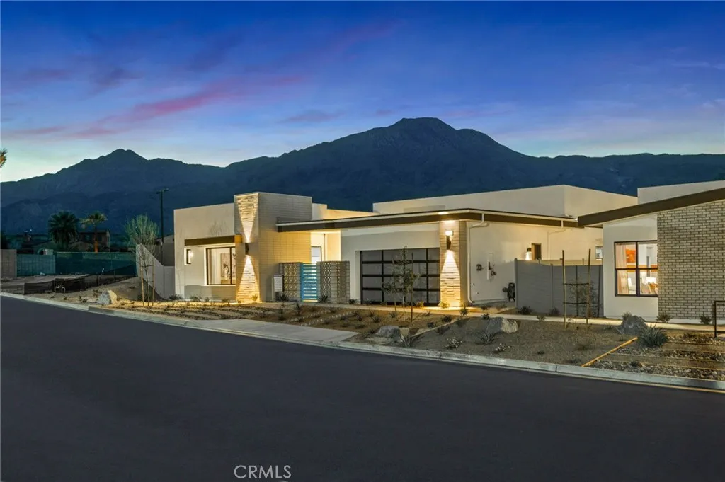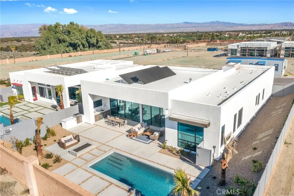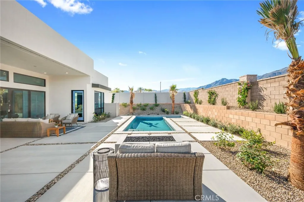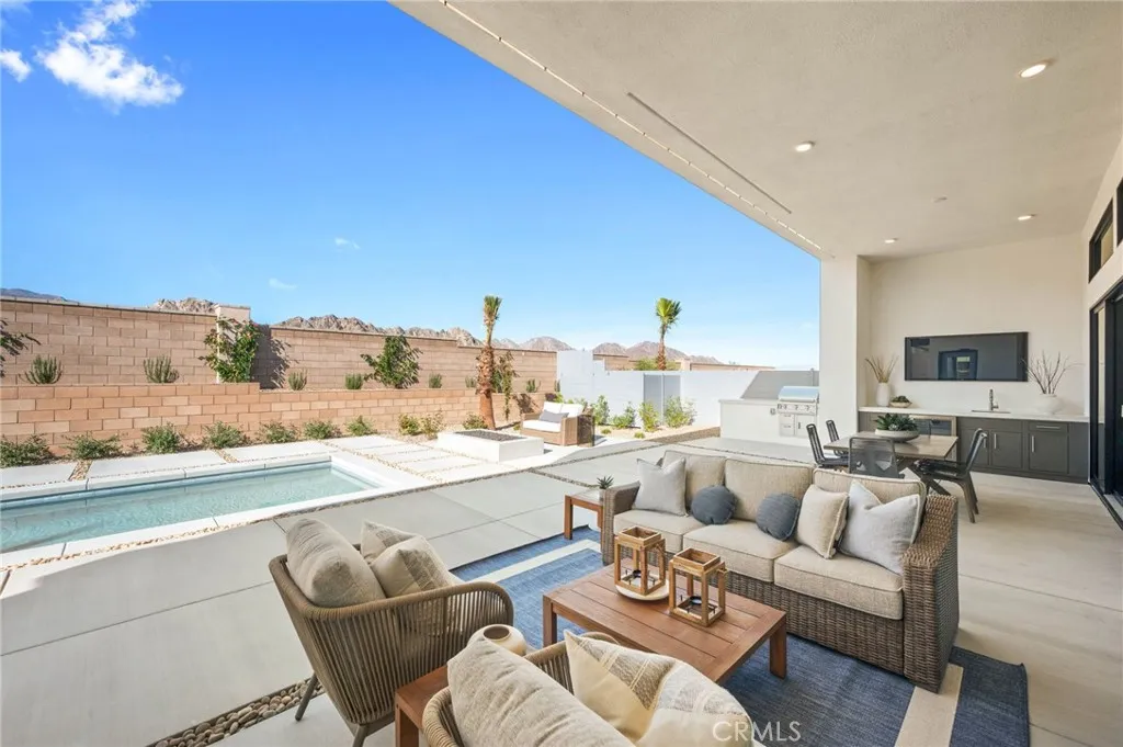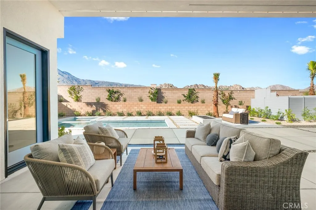 Welcome to Oasis by Crestwood Communities, a gated community offering modern desert living with breathtaking mountain views in the heart of La Quinta. This unique single-story modern home features 2,458 square feet with 3 bedrooms, 3.5 bathrooms, and a 3-car garage, and is accessed through a private gated courtyard that provides both privacy and style. Inside, soaring ceilings, striking 12x24 tile floors, and an open-concept great room are filled with natural light from front to back, enhanced by expansive sliding glass doors that create a seamless indoor-outdoor flow to the covered patio. The outdoor space is resort style, perfect for entertaining or relaxing beside the included pool and spa. The open kitchen is designed for both functionality and elegance, featuring designer quartz countertops, an oversized island with waterfall edges, modern flat panel cabinetry with warm accent lighting, soft-close hinges, and stainless-steel Bosch appliances. Each bedroom includes its own en-suite bathroom, while the primary suite offers a resort-style retreat with direct access to the covered patio and a spa-inspired bathroom, thoughtfully separated from guest bedrooms for added privacy. Solar is available for purchase or lease, and the home includes many additional amenities. Conveniently located near golf, hiking, biking, and horseback riding, yet away from traffic and congestion. Model grand opening is Saturday, January 24th. Photos shown are of the model home; the subject property is currently under construction.