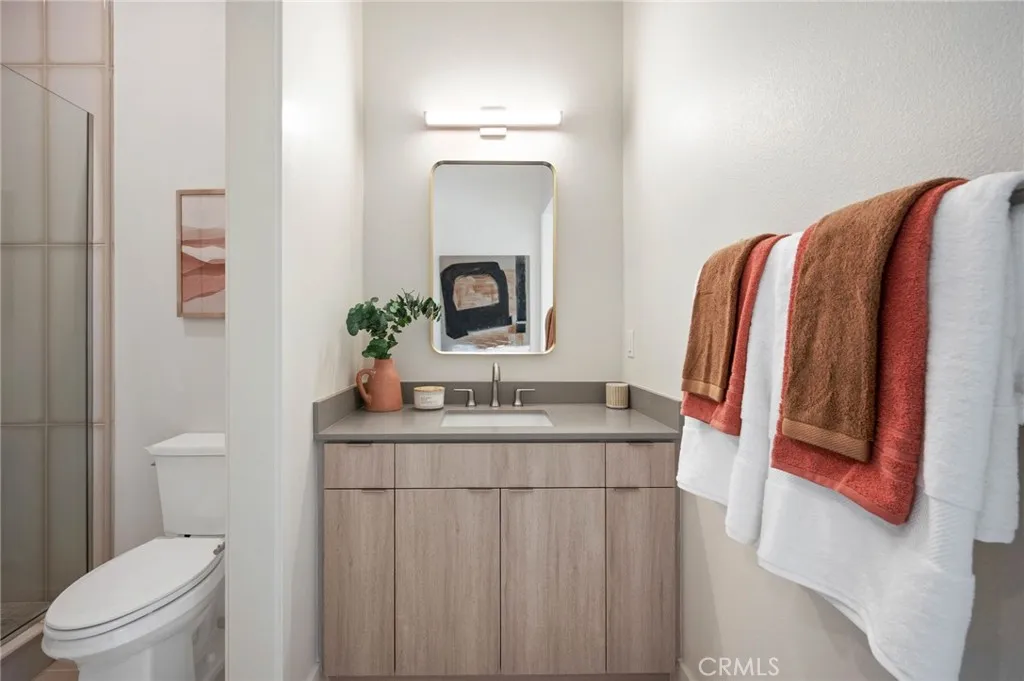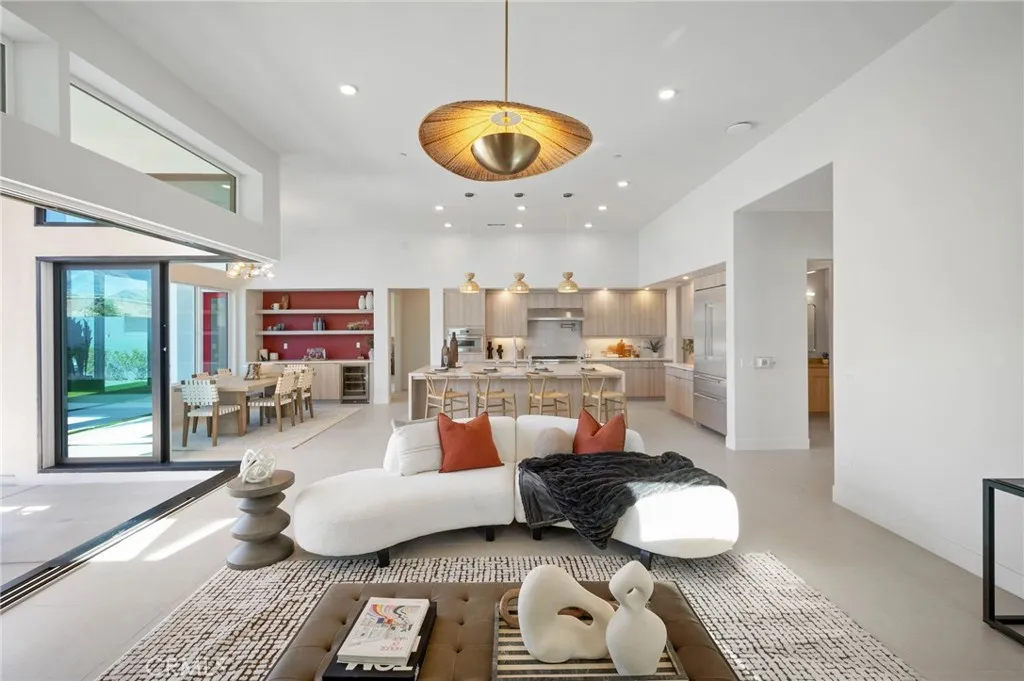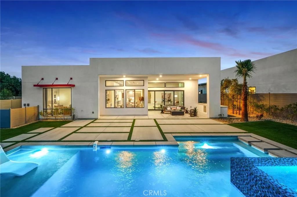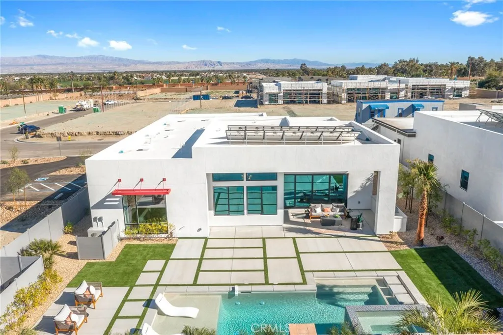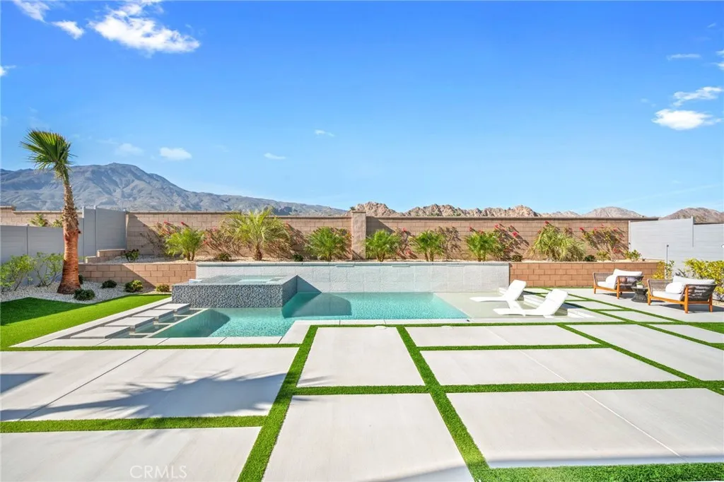 Welcome to Oasis by Crestwood Communities, a gated community offering modern desert living with breathtaking mountain views in the heart of La Quinta. This unique single-story modern home features 2,721 square feet with 3 bedrooms, 3.5 bathrooms, and a 3-car garage, and is accessed through a private gated courtyard that provides both privacy and style. there is also a flex room that can be used for exercise or art. Inside, soaring ceilings, striking 12x24 tile floors, and an open-concept great room are filled with natural light from front to back, enhanced by expansive Corner sliding glass doors at the Kitchen/Great room that create a seamless indoor-outdoor flow to the covered patio. Welcome to your resort style backyard, perfect for entertaining or relaxing beside the included pool and spa. The open kitchen is designed for both functionality and elegance, featuring designer quartz countertops, an oversized island with waterfall edges, modern flat panel cabinetry with warm accent lighting, soft-close hinges, and stainless-steel Bosch appliances. Each bedroom includes its own en-suite bathroom, while the primary suite offers a resort-style retreat with direct access to the covered patio and a spa-inspired bathroom, thoughtfully separated from guest bedrooms for added privacy. Solar is available for purchase or lease, and the home includes many additional amenities. Conveniently located near golf, hiking, biking, and horseback riding, yet away from traffic and congestion. Model grand opening is Saturday, January 24th. Photos shown are of the model home; the subject property