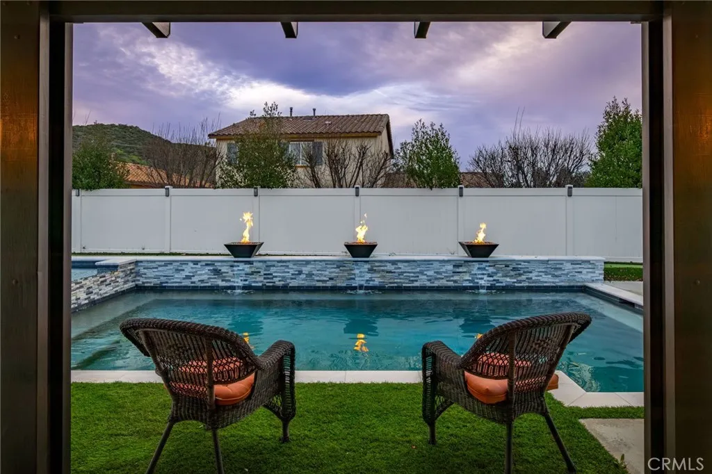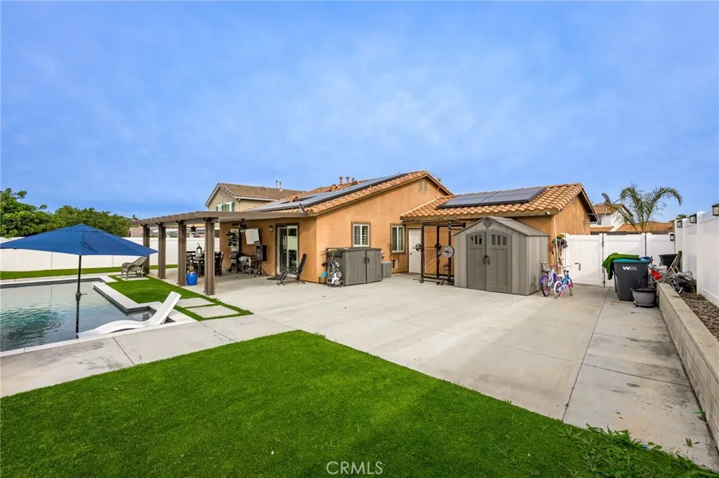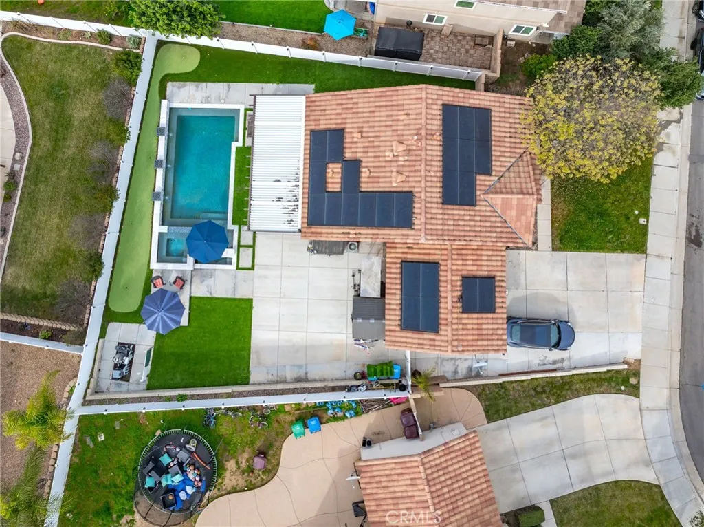 PRICE REDUCTION!!! Welcome to your private sanctuary in the prestigious San Marino community of Menifee. This impeccably designed 3-bedroom, 2-bathroom single story home offers the perfect blend of sophisticated indoor comfort and a backyard that rivals a five-star resort. Step inside to find an airy, open floor plan adorned with stunning wood-look tile flooring and premium California shutters throughout. The heart of the home flows seamlessly, but the real showstopper lies just beyond the sliding doors. The backyard is an entertainers dream, featuring a sparkling Pebble Tec pool and spa complete with a Baja shelf, three dramatic waterfalls, and three flickering fire bowls and a fully removable pool fence. Practice your short game on your private 4-hole putting green, or unwind by the firepit. For summer nights enjoy outdoors under the expansive Alumawood covered patio. Enjoy the ultimate peace of mind with fully owned Tesla Solar panels and two Tesla Power wall and EV chargers, ensuring top-tier energy efficiency. Extended driveway for potential trailer parking. Do not miss the opportunity, schedule your showing today!