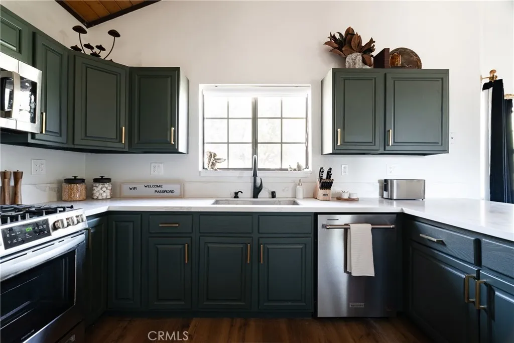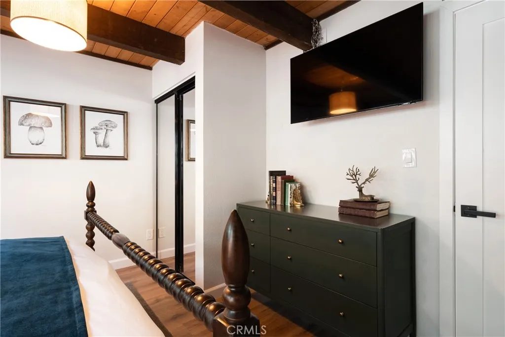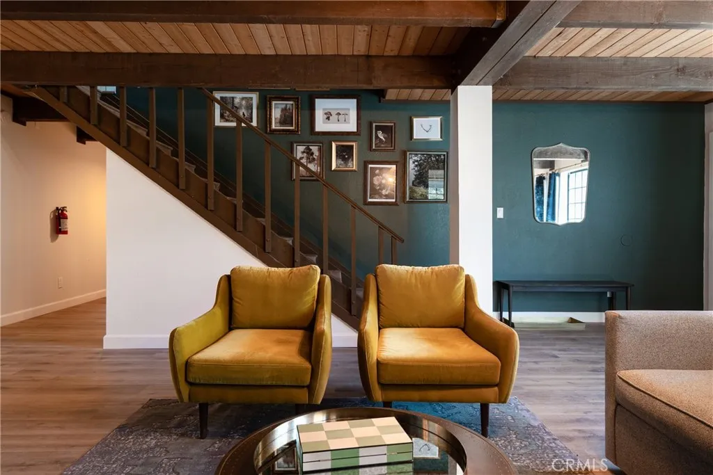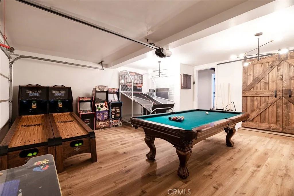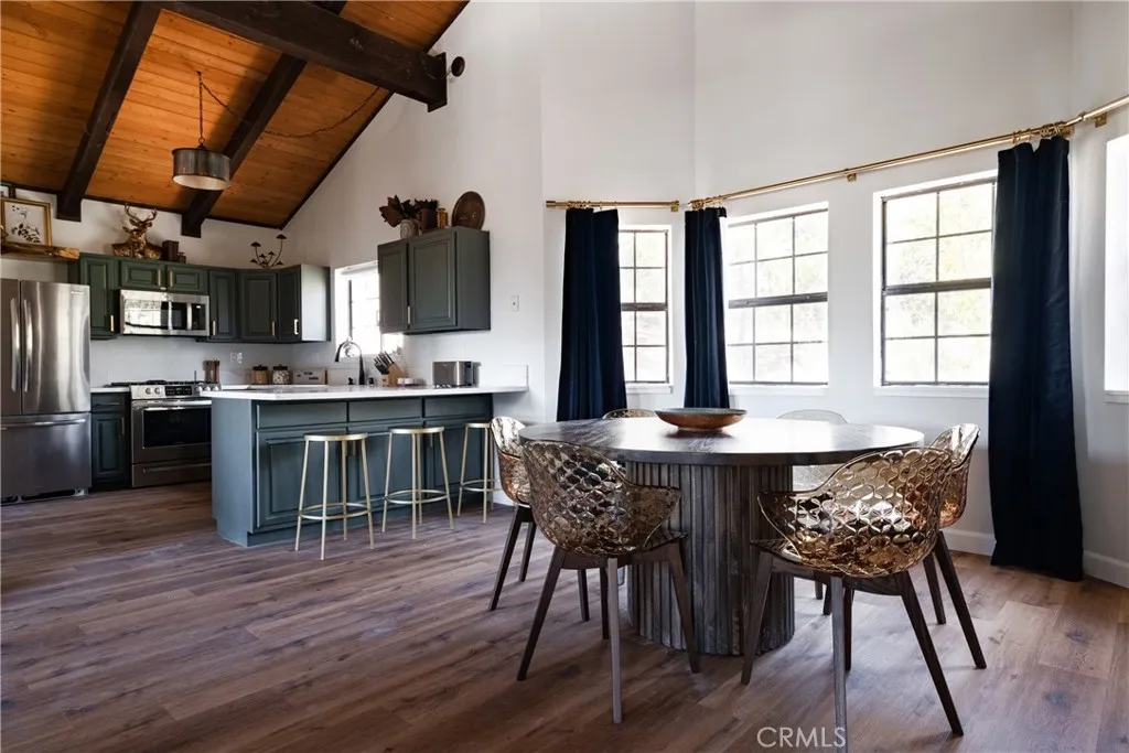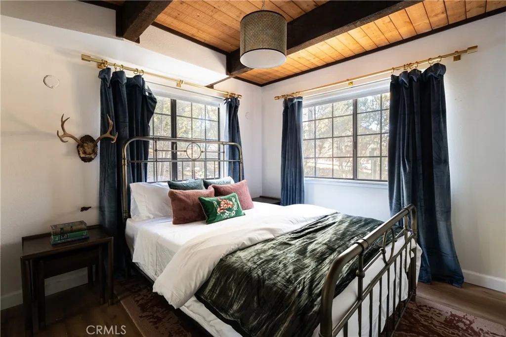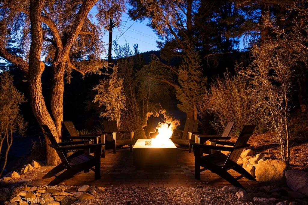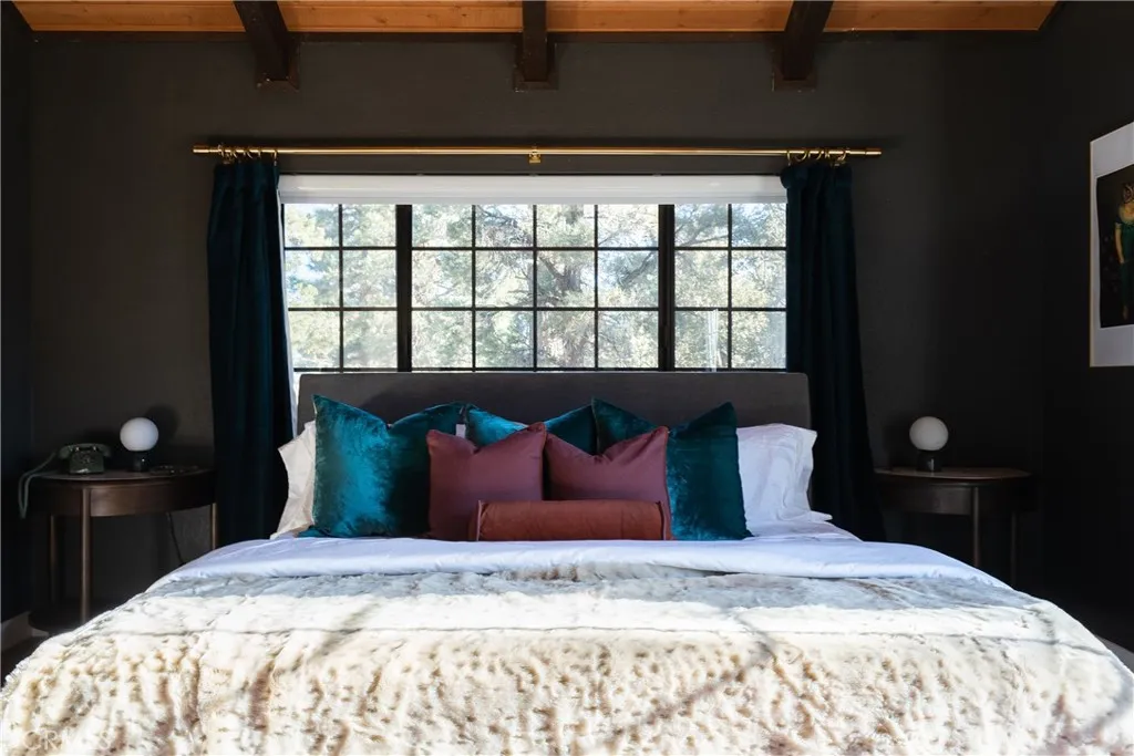 On a quiet Big Bear City street, this thoughtfully remodeled and professionally designed mountain home blends architectural character with modern comfort in a way that feels elevated and inviting. Vaulted, wood-beamed ceilings, rich textures, and curated design moments create a space that feels warm, expressive, and welcoming, ideal for those who value creativity, connection, and a slower mountain rhythm. The main level is designed for gathering and everyday living, anchored by a striking stone fireplace and filled with natural light. An open kitchen with generous prep space, breakfast bar seating, and modern appliances flows easily into a spacious dining area, perfect for long dinners, creative work sessions, or hosting friends and family. Multiple living areas offer flexibility for conversation, quiet moments, or settling in after a day outdoors. With four bedrooms and two bathrooms, the layout comfortably accommodates families and guests while still allowing separation between living and sleeping spaces. The lower level offers additional living space and a large recreation area, creating room for games, hobbies, or a flexible studio-style setup depending on your needs. Throughout the home, finishes and details strike a balance between warmth and refinement, with a palette that feels grounded, calm, and timeless. Outdoor spaces include a dedicated fire pit area and a spa tucked into a private setting, ideal for evenings under the stars or slow mornings surrounded by trees. Practical upgrades include air conditioning, an EV charger, and a two-car attached garage that has f