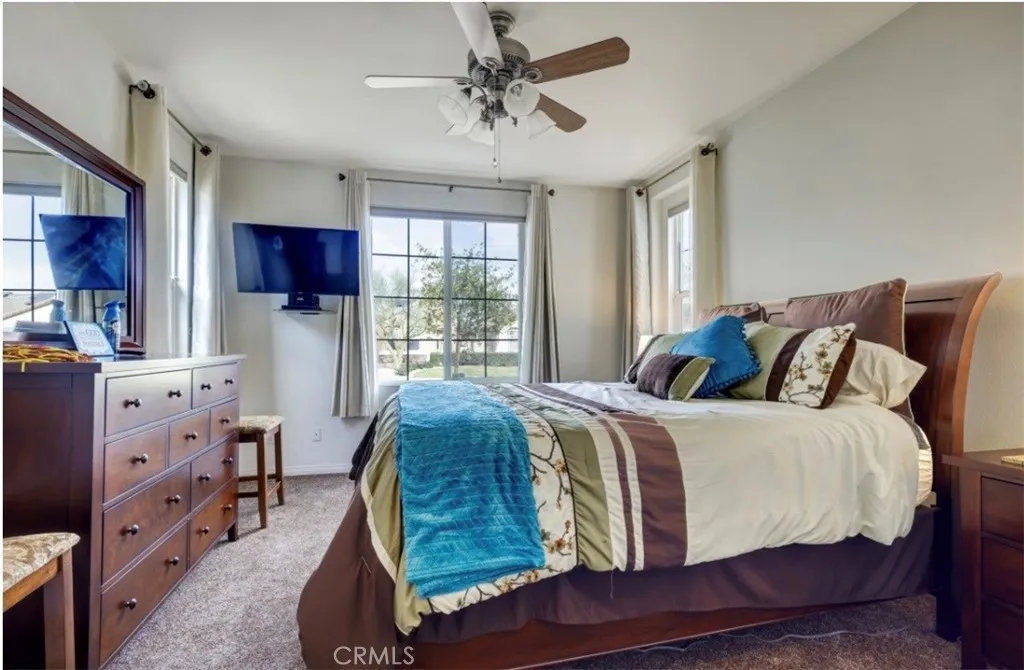 Welcome to The Retreat at Holiday retirement community, sought-after "Over 55" gated resort community. Home has 2 spacious bedrooms plus bonus room. The bright living room features a cozy fireplace and flows into the gourmet kitchen, with a breakfast bar island. Ceiling fans, located throughout the home. Two master bedrooms with their own bathrooms located on opposite sides of the home for privacy and comfort. Master bedroom suite has a walk-in closet and a door that leads to the patio and back yard. Bonus room with two large double glass paned windows for sound proofing. Large laundry room with a sink, desk, and ample storage. Direct garage access to home. Low maintenance landscaping front and back yard. Extra storage unit in backyard. The back yard has block walls on all sides for privacy. Home has a built-in patio and awning. The back yard is fully landscaped and ready entertain and enjoy. Home has Solar and will be paid off at close of escrow. Resort style amenities, community offers front yard landscaping, community pool, spa, fitness room, outdoor BBQ, and club house. The community is close to the freeway, local markets and Menifee growing shopping district with popular stores and Restaurants.