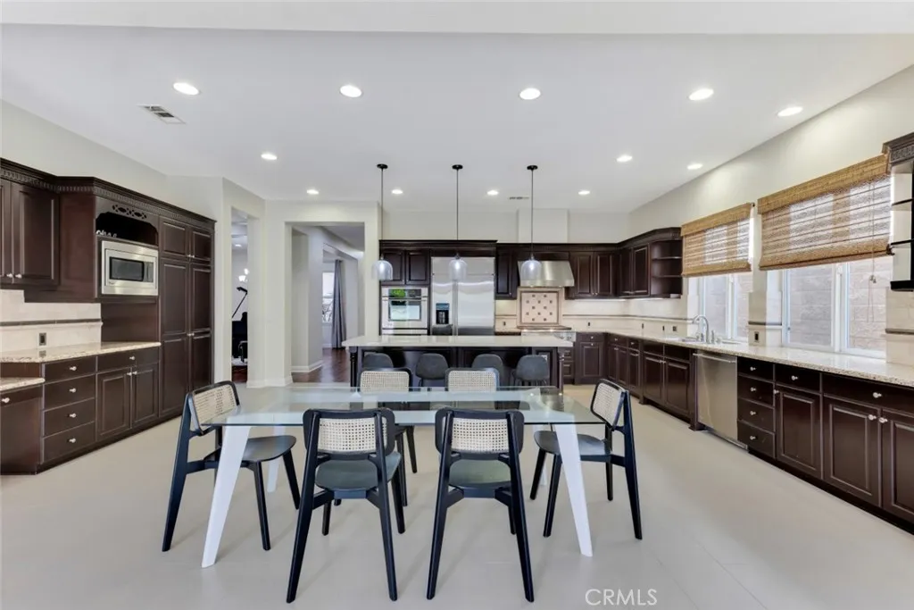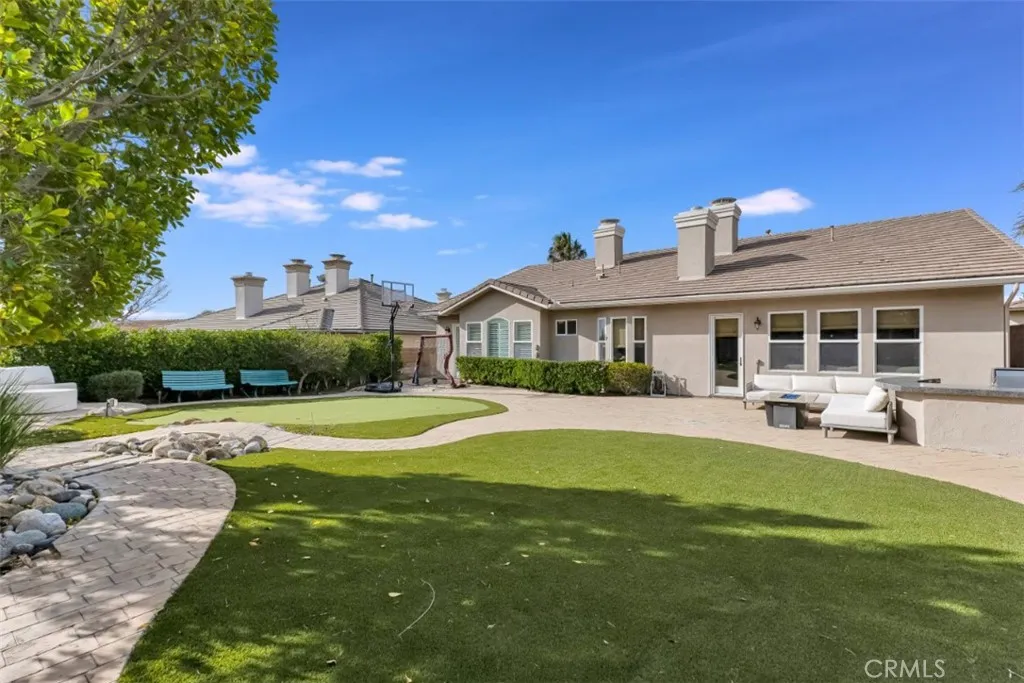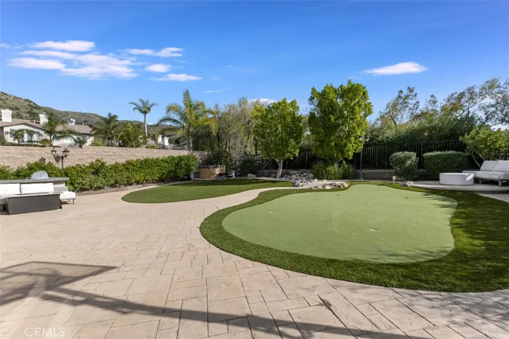 Located within the boundaries of highly rated Porter Ranch schools and set behind the guard gates of the prestigious Renaissance community, this exceptional single-story residence offers an open and airy floorplan enhanced by high ceilings, recessed lighting, abundant natural light, and refined architectural details throughout. The expansive kitchen is thoughtfully designed with generous storage, a large center island with seating and workstation, and a full suite of stainless-steel appliances including a double oven, 6-burner gas range, dishwasher, trash compactor, wine refrigerator, and microwave. The inviting family room features built-in shelving, large windows, and direct access to the backyard, with formal living room, and formal dining room provide flowing spaces for entertaining. The home offers 4 spacious en-suite bedrooms, including a massive primary suite with double-door entry, walk-in closet, and a spa-inspired bath with dual vanities, soaking tub, and glass-enclosed shower, complemented by a separate powder room for guests. A dedicated laundry room with extra storage and a 3-car attached garage with direct access enhance everyday functionality. The backyard is designed for both relaxation and recreation, featuring a built-in BBQ and gorgeous hardscape meandering between a spacious faux lawn with hot tub area and a custom putting green with raised seating area, all highlighted by lush mature landscaping and surrounded by stunning mountain views. The Renaissance community is known for its 24-hour guard-gated security, beautifully maintained grounds, and communit