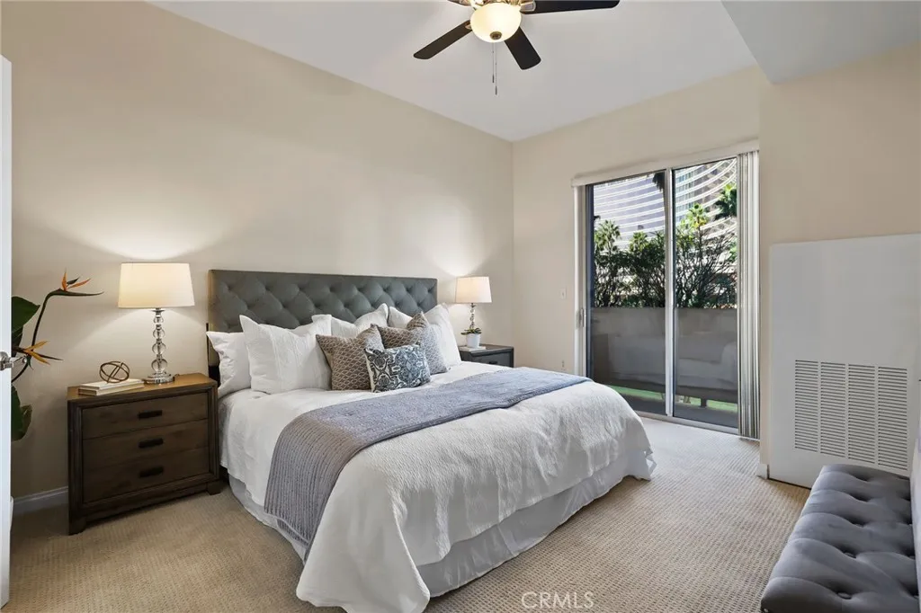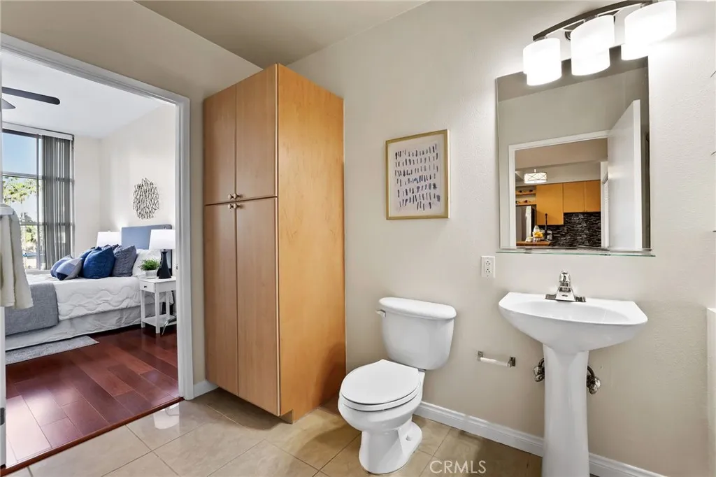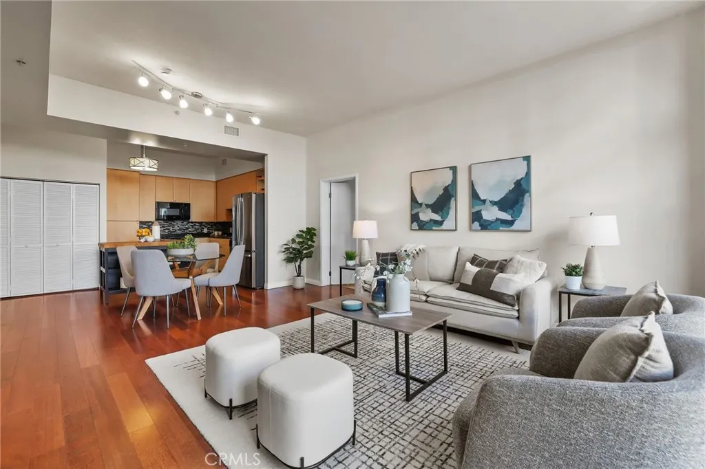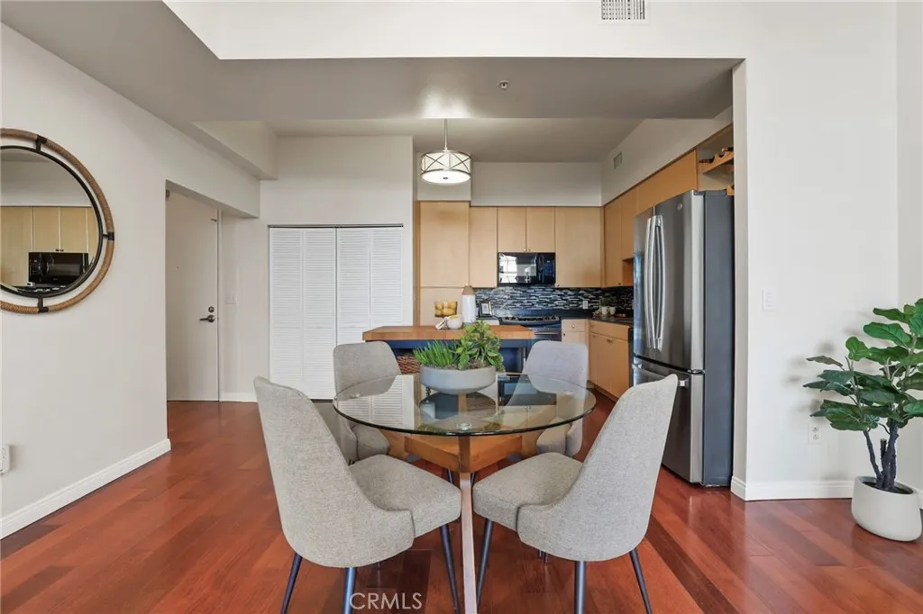 Welcome to Aqua, one of Downtown Long Beachs most sought-after luxury high-rise communitieswhere beach proximity meets vibrant city living. Perfectly designed for those who crave both style and convenience, this corner unit 1,120 sq ft, 2-bedroom home, each with en suite baths, offers a smart split-wing layout ideal for privacy. Soaring 10-foot ceilings and floor-to-ceiling windows flood the home with natural light, framing dynamic city views and creating an airy, loft-like feel. The expansive living room features a built-in entertainment center and your front-row seat to city lights and the greenbelt view. The stylish kitchen opens to the main living room and dining area, making it perfect for gathering friends and family. It's sleek and functional design features stainless steel appliances, an adjacent Laundry Closet and ample storage. A full size washer and dryer, plus stainless steel fridge are staying for the new owner. Upgraded wood flooring throughout the main living areas and secondary bedroom add warmth and sophistication. Retreat to two primary suites. One with a large custom organized walk-in closet and balcony, both bedrooms offering en-suite bathrooms featuring a soaking tub and shower. The bedrooms are thoughtfully positioned in separate wings, for comfort and privacy. As a corner unit with only one shared wall, the home feels secluded and exclusive. Aqua residents enjoy resort-style amenities, including a pool and spa, sauna, fitness center, BBQ area, club room with business centers, 24/7 concierge and security, and gate secured underground parking. Two dedic