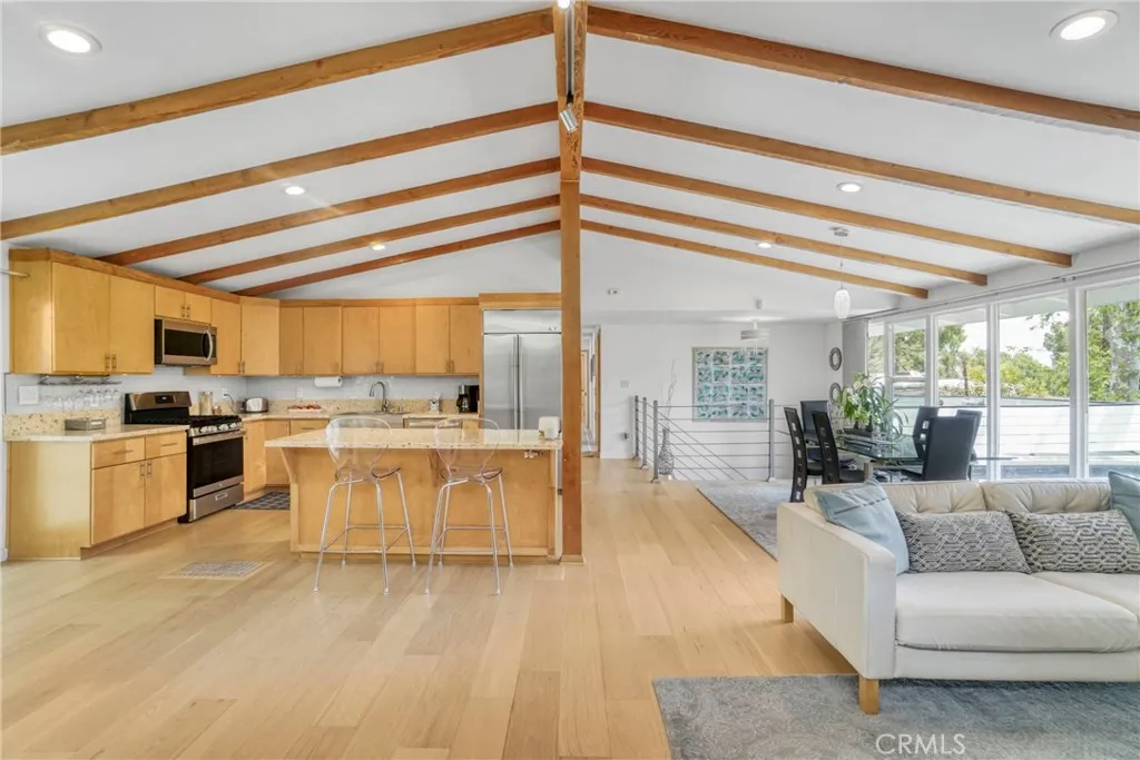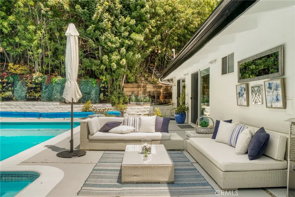 This exquisite mid-century contemporary home with fantastic curb appeal is nestled on a secluded hillside in a coveted Sherman Oaks neighborhood. Ideally located South of Ventura Blvd., this property offers close proximity to top-rated schools, premier dining/shopping, and easy freeway access. It features 4 bedrooms & 4 bathrooms (3 en suite), and 2,597 sq. ft. of thoughtfully designed living space on a 7,988-sf. lot that perfectly blends privacy, comfort, and style. Lush, mature landscaping surrounds the home, highlighted by an inviting heated swimming pool and a covered outdoor dining/BBQ areaideal for enjoying the quintessential Southern California lifestyle year-round. Recently updated, the home showcases new hardwood floors, fresh interior/exterior paint, recessed lighting throughout, solid oak-veneer doors, and abundant built-in storage. The open-concept floor plan features high ceilings with exposed wood beams, floor-to-ceiling windows, and seamless indoor-outdoor flow. The living room is a true showpiece, featuring custom built-in cabinetry with a wine rack and a stunning fireplace as the focal pointperfect for both entertaining and everyday living. Some furniture may be included, offering added value and convenience. The beautiful kitchen is equipped with a stainless-steel built-in GE Monogram refrigerator, quartz countertops, a stainless-steel farmhouse sink, a generous island with ample storage, and brand-new GE gas stove and dishwasher. One of the homes standout features is a custom-built recording studio, constructed with QuietRock drywall for superior soundpro