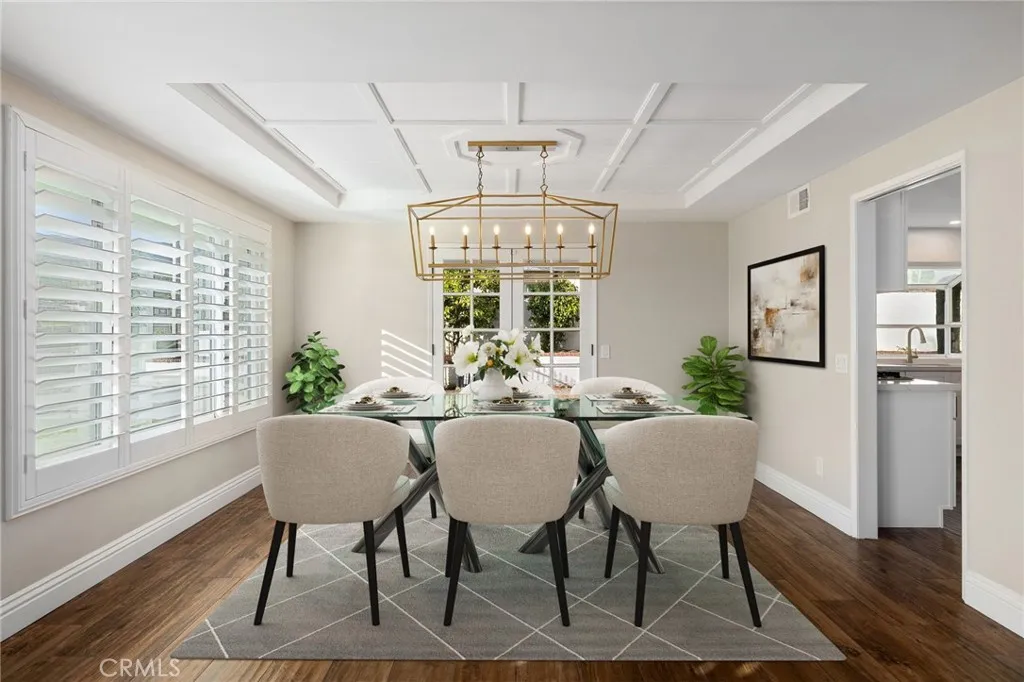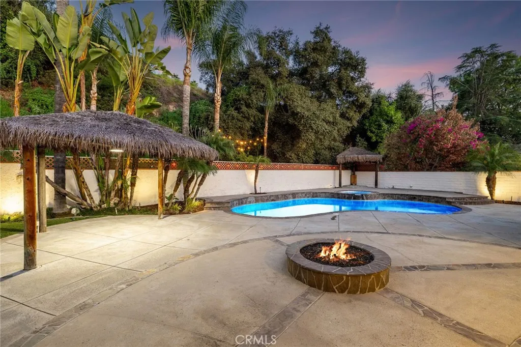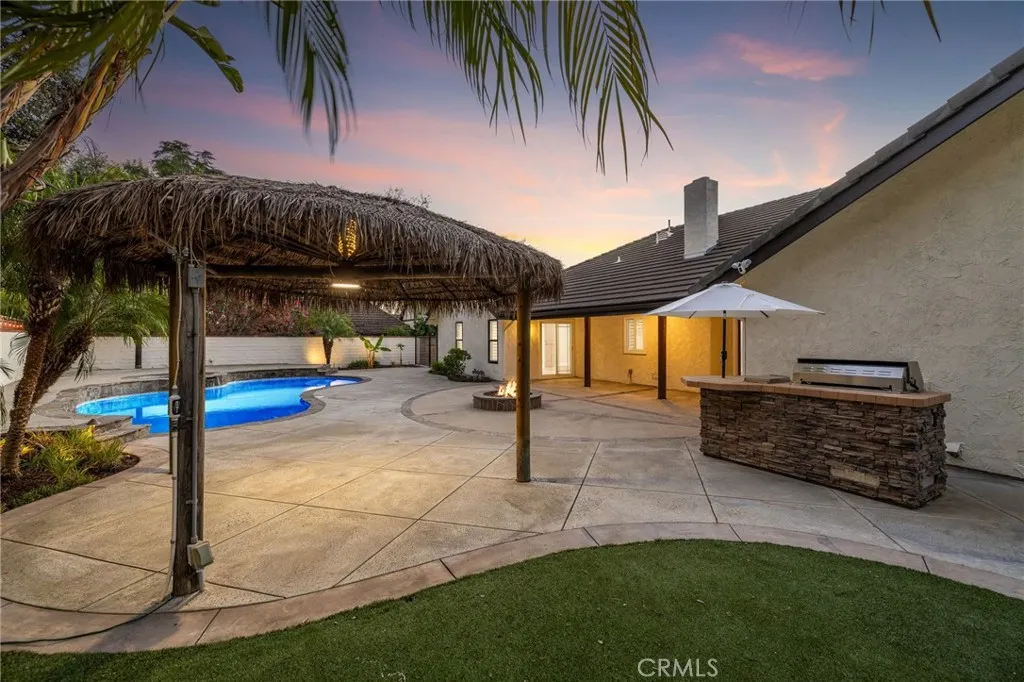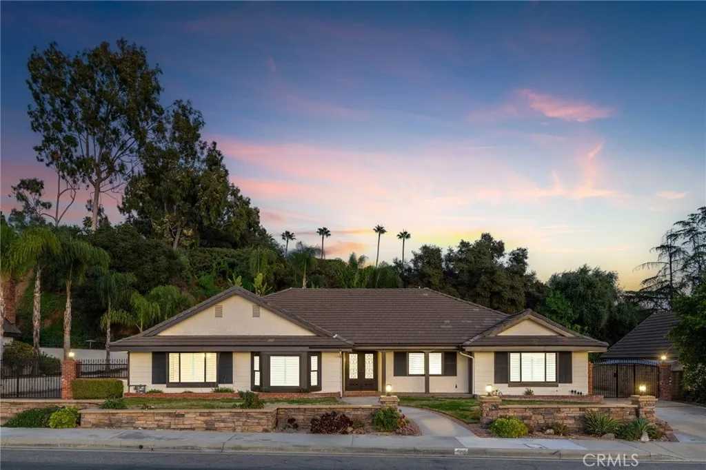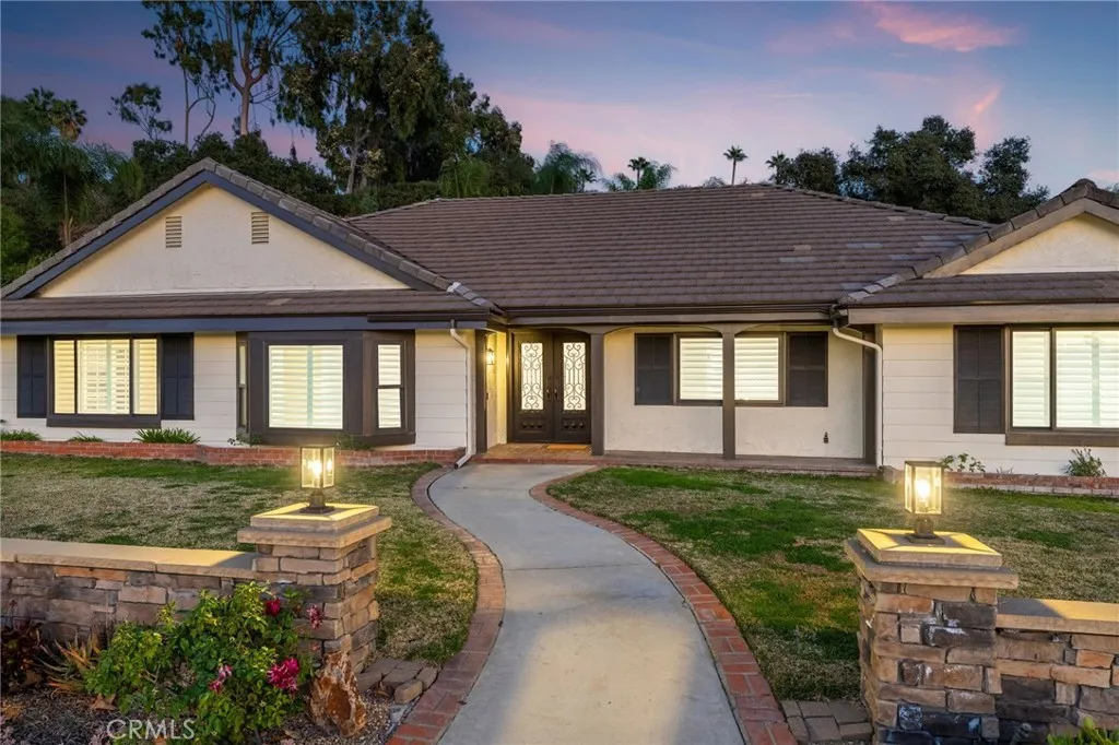 Set against a lush hillside backdrop, this single-story residence offers privacy, scale, and resort-style living. A gated driveway and separate gated RV parking are complemented by stacked-stone planters, brick-accented walkways, and curated landscaping with subtle lighting, creating a composed and welcoming arrival. The front porch introduces brick flooring and architectural lighting, opening through elegant iron-accented double doors into a thoughtfully designed interior. The foyer features herringbone tile, exposed beam detailing, and recessed lighting, with clean sightlines into the homes primary living spaces. The living room is anchored by a bay window with plantation shutters overlooking the front yard, while the formal dining room is defined by French doors, a coffered ceiling, and a statement chandelier. The kitchen has been reimagined with white shaker cabinetry, quartz countertops, custom tile backsplash, brushed brass hardware, and designer pendant lighting. Stainless steel appliances include a gas cooktop with vent hood, a built-in oven and microwave, and a full-size refrigerator, with a peninsula providing casual seating. The family room offers vaulted beam ceilings, recessed lighting, and a stacked-stone fireplace with raised hearth. French doors open to the backyard, creating a seamless indoor-outdoor connection, with plantation shutters adding architectural continuity and privacy. The primary suite features plantation-shuttered windows, a slider with direct access to the rear patio, a walk-in closet, and a sliding barn door leading to the ensuite bath. The