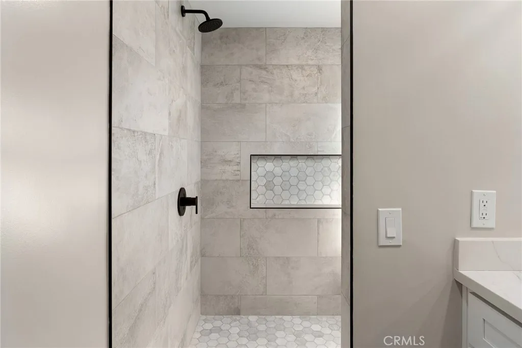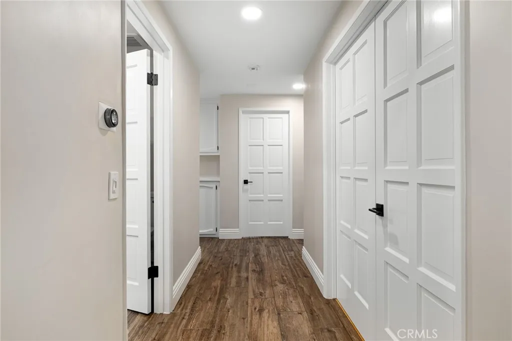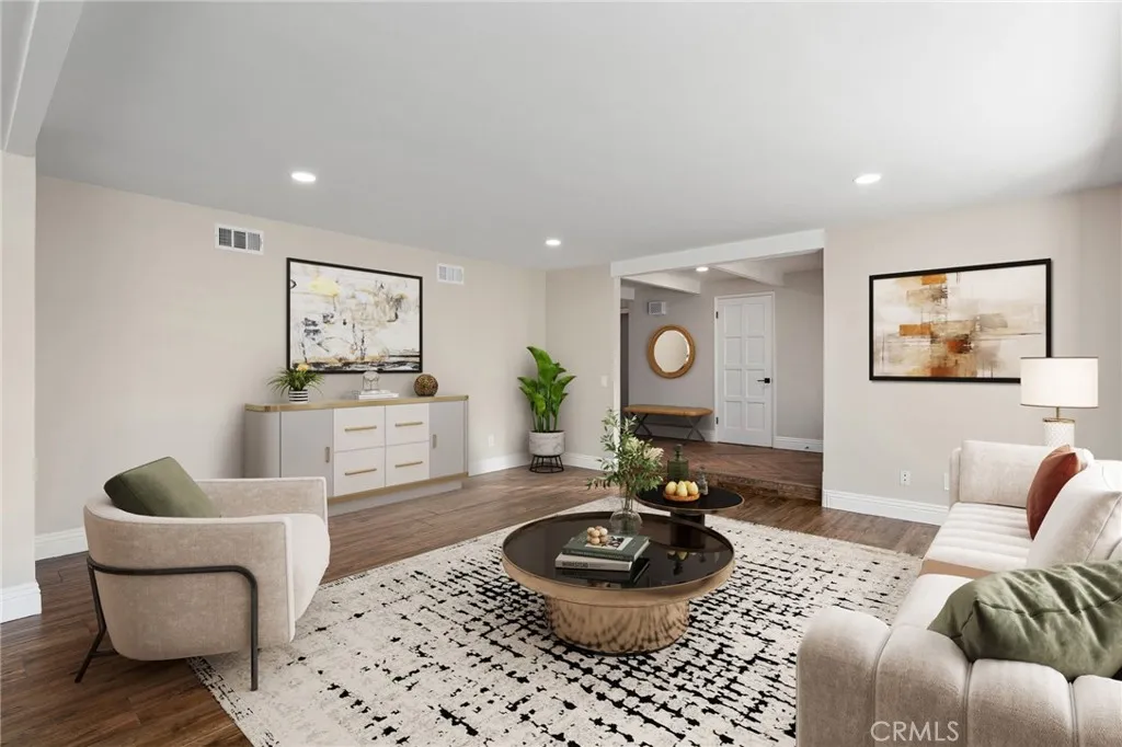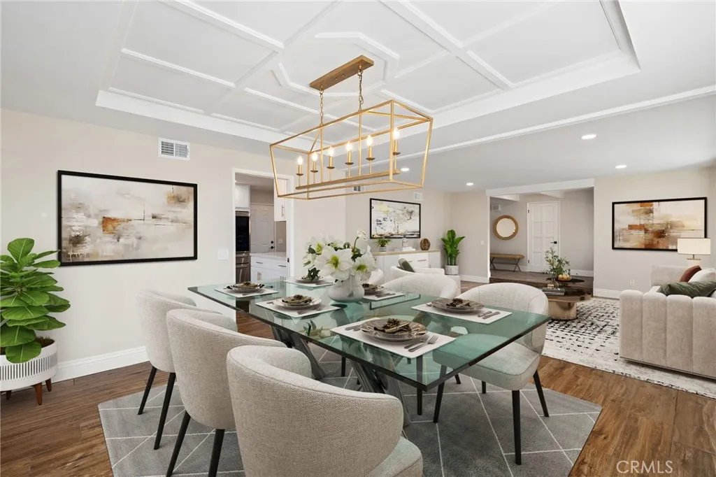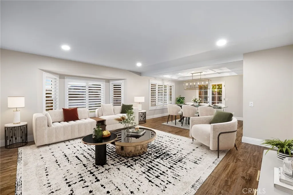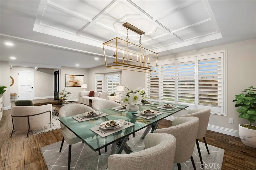 Set against a lush hillside backdrop, this single-story residence offers privacy, scale, and resort-style living. A gated driveway and separate gated RV parking are complemented by stacked-stone planters, brick-accented walkways, and curated landscaping with subtle lighting, creating a composed and welcoming arrival. The front porch introduces brick flooring and architectural lighting, opening through elegant iron-accented double doors into a thoughtfully designed interior. The foyer features herringbone tile, exposed beam detailing, and recessed lighting, with clean sightlines into the homes primary living spaces. The living room is anchored by a bay window with plantation shutters overlooking the front yard, while the formal dining room is defined by French doors, a coffered ceiling, and a statement chandelier. The kitchen has been reimagined with white shaker cabinetry, quartz countertops, custom tile backsplash, brushed brass hardware, and designer pendant lighting. Stainless steel appliances include a gas cooktop with vent hood, a built-in oven and microwave, and a full-size refrigerator, with a peninsula providing casual seating. The family room offers vaulted beam ceilings, recessed lighting, and a stacked-stone fireplace with raised hearth. French doors open to the backyard, creating a seamless indoor-outdoor connection, with plantation shutters adding architectural continuity and privacy. The primary suite features plantation-shuttered windows, a slider with direct access to the rear patio, a walk-in closet, and a sliding barn door leading to the ensuite bath. The