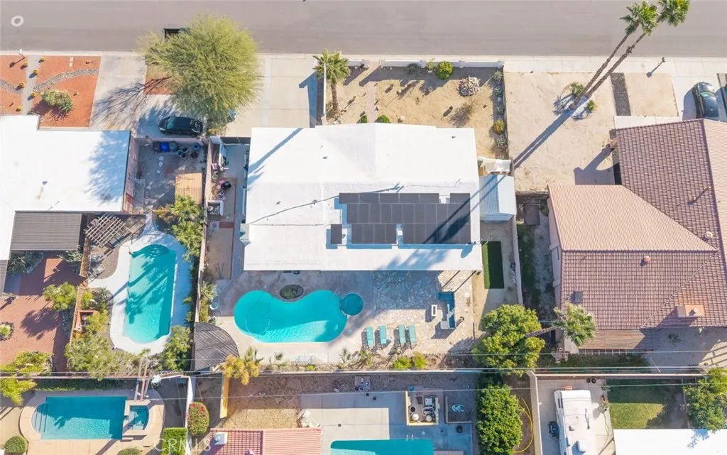 Welcome home to this spacious four-bedroom desert modern ranch, originally built in 1978 and thoughtfully improved for todays living. This one-of-a-kind single story is perfect for a family who loves to entertain and build memories! The home offers both privacy, comfort and even RV parking! Enter through double doors into an open floor plan where the living and dining areas connect easily to a large kitchen with plenty of cabinet and counter space. The nearby family/game room includes a gas fireplace, bar area, and convenient access to the laundry room and oversized two-car garage with overhead storage. Sliding glass doors from the living room and game room offer easy access to the backyard. The flagstone patio was carefully installed stone by stone and includes covered areas, making it easy to enjoy year-round. The pool and spa are just steps from the house, along with a natural-gas BBQ island and firepit perfect from family entertainment. Additional features include owned solar installed in 2023, no HOA, and a .23-acre fee simple lot where you own the land. Located in the Gene Autry neighborhood, this home is close to downtown Palm Springs and offers easy access to main roads and the I-10 freeway.