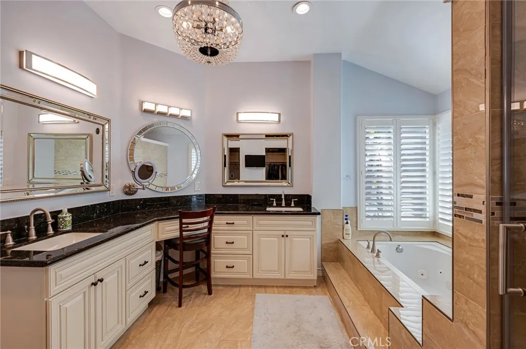 Luxuriously upgraded home in the prestigious master-planned community of The Collection at Sorrento built by Fieldstone Homes. This approximately 3,614 sq. ft. floorplan has 4 bedrooms in total (1 bedroom downstairs and 3 bedrooms upstairs), 4.5 bathrooms, plus a large upstairs den that could be converted to a 5th bedroom by adding a closet. Interior upgrades include new double-pane windows throughout, tile and solid-plank oak flooring throughout, custom built-in cabinets throughout, light fixtures including chandeliers, wall sconces, recessed lighting, plantation shutters, curtain rods and curtains, accordian window shades, black galaxy granite kitchen countertops, metallic tile backsplashes, stainless steel kitchen appliances (trash compacter, dishwasher, range/microwave, minibar fridge), tankless water heater, water softener, inside laundry room with washer and dryer included, upgraded closet interiors, tile garage floor, tons of garage storage cabinets, and a massive attic for additional storage. Oversized 3-car garage includes a workshop area and Tesla EV charger. The master bedroom suite includes a huge office area with built-in cabinets and desk, double-sided fireplace, solid-plank oak flooring, custom master bath cabinets with vanity, black galaxy granite countertops, oversized tub with spa features, pebble-lined shower pan, and large walk-in closet. Outdoor upgrades include an outdoor tiled and covered entertainment area with recessed lighting, stool-height bar counter, travertine countertops, stainless steel kitchen and BBQ, wet bar, television, pebble-lined swimm