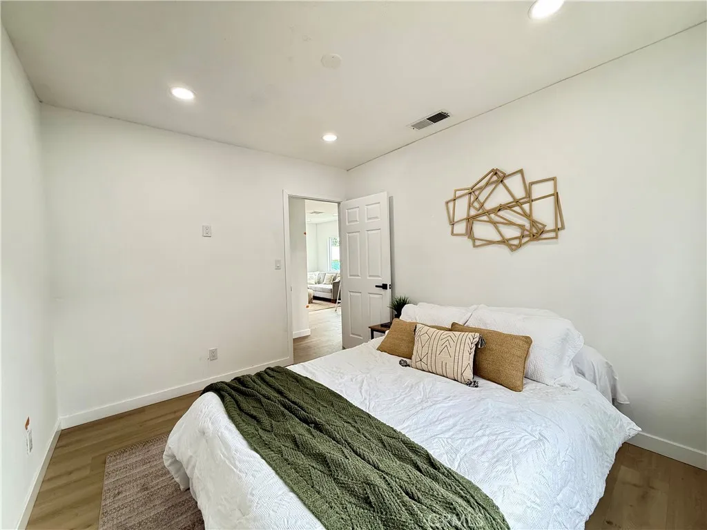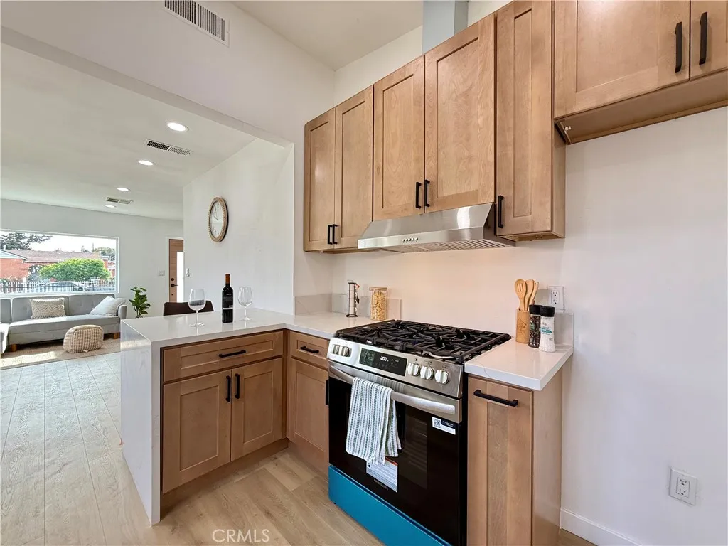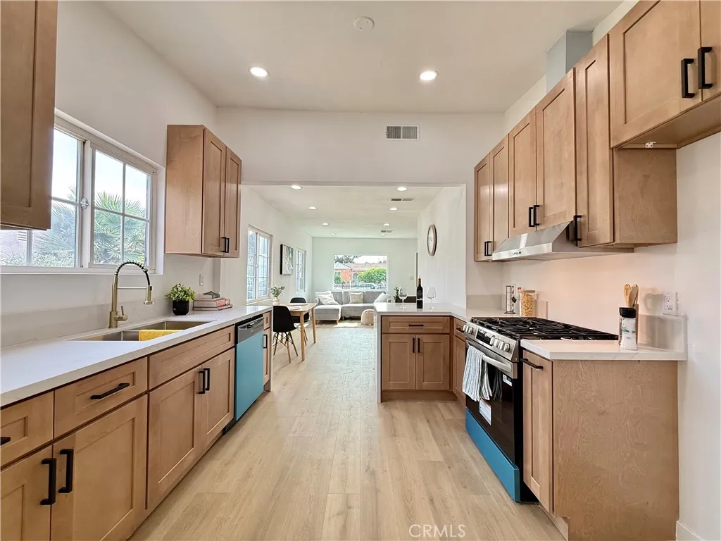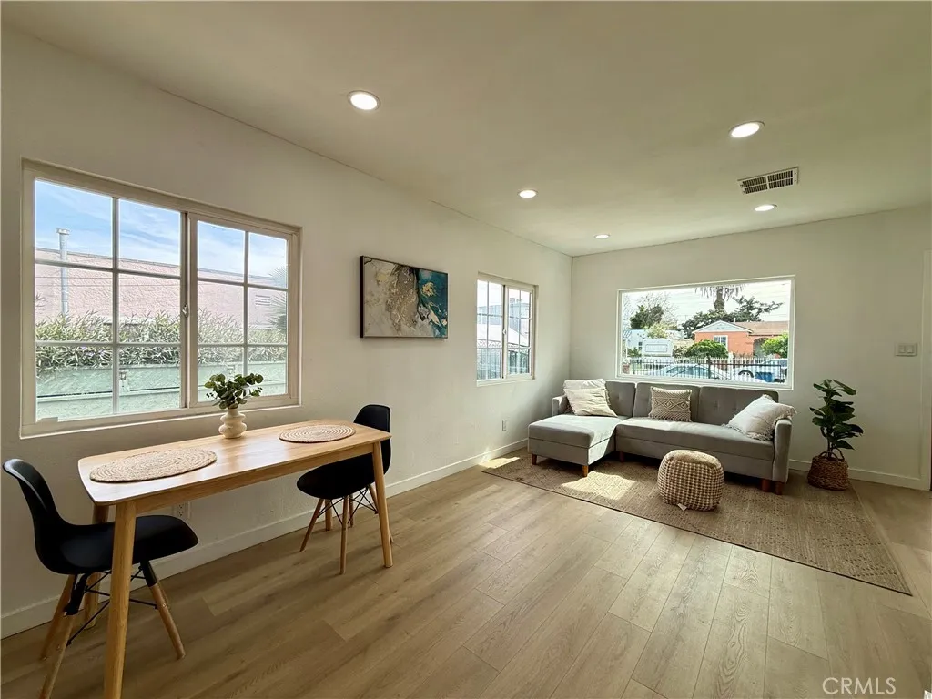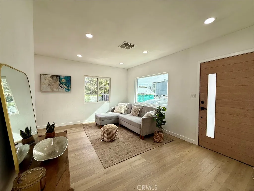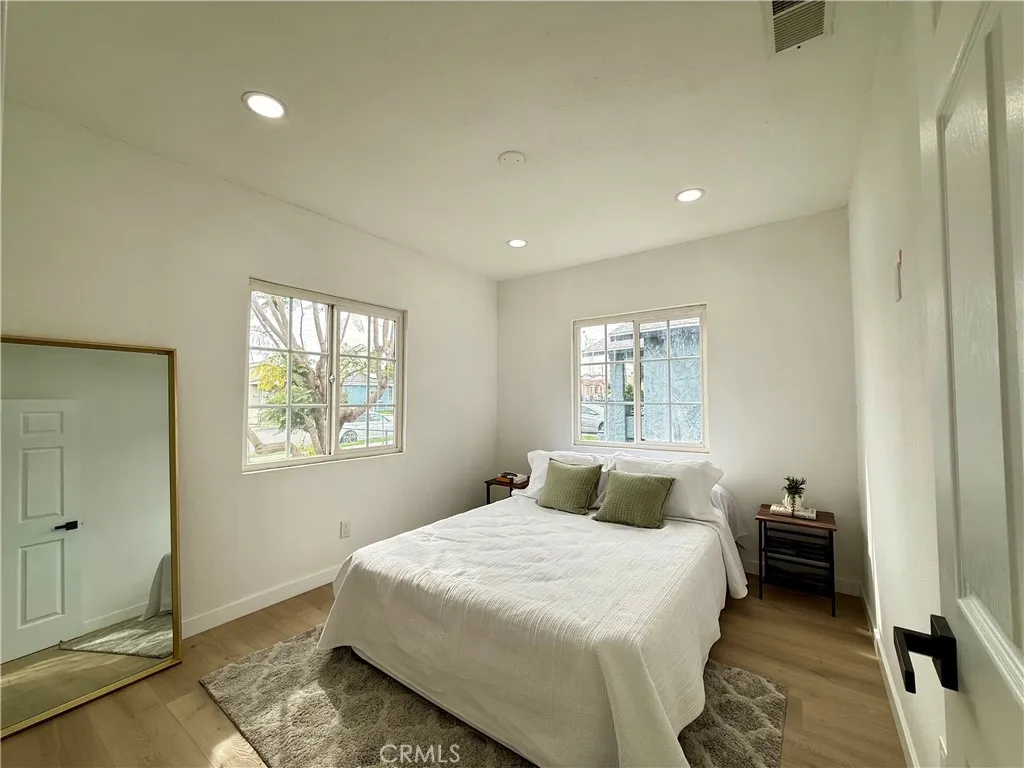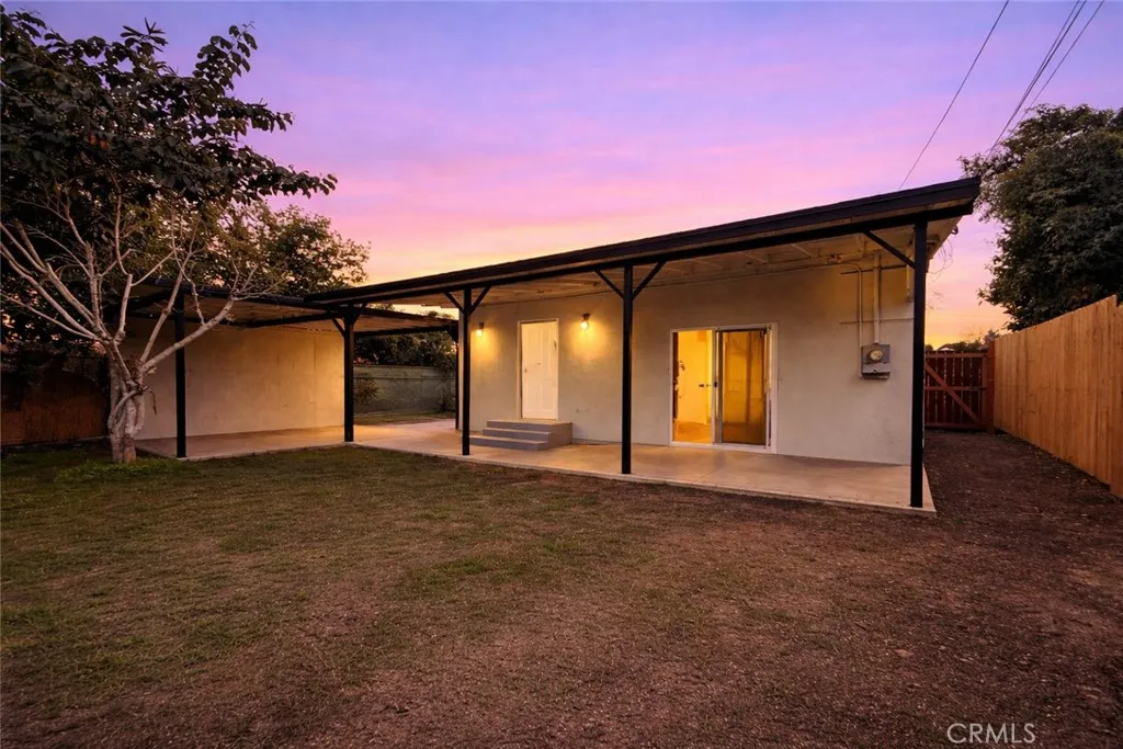 Welcome to this fully renovated 3-bedroom, 2-bathroom California bungalow offering a 6,505 sq ft lot size and a 1,032 sq ft of beautifully designed living space on a generous lot with a very large backyard. Thoughtfully reimagined from top to bottom, this home blends timeless character with modern luxury for a true turn-key opportunity. Step inside to an open-concept layout highlighted by a spacious living room with a large picture window, high ceilings in the kitchen and primary suite, both with outside access and seamless indoor-outdoor flow. The kitchen features quartz countertops with connecting waterfall edges, a stylish peninsula, soft-close oak cabinetry, modern finishes with black and gold accents, a double sink, and a brand-new stainless steel oven with hood and dishwasher included. The primary suite offers a walk-in shower, floating double vanity, and striking tilework, while the secondary bathroom features a shower with tub, matching tile design, and a floating double vanityboth bathrooms finished with elegant gold accents throughout. Major upgrades include new roof, windows, doors, flooring, lighting, cabinets, countertops, bathrooms, kitchen, fencing, and central A/C and heat, providing peace of mind and long-term value. The home also offers private parking with a carport and a spacious driveway accommodating multiple vehicles. The expansive backyard is ideal for entertaining, future expansion, or additional living space, featuring clean landscaping, a beautiful wood privacy fence, and a large covered overhang area perfect for outdoor gatherings. Zoned R-2, the