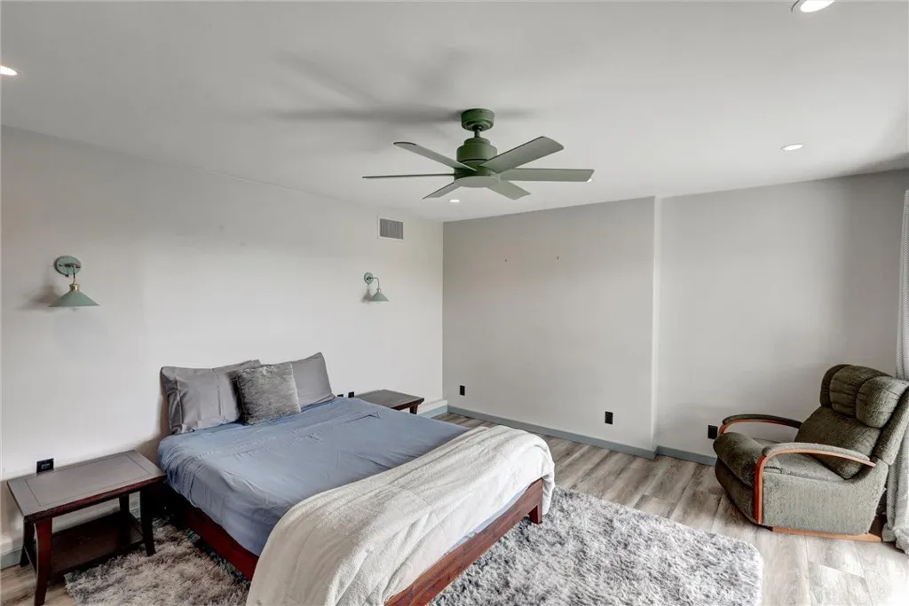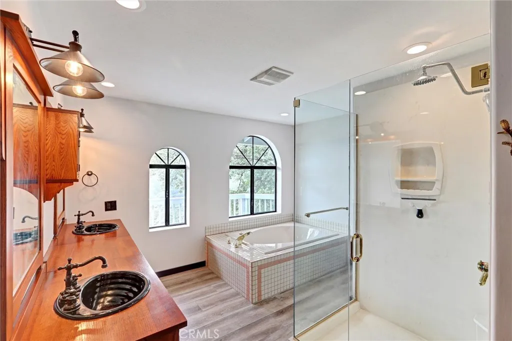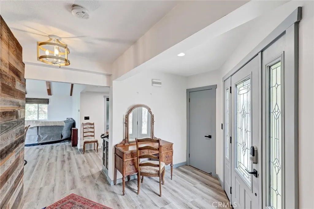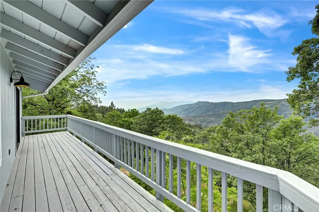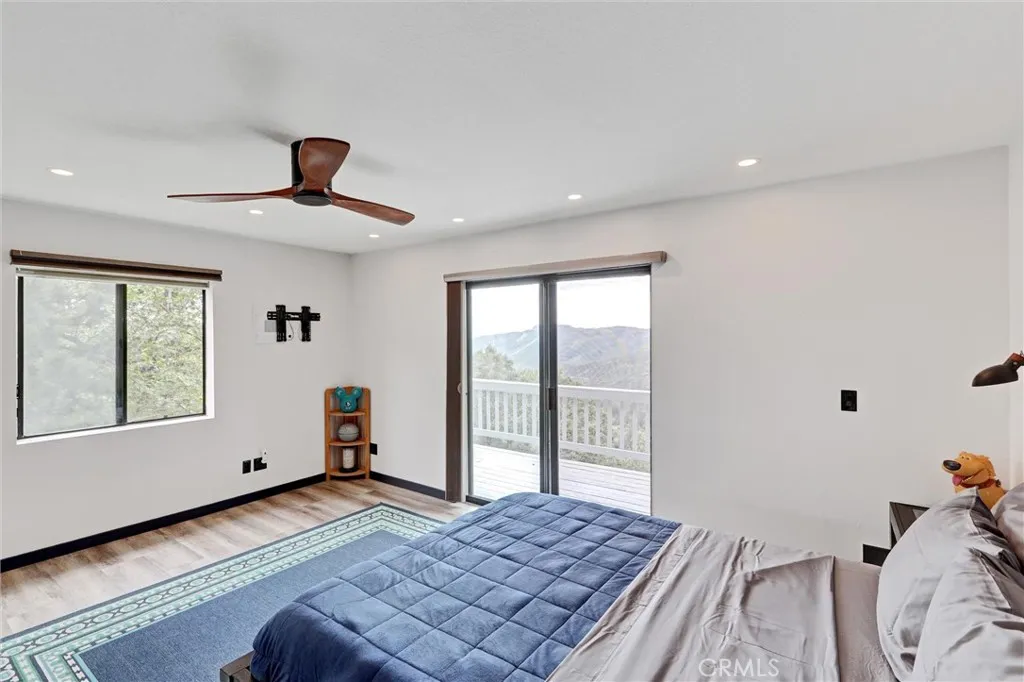 Enjoy breathtaking panoramic views of the San Bernardino Mountains, Mt. Baldy, and twinkling city lights from this exceptional mountain retreat. The inviting foyer opens to two spacious living areas. The open-concept kitchen features Corian countertops and flows into a vaulted living and dining space with a cozy wood-burning fireplace insert. Sliding glass doors lead to the upper deck, perfectly positioned to capture the stunning vistas. Nearby, a hallway connects to a three-quarter bath, laundry room, and a well-sized bedroom. On the opposite side of the entry, a second living room with its own fireplace provides a comfortable retreat. The primary master bedroom suite offers direct deck access, a spacious walk-in closet, and an en-suite bath with dual sinks, soaking tub, creating a peaceful sanctuary with unforgettable views. The lower level includes a versatile den or office and a third bedroom, both opening to a private lower deck ideal for relaxing or entertaining. Situated on over an acre and backing to National Forest land, the property features a fenced yard, apple tree, and frequent visits from local wildlife. The home offers an ample parking for up to seven vehicles; the property also features a detached two-car garage and EV charging outlet for modern convenience. The home also features luxury flooring plank, band new insulation, recessed lighting, switches, and outlets, tankless water heater, whole-house water filtration system, dual-zone HVAC with air conditioning. Conveniently located less than 10 miles from Snow Valley Ski Resort with easy access to Highway 33