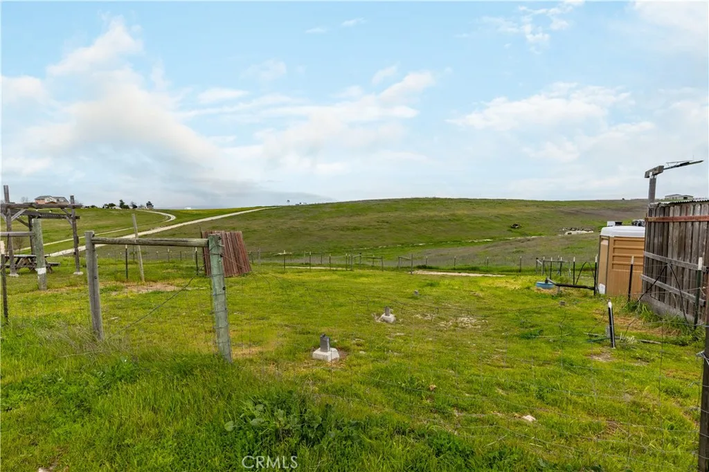 Experience hilltop living on this fully usable, cross-fenced 12.5-acre property offering sweeping views of Green Mountain and the surrounding valley. Ideally located just a 25 minute drive to downtown Paso Robles and Atascadero, this property combines privacy, functionality, and convenience. The 3-bedroom, 2-bath home (1,644 sq ft) features an open-concept layout connecting the kitchen, dining, and living areas, with a front deck perfectly positioned to capture sunsets and scenic countryside views. Recent improvements include a newer roof, dual-pane windows, central air, split A/C units, and energy-efficient solar. Designed for rural living, the property includes irrigation throughout, mature fruit trees, raised garden beds, a large chicken coop, and a newer submersible well pump. Infrastructure is already in place with two RV sites offering electrical service (separate meters), separate septic tanks, and water hookupsideal for guests, extended family, or potential income use. Additional features include a detached one-car garage, a spacious three-bay workshop, and a dedicated laundry/storage area. Unique A-frame structures provide additional flexible space for guest accommodations or creative use, and two storage containers (18 and 22 in length). A rare opportunity to own a fully usable acreage property with views, infrastructure, and versatility in the Paso Robles area.