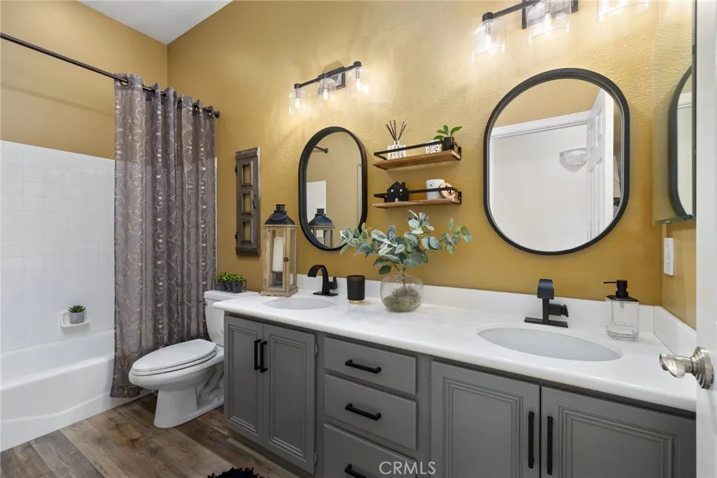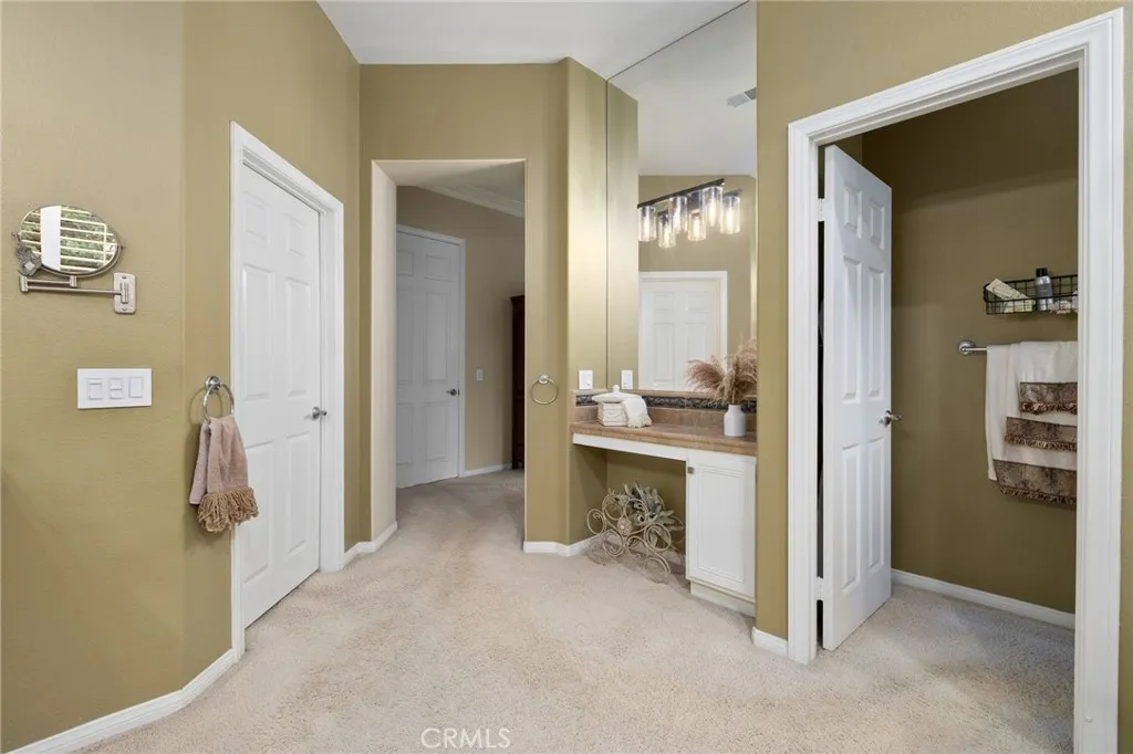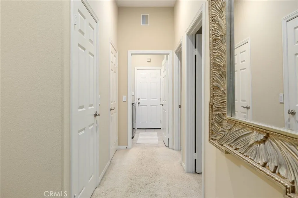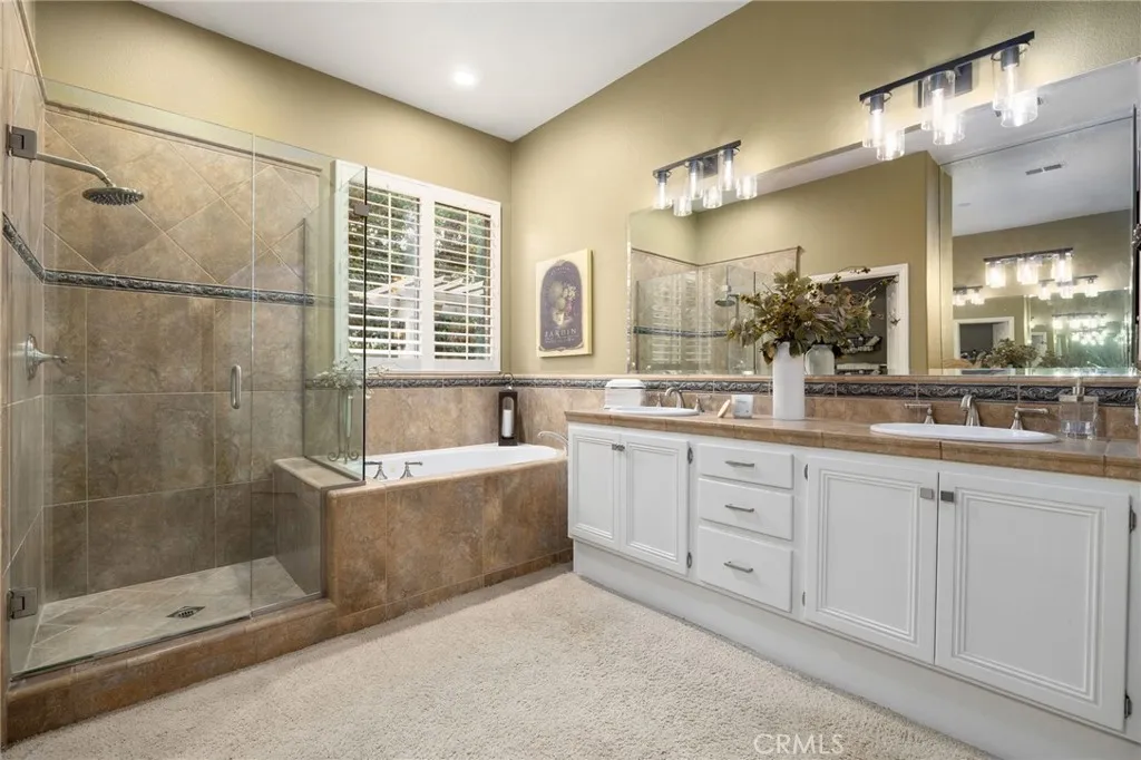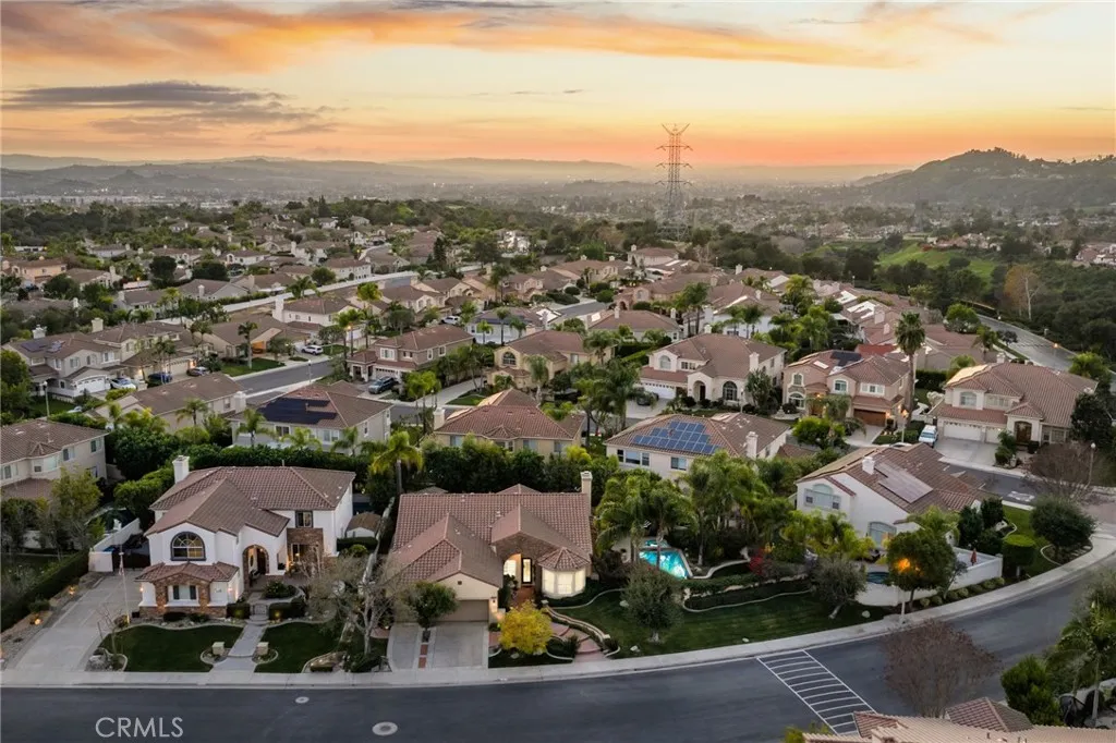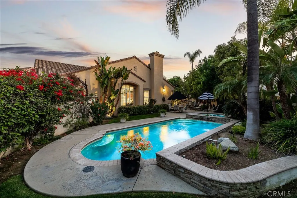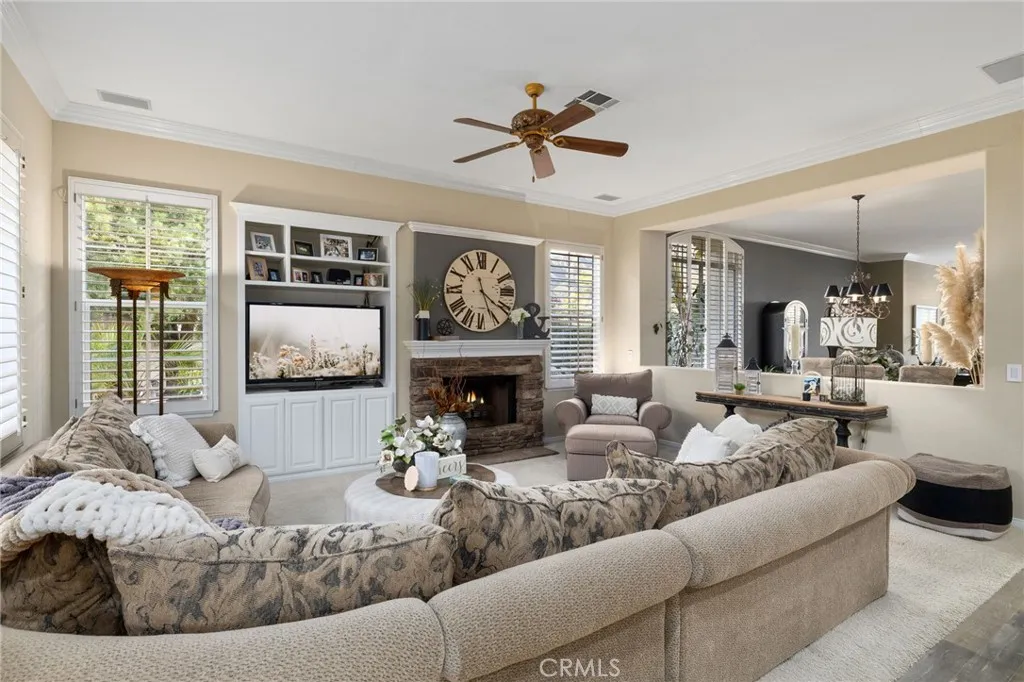 A refined single-story residence offering timeless architecture, privacy, and resort-style outdoor living, introduced by a striking stone-arched entry. Set within the gated La Verne Heights community, the home is approached by a brick-lined walkway and manicured landscaping, creating a warm and architectural first impression. Inside, the entry opens seamlessly into the main living spaces, where abundant natural light, plantation shutters, and crown molding establish an inviting, refined tone. The living room overlooks the front yard with mountain views through a bay window and flows effortlessly into the adjacent dining area. Just off the entry, a private office or optional fourth bedroom with double doors offers flexible use. The kitchen opens directly to the family room, forming a natural gathering space and featuring rich wood cabinetry, a spanning island with bar seating, Thermador stainless steel appliances, and a pantry. An open breakfast nook with sliding glass doors extends the living space outdoors, reinforcing the homes effortless indooroutdoor connection. The family room is anchored by a stone fireplace with custom built-in cabinetry and media center, complemented by crown molding, plantation shutters, built-in surround speakers, and abundant natural light through a wall of shuttered windows. The primary suite is a serene, retreat-like space designed for comfort and privacy. Generously sized, it features plush carpeting, crown molding, a ceiling fan, and shuttered windows that fill the room with soft natural light. A cozy fireplace adds warmth and character, whil