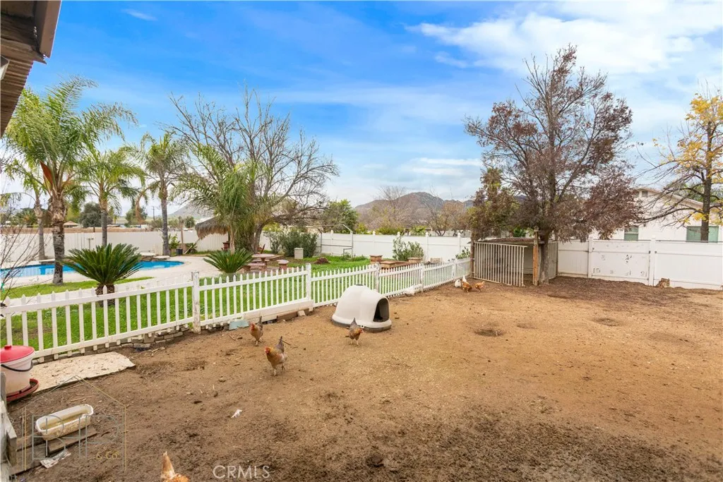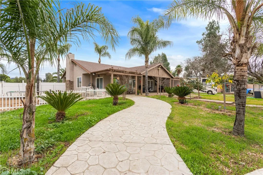 Exceptional single-story ranch-style home on nearly one acre in desirable Nuevo! This 3-bed, 2-bath residence offers 1,502 sq ft of thoughtfully designed living space with vaulted ceilings, abundant natural light, and a layout perfect for both everyday living and entertaining. Situated on a private, level lot, this property combines country charm with modern comfort. Step inside to discover a welcoming family room anchored by a cozy fireplace, seamlessly flowing to the kitchen with granite counters, recessed lighting. The homes single-level floor plan ensures ease of living and accessibility throughout. Outdoors is an ENTERTAINER'S DREAM: enjoy your private in-ground pool and spa, vast covered patio and palapa shade, mature landscaping with queen palms, a built-in fire pit and cement table ideal for alfresco dining or relaxing with friends and family. An oversized 3-car garage plus abundant RV parking with hookups delivers plenty of space for vehicles, toys, and storage. This property also offers picturesque views of rolling hills and mountains spectacular at sunrise and sunset. Located minutes from Lake Perris, Perris Auto Speedway, DropZone Waterpark, and world-class wineries in Temeculas Wine Country, this home offers the perfect blend of rural serenity and lifestyle amenities. Dont miss this rare opportunity to own a ranch retreat in a community prized for space, privacy, and quality of life.
