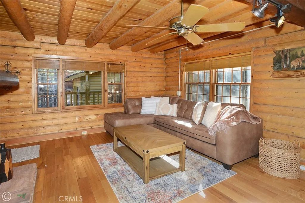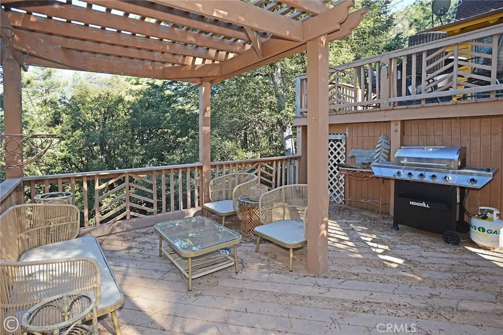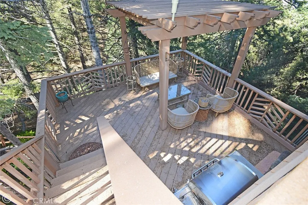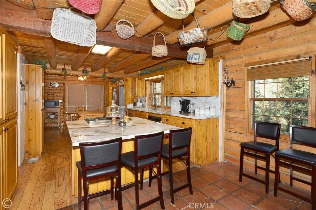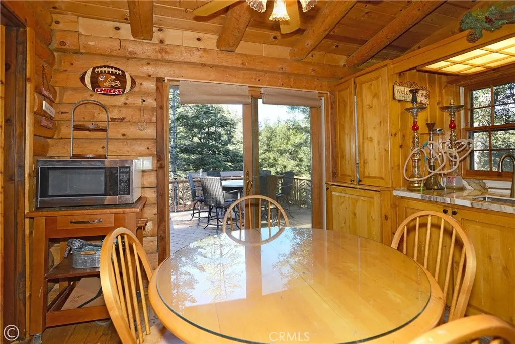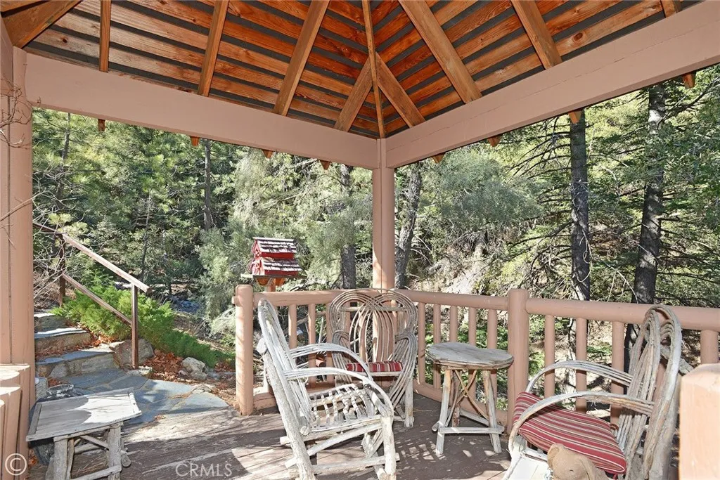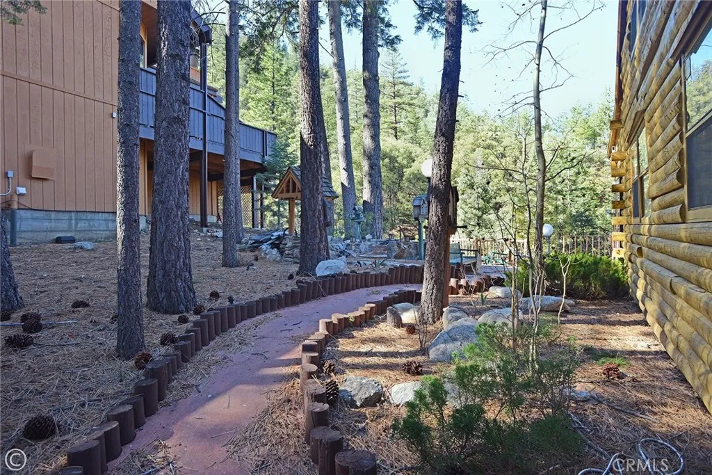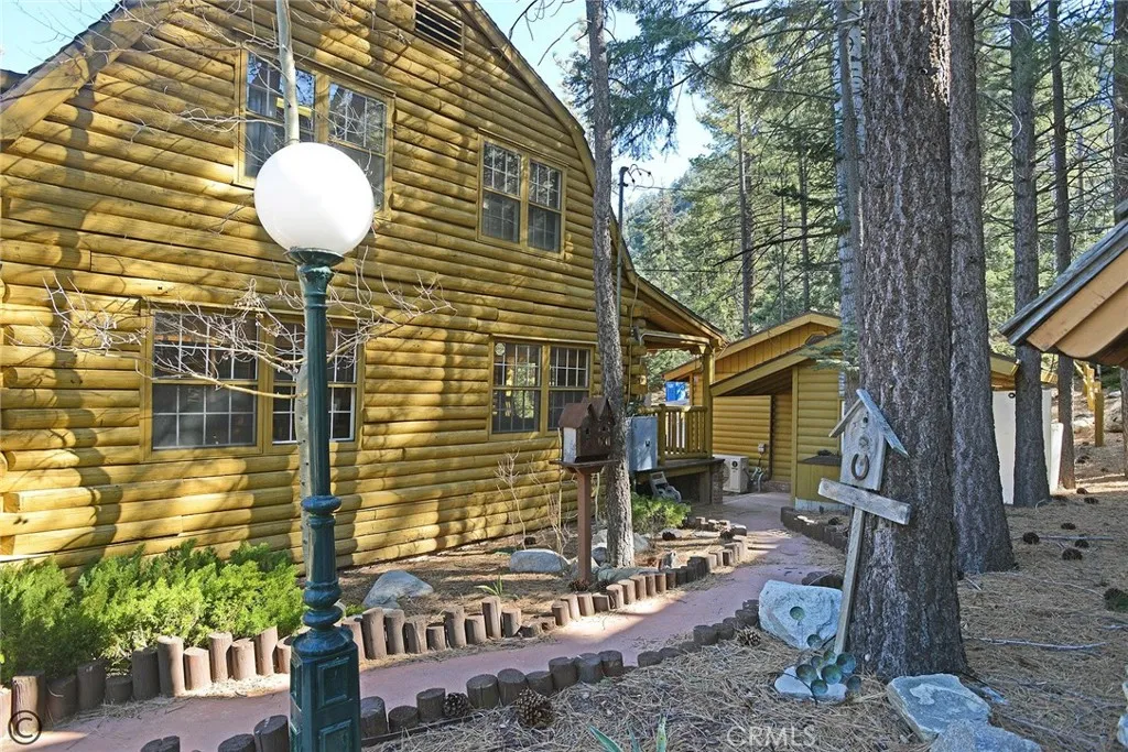 Mountain Living at its best! Enjoy this stunning secluded Log Cabin Style, private gated entry 3 bed, 2 bath retreat family home. Enter an impressive concrete stone driveway in the midst of pine trees and mountain views. Brick stairs and covered porch lead right to front door entrance. Enter an entertainers galley kitchen with extra cabinets, storage, 2 islands with seating, 2 ovens, kitchenet, laundry, wet bar, granite counters, sliding doors open to decks from the kitchen with plenty of space to entertain under the stars or your morning coffee. The main floor also includes the family room with pellet stove during cozy evenings. Ceilings are designed with logs and T&G wood, double pane wood framed windows throughout 2 stories of living. 1 full bath downstairs sandwiched between the kitchen and Living Room. The main living Room invites family and friends to gather around the pellet stove fireplace or the open dining room with a peek a boo wall stepping down into sun room, Spanish tile flooring, wood built in shelving, ceiling fan, a wall of windows with plenty of light offering panoramic views, and wood sliding glass doors leading outside. Step down to professionally landscaped outdoor entertaining areas offering multiple decks, terraced walkways, gazebo, outdoor charcoal pit, perfect for an evening of fresh air and night sky. Oversized single car garage faces properties entrance. Once entered, you are greeted with a wide wood floor staircase leading up to the Master bed, large closet, 2 guest beds, 1 full bath, windows inviting plenty of light throughout the second floor.