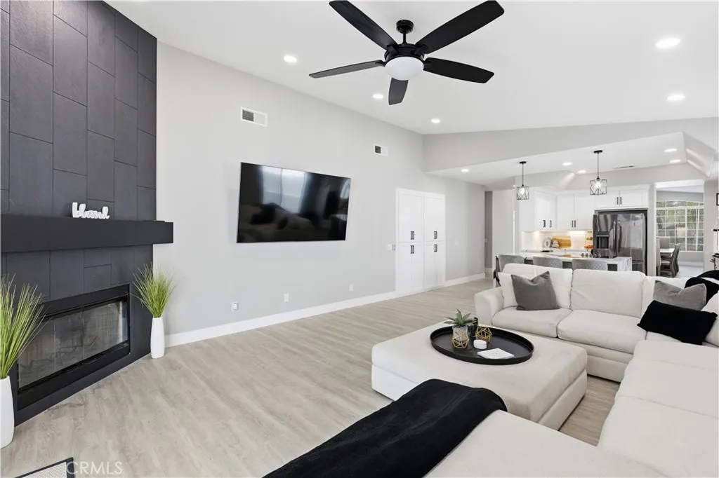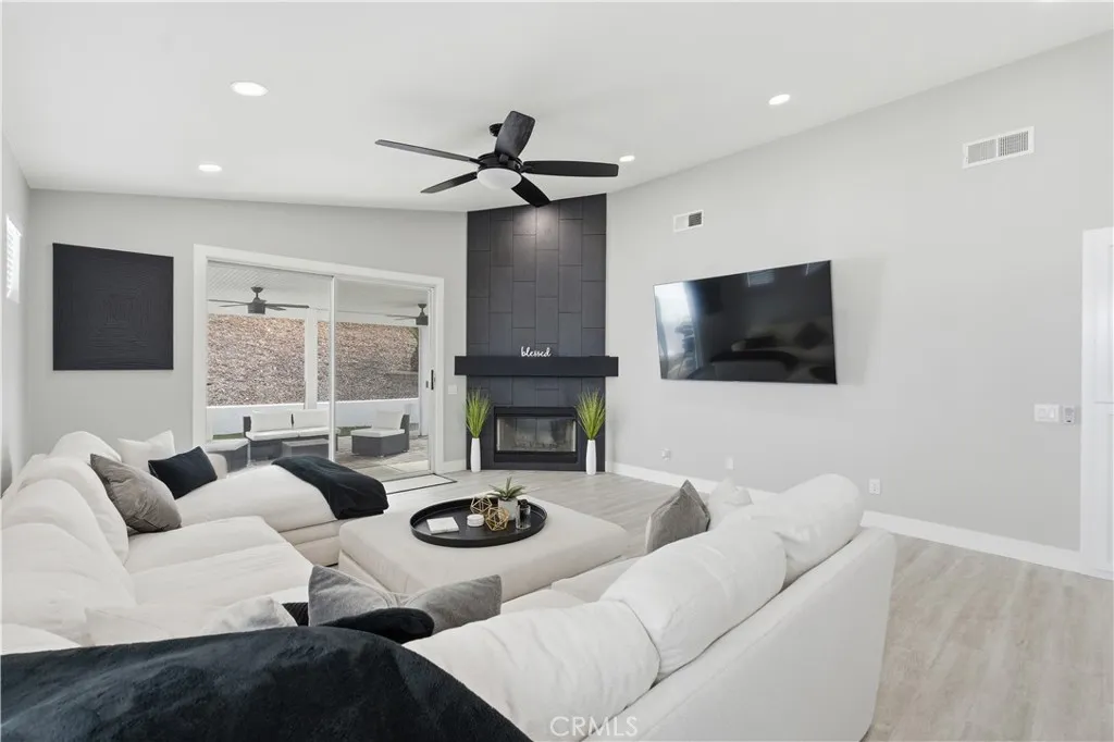 Step inside this tastefully refined, single-story 3-bedroom, 3-bath home and prepare to be impressed by how large and luxuriously it lives. Completely turn-key and fully renovated, this home blends modern design with exceptional functionality. The generous open-concept layout flows seamlessly and is enhanced by high ceilings, luxury vinyl plank flooring throughout, and new LED recessed lighting. The recently updated kitchen features waterfall quartz countertops, recessed exhaust in the island, and a design perfect for entertaining.The oversized primary suite is a true retreat, offering a built-in office space, fireplace, spa-style remodeled bathroom (less than six months old) with oversized shower and soaking tub, and a custom walk-in closet designed to showcase your finest pieces. Generously oversized secondary bedrooms include a junior suite/mini master, ideal for guests or multigenerational living. Additional highlights include modern statement piece fireplaces in both the family room and primary bedroom, an extra-tall 3-car garage that may accommodate lifts, fully PAID solar for near non-existent electric bills, and a Tesla charger. Enjoy water-smart landscaping for low maintenance living. As an added bonus, this home features a 2005 Malibu BOAT included, making it ready for the ultimate lake lifestyle. Located in the highly sought-after 24-hour guard-gated Canyon Lake community, residents enjoy 15 miles of shoreline, boating, skiing, fishing, paddle boarding, beaches, parks, dog park, pump track, equestrian center, Little League fields, SCGA golf course, tennis and pic