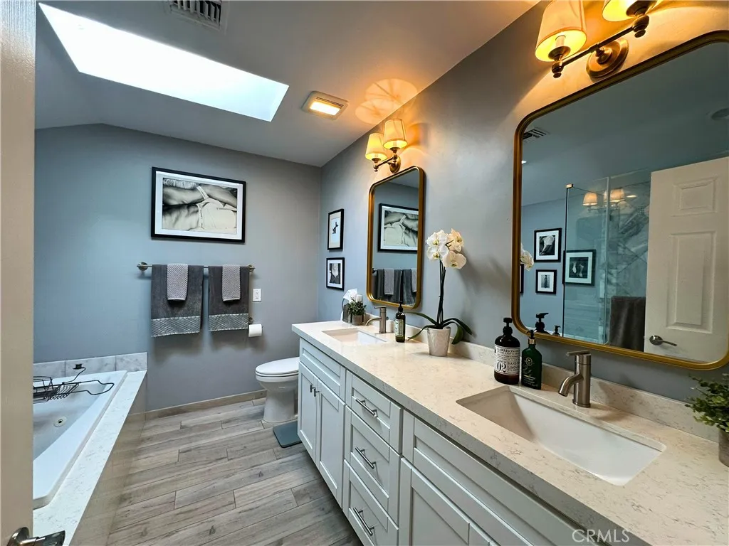 Pristine 3-bed/2-bath traditional home that has been loved & cared for. A light-filled, spacious living room with hardwood floors is open to a fully equipped gourmet kitchen with a stunning center island, stainless steel appliances, and immaculate cabinetry. The formal dining area with a custom tufted banquette, vaulted ceiling, and fireplace creates a cozy ambiance that is sure to impress family and friends. Astonishing primary suite with vaulted ceilings, a personal wood-burning fireplace, a walk-in closet, a bath with a soaking tub, and a separate shower. French doors open to a tranquil, recently re-landscaped backyard featuring a unique handmade outdoor seating area, a fire pit, a newly built covered patio, an outdoor television and entertainment area, and outdoor string lighting that can be controlled remotely via phone & Google/Amazon systems. The home features a smart thermostat, light switches in central living areas that are compatible with Google/Amazon systems, and new exterior landscape lighting in both the front and back yards, which includes remote/phone-controlled access and a timer system. Brand New electrical panels were installed in the residence and in the garage in the last year (with the ability to add solar). A new air conditioning condenser was installed in 2023. The exterior of the property has been newly painted, custom fencing has been installed, access for garbage storage and removal has been added (so your guests will not see it), and the garage has completely redone siding/stucco exterior. Complete perimeter security system with Nest Doorbell an