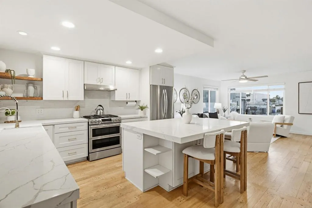 Live at the beach just one block from the sand in the heart of the Ocean Beach neighborhood. This modern coastal end unit captures the essence of relaxed beach living, blending clean contemporary design with warm, natural finishes. Natural wood floors, skylights above the stairwell and primary bath, and an open living concept fill the home with light and flow. The main living area and primary suite both enjoy water views, reinforcing a strong connection to the coast. With an airy atmosphere throughout and only one shared wall, this end-unit residence offers enhanced privacy while maintaining a vibrant, beach-forward energy. The remodeled kitchen serves as the centerpiece of the home, featuring modern finishes and a rare dual-dishwasher perfect for entertaining or effortless daily living. The home offers over 1,300 square feet of living space, two tandem off-street parking spaces, and a Walk Score of 93, placing shops, dining, coffee, and the beach all within easy reach. Ocean Beach Elementary is highly regarded, earning an A rating on Niche and a 10 on GreatSchools. A rare opportunity to combine true beach proximity, thoughtful design, and everyday functionality in one of San Diegos most sought-after coastal communities.