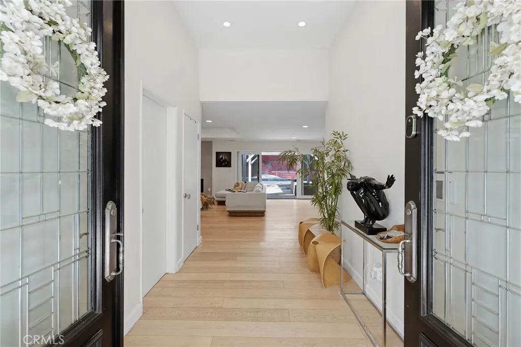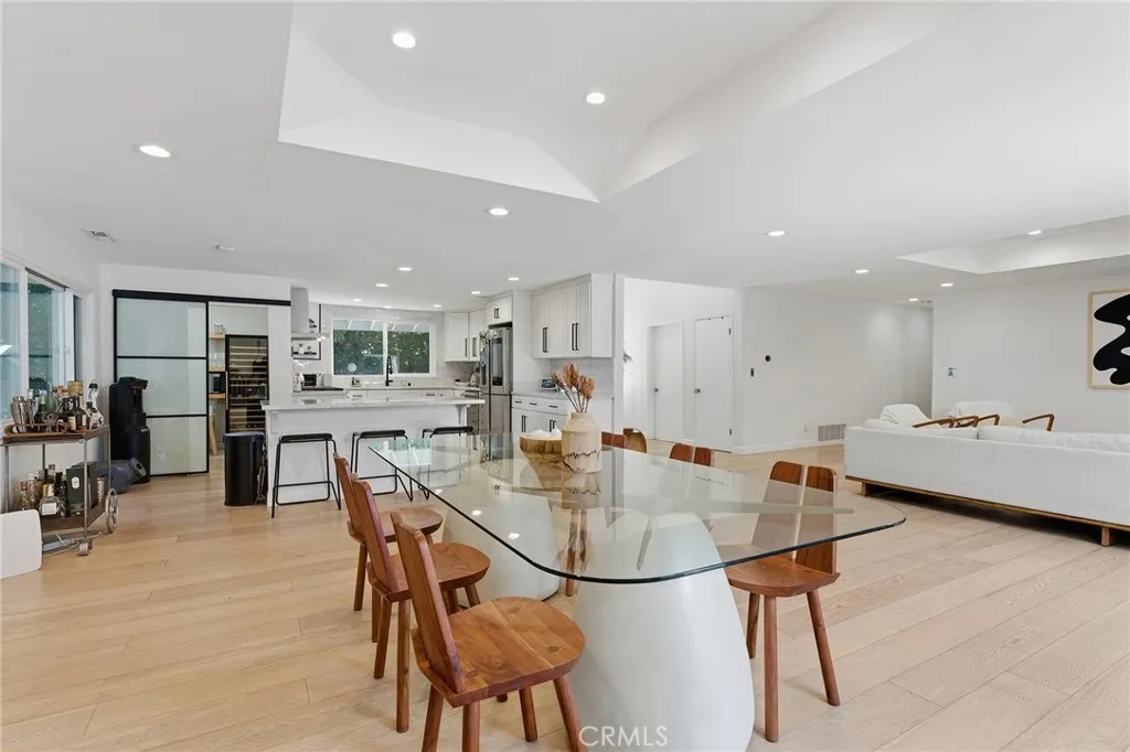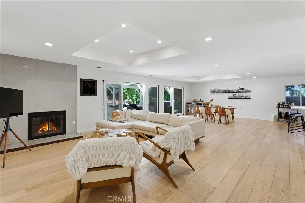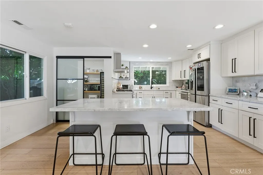 Extremely private single story gated estate located on a sprawling 20,000 SF lot South of the Blvd in the highly desirable neighborhood of Vista De Oro. The property sits far back from the street behind an automatic security gate and mature privacy hedging. An oversized driveway can accommodate parking for large gatherings and leads to the attached 2-car garage with 2 EV chargers. The grand double door entry foyer opens to a light and bright completely open floor plan with direct sight of the backyard setting an immediate tone for indoor/outdoor entertaining. The spacious family room has a plaster finished fireplace, tray ceiling, sliding glass doors that open to the yard, and wide plank hardwood floors found throughout. The equally large dining room also features a decorative tray ceiling and another glass slider that opens to the yard. The completely remodeled expansive kitchen opens directly to the living spaces and boasts center island with breakfast bar seating, Carrera marble counters & backsplash, custom soft close cabinetry, stainless appliances including a Miele range, and separate walk-in pantry. There are three well appointed bedrooms each with their own en-suite bathrooms. The primary bedroom features double door entry, glass slider that opens to the yard, large walk-in closet, and private luxurious remodeled bathroom with dual sinks, spa tub, and walk-in shower. The second bedroom suite has closet with custom built-ins and private remodeled bathroom with tub and shower. The third bedroom is located off the entry making it the ideal office or guest suite with ac