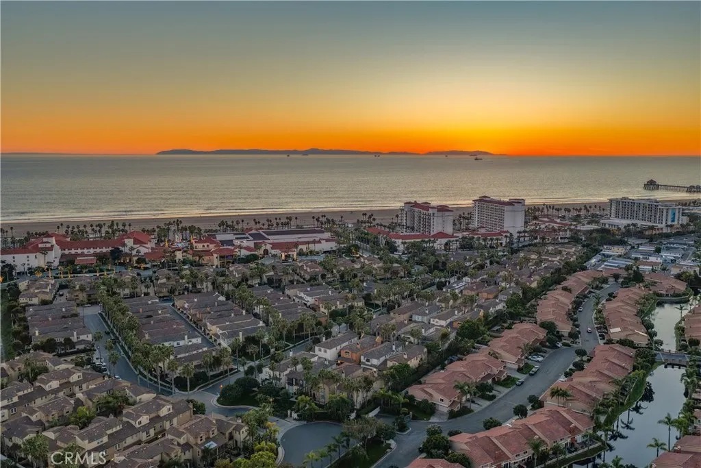 Come join the Coastal Lifestyle at The Waterfront townhouses in Downtown Huntington Beach just a few steps from the soft sands and rideable waves of Surf City. This home offers move-in condition luxury living in an extraordinary, gated enclave sitting in the shadow of three luxury 5-Star Hotels: The Grand Hyatt, Waterfront Hilton, and Pacea offer numerous dining options. These upscale resorts along with the vibrant energy of Pacific City and the pier make this one of the best resort locations in Southern California. This home is the largest and most coveted model in the community designed for entertaining and relaxation. There are two spacious bedrooms and two-and-one-half elegant baths, spread over 2664 square feet of living area. The formal entry flows seamlessly into multiple expansive living areas, from a cozy sitting nook to a stunning living room anchored by a fireplace. The chefs kitchen features sleek quartz countertops, breakfast bar, artisan cabinetry with glass-front accents, and top-tier stainless steel appliances. The elegant rotunda dining room has a coffered ceiling and graceful architectural details. Upstairs there generous accommodations for the homeowner, family, and guests. There is a loft retreat perfect for quiet mornings or creative pursuits, alongside a dedicated office nook with custom built-ins and a versatile second loft ideal as a library, office, or relaxation space. There is a covered balcony with glass wind barriers for enjoying ocean breezes. The luxury primary suite features its own fireplace, sprawling walk-in closet, and spa like bathroom