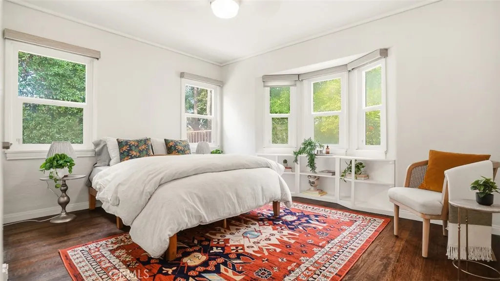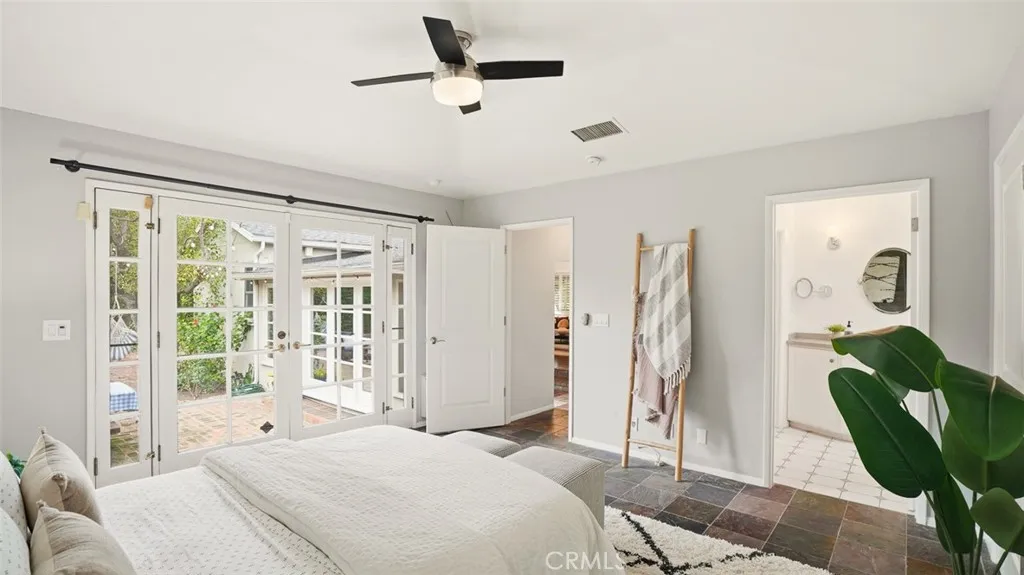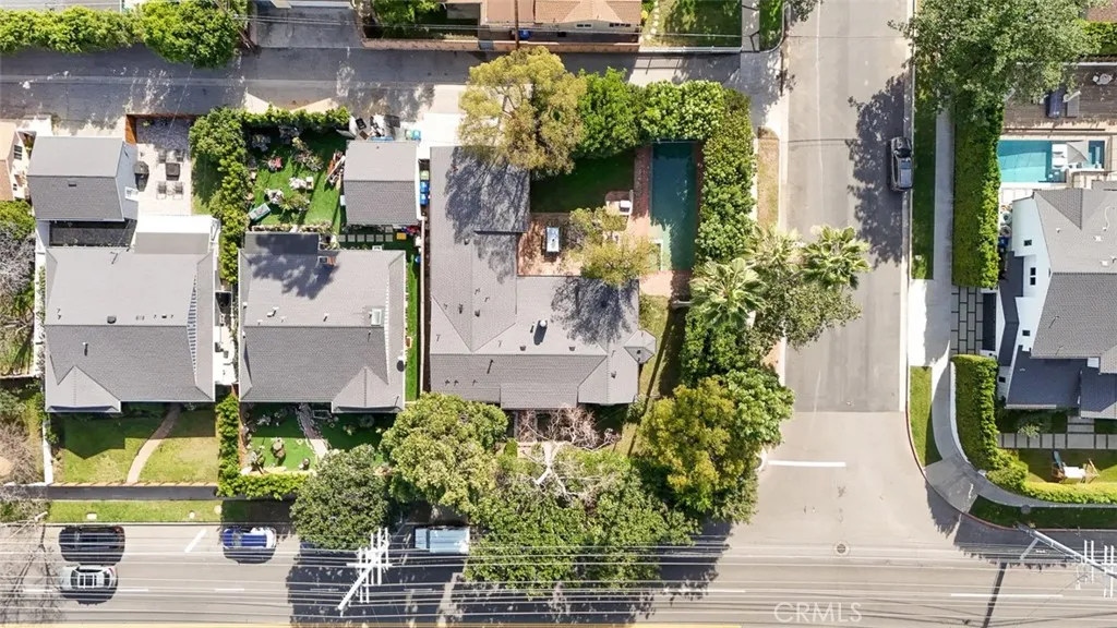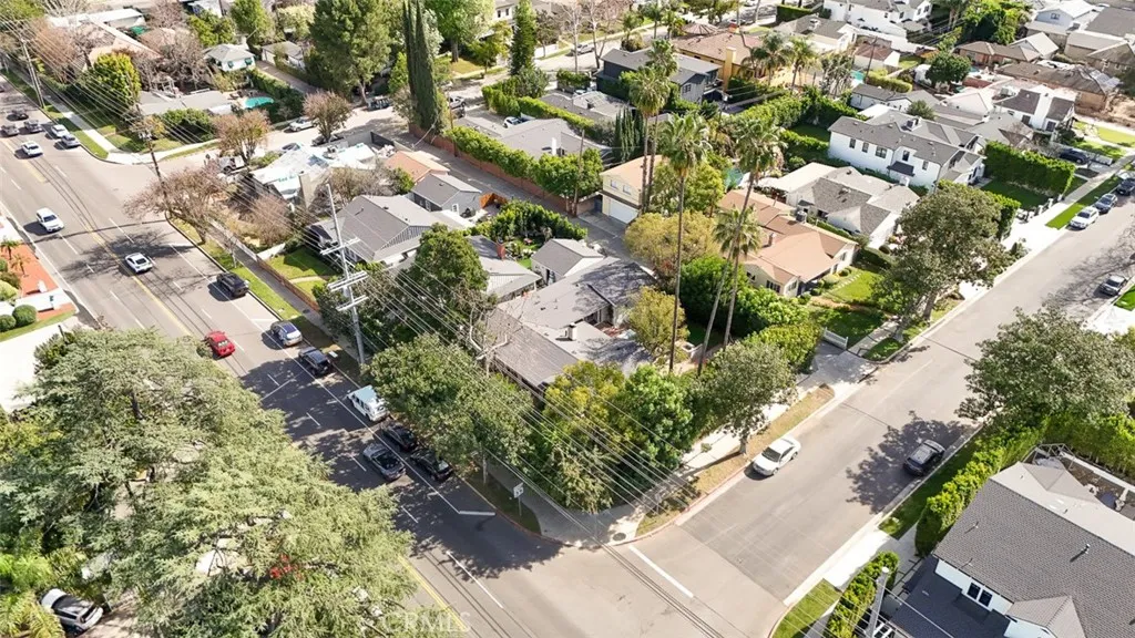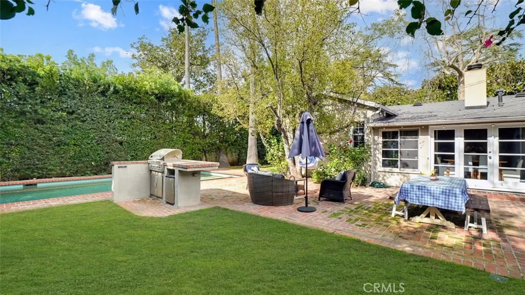 Tucked behind tall privacy hedges on a prime corner lot, this beautifully updated 3-bedroom + office, 3-bath ranch-style home offers effortless indoor-outdoor living in the heart of Sherman Oaks. Bathed in natural light, the thoughtfully designed floor plan blends classic charm with modern updates. A vaulted living room with beamed ceiling anchors the home, flowing seamlessly into a dining room that opens directly to the expansive backyard. The updated kitchen features Caesarstone countertops, stainless steel appliances, recessed lighting, and clean, timeless finishes. The spacious primary suite is a true retreat, complete with dual walk-in closets, French doors going out to the backyard, and a spa-inspired bath complete with soaking tub. Two generous secondary bedrooms and updated baths are thoughtfully positioned in a separate wing, while a detached office provides an ideal work-from-home setup or creative studio. Step outside to your own private oasis: a heated, covered saltwater pool and spa, built-in BBQ area, mature landscaping, and glowing bistro lights create the ultimate setting for entertaining or unwinding under the stars. Alley access to the two-car garage ensures both convenience and discretion. Recent upgrades include a new roof, Nest thermostat, Google Nest cameras, DoorBird video doorbell, and ADT security system. Refined, private, and move-in ready welcome home!