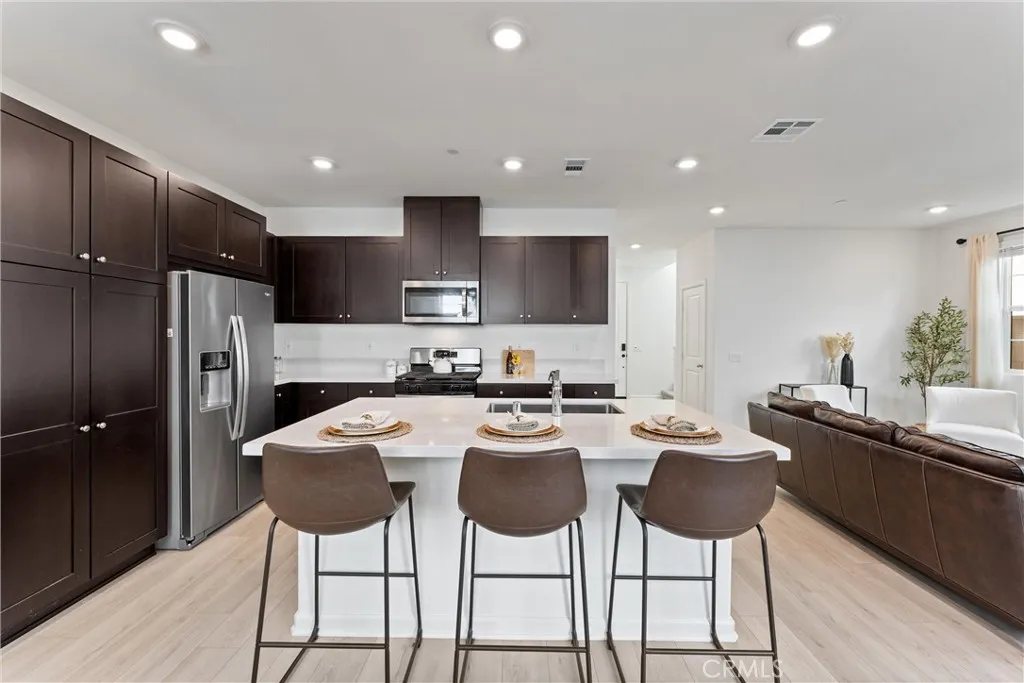 DOWNSTAIRS BED + BATH | WALKABLE COMMUNITY | MOVE-IN READY | LOW-MAINTENANCE YARD | TONS OF AMENITIES | LOW HOME INSURANCE | EASY COMMUTE | Welcome to this beautiful home in the highly desirable Bedford Community, where modern design meets everyday comfort. From the moment you arrive, youll fall in love with the inviting front porchperfect for enjoying morning coffee or unwinding in the evening. Step inside to a formal entryway filled with natural light, upgraded luxury plank flooring, & soaring high ceilings that create an airy, open feel. The open-concept Living Room offers a spacious & welcoming setting, ideal for gathering with family and friends. The heart of the home is the stunning Chefs Kitchen, thoughtfully designed with an oversized island featuring breakfast bar seating, elegant quartz countertops, matching Whirlpool stainless steel appliances, shaker-style cabinetry, built-in trash/recycling, deep stainless-steel sink, & dedicated coffee bar. An adjacent Dining area makes entertaining effortless, while direct access to the backyard provides seamless indoor/outdoor living. Upstairs, the spacious Primary Suite offers a private retreat complete with luxurious Ensuite Bathroom featuring a double-sink vanity, quartz countertops, oversized walk-in shower, & generous walk-in closet. Bedrooms #2 and #3 upstairs are well-sized, & the secondary Bathroom includes dual sinks, quartz countertop and a shower/tub combo. Downstairs, Bedroom #4 is beside a third bathroom with a walk-in shower with dual bench seating: a perfect space for visiting guests or multi-generational livi