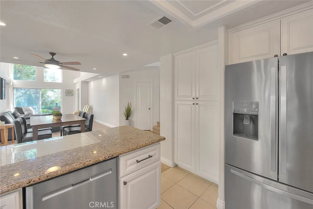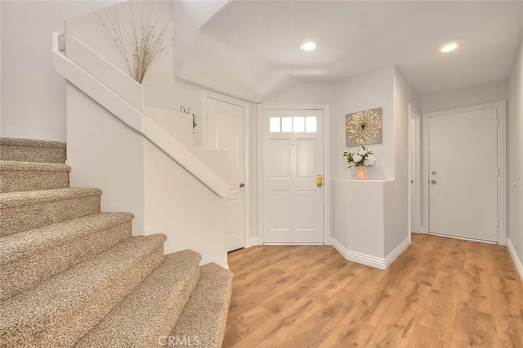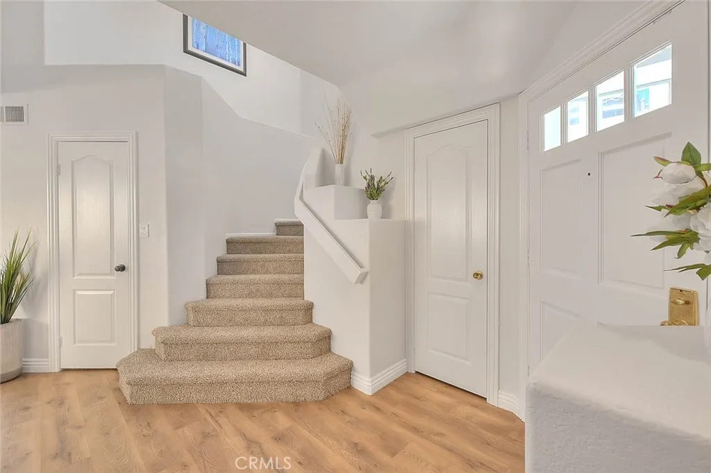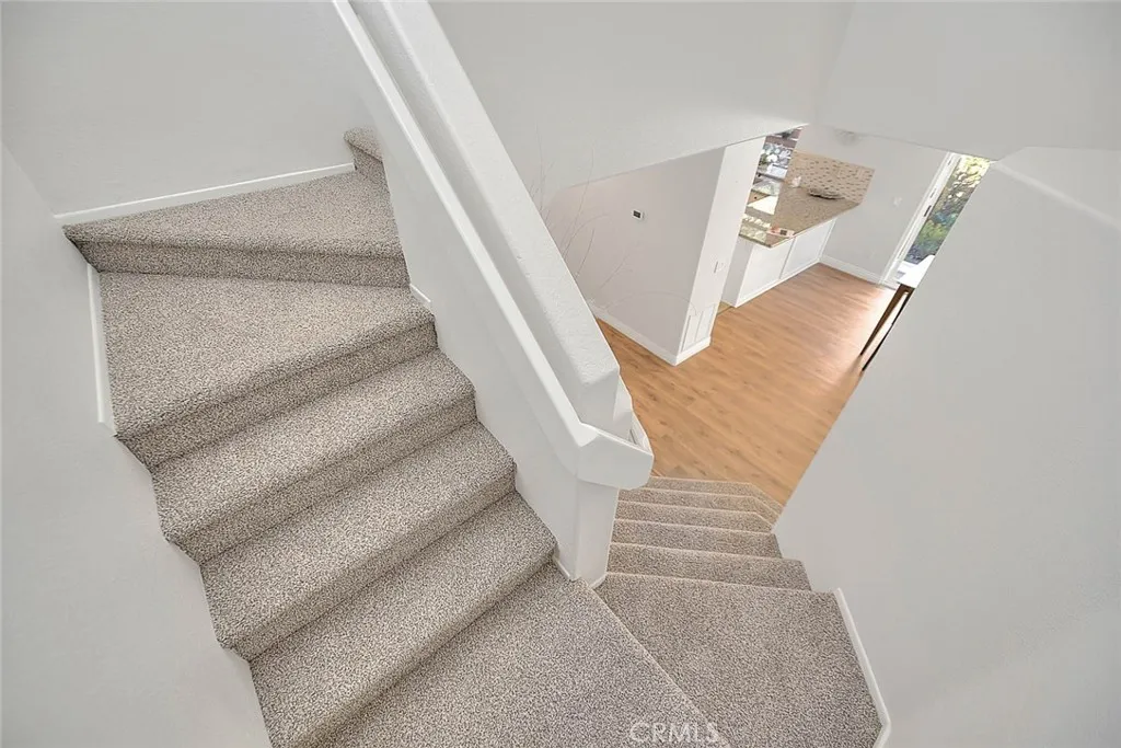 VIEW! No HOA! New Roof Re-paper! This is a three bedroom two and a half bath home in the heart of Chino Hills. Featuring spectacular mountain and city light views and serene backyard landscaping. Freshly painted inside and out, new wood laminate flooring through out the main level, and new carpet upstairs. HVAC system was installed one year ago. The home feels clean, modern, and welcoming from the moment you walk in. Primary bedroom with primary bathroom is located on the first floor. Primary bathroom features double sinks and a large walk in closet. Two bedrooms and one full bathroom located on the second floor. Open floorplan with vaulted ceilings and lots of natural light. Updated kitchen with granite counters tops and stainless steel appliances. Downstairs half bath was recently updated with new floors, vanity, sink, faucet, and toilet.