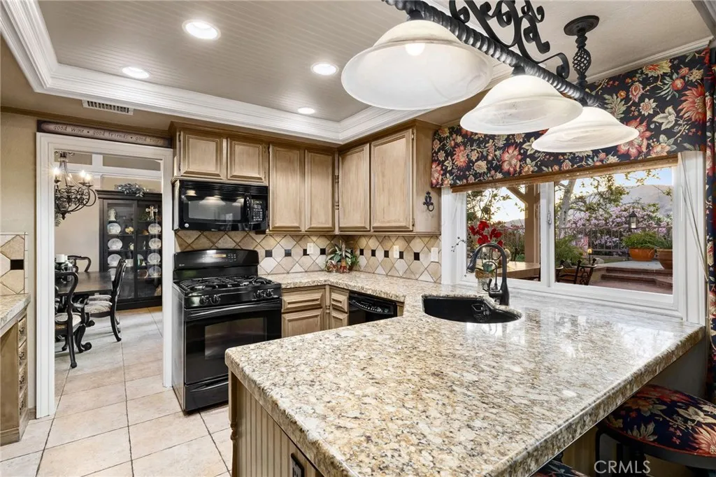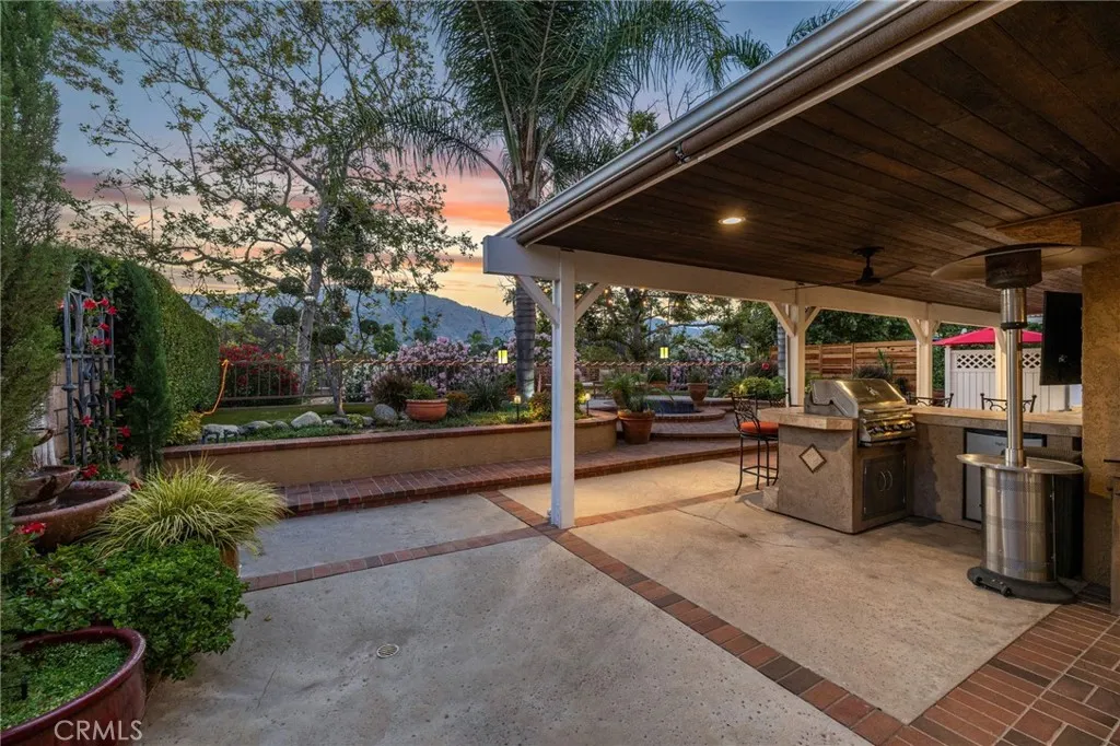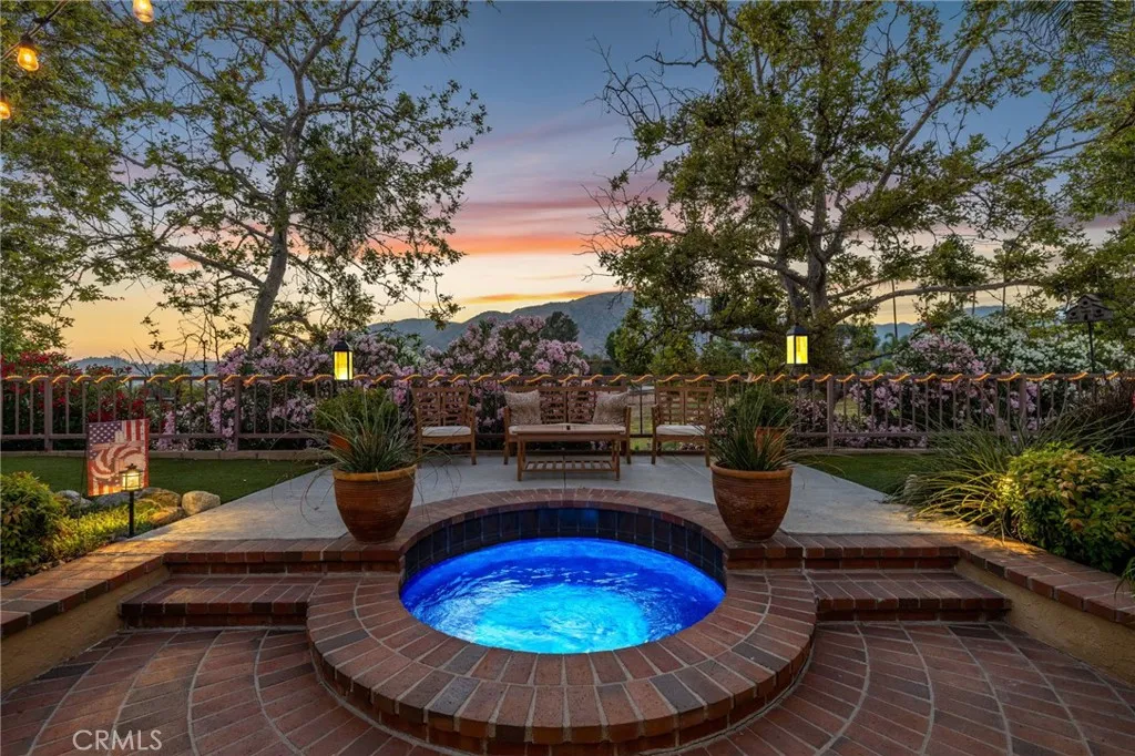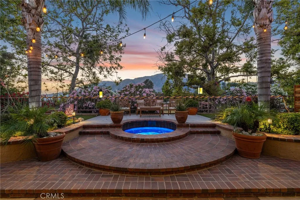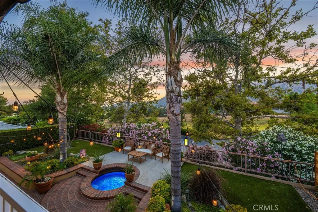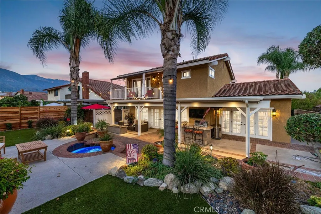 Beautifully positioned against a mountain-view backdrop, this thoughtfully updated home blends timeless character with functional living and inviting outdoor spaces. The front yard offers a warm first impression with mature landscaping, brick-accented steps, and a private gated courtyard leading to a covered brick porch. Soft lighting and classic tile roofing enhance the homes curb appeal. Inside, a foyer with tile flooring opens to the formal living room, featuring a vaulted ceiling accented by decorative white trim, a stone-surround fireplace, white mantel, and a large front-facing window. The adjacent dining area continues the vaulted ceilings and is anchored by a wrought-iron chandelier, French doors to the exterior, and direct kitchen access. The kitchen is appointed with wood cabinetry, granite countertops, a full tile backsplash, recessed lighting, and an inset ceiling with crown molding. A peninsula with bar seating and a window overlooking the backyard and mountains add both function and natural light. The adjoining family room offers an open layout with crown molding, French doors, a spanning window to the backyard, and a built-in wet bar with granite counters and a beverage refrigerator. The main level also includes a remodeled half bath and a dedicated laundry room. Upstairs, the primary suite features carpeted floors, a vaulted ceilings, and French doors leading to a private balcony with panoramic views. The ensuite bath offers dual sinks with granite countertops, a custom tiled shower with glass enclosure, and a walk-in closet with built-ins. Two additional be