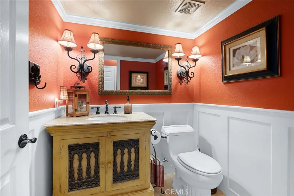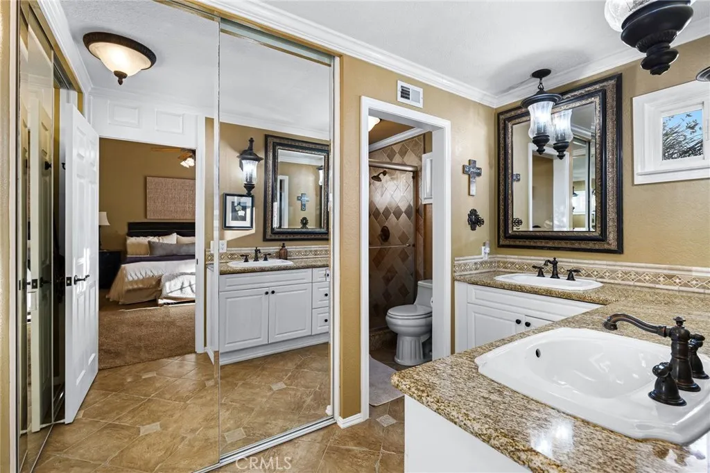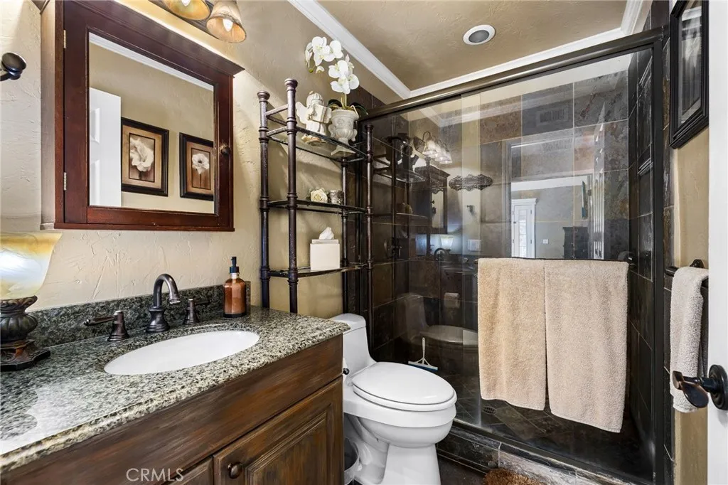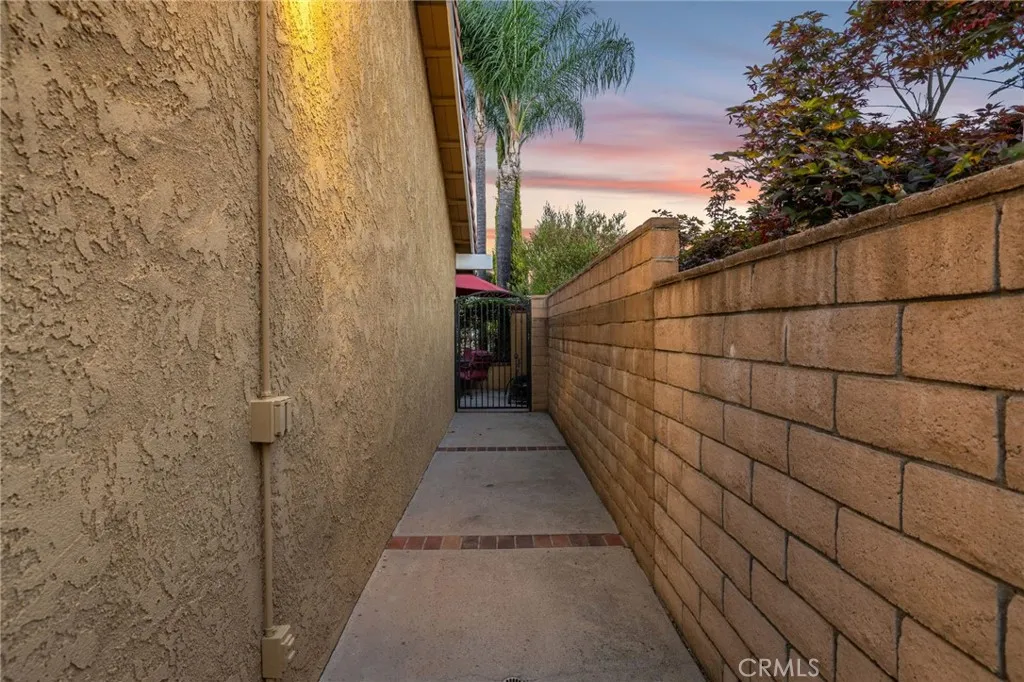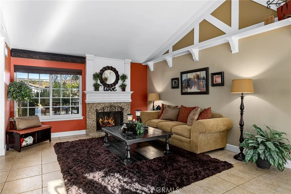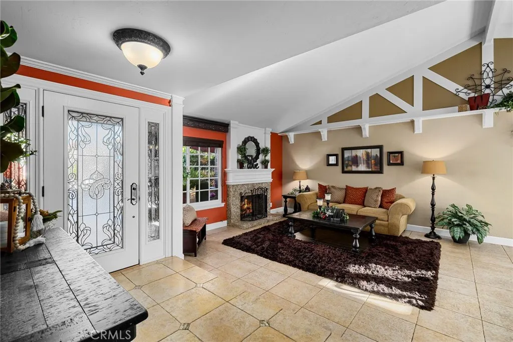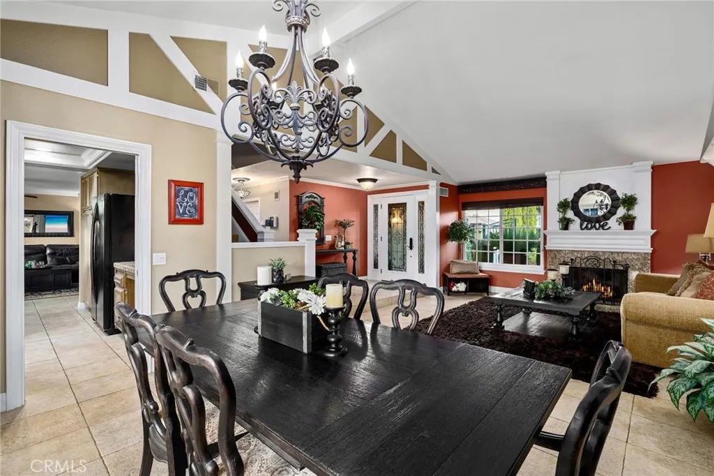 Beautifully positioned against a mountain-view backdrop, this thoughtfully updated home blends timeless character with functional living and inviting outdoor spaces. The front yard offers a warm first impression with mature landscaping, brick-accented steps, and a private gated courtyard leading to a covered brick porch. Soft lighting and classic tile roofing enhance the homes curb appeal. Inside, a foyer with tile flooring opens to the formal living room, featuring a vaulted ceiling accented by decorative white trim, a stone-surround fireplace, white mantel, and a large front-facing window. The adjacent dining area continues the vaulted ceilings and is anchored by a wrought-iron chandelier, French doors to the exterior, and direct kitchen access. The kitchen is appointed with wood cabinetry, granite countertops, a full tile backsplash, recessed lighting, and an inset ceiling with crown molding. A peninsula with bar seating and a window overlooking the backyard and mountains add both function and natural light. The adjoining family room offers an open layout with crown molding, French doors, a spanning window to the backyard, and a built-in wet bar with granite counters and a beverage refrigerator. The main level also includes a remodeled half bath and a dedicated laundry room. Upstairs, the primary suite features carpeted floors, a vaulted ceilings, and French doors leading to a private balcony with panoramic views. The ensuite bath offers dual sinks with granite countertops, a custom tiled shower with glass enclosure, and a walk-in closet with built-ins. Two additional be