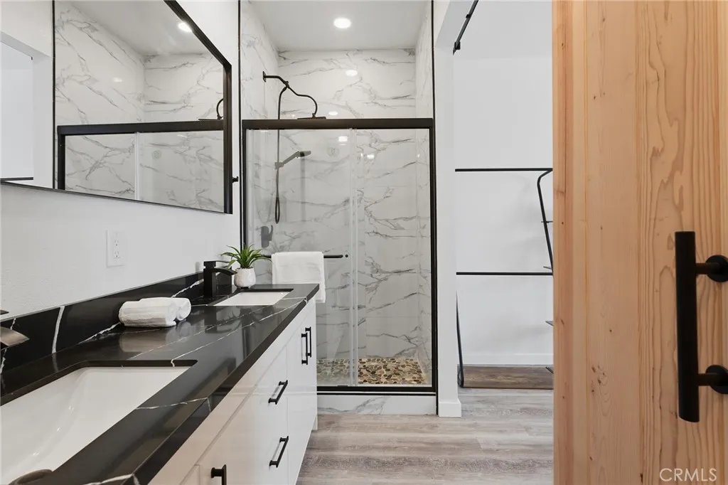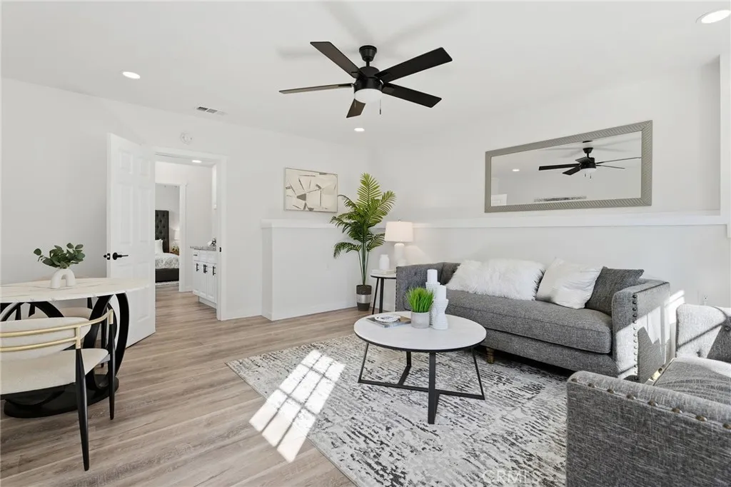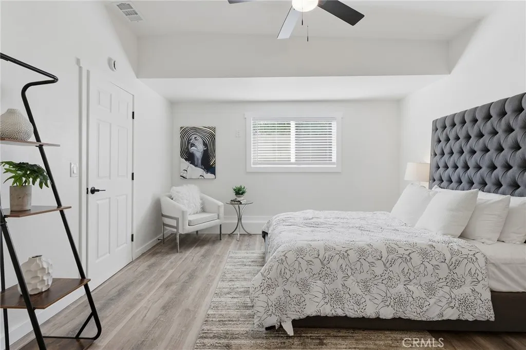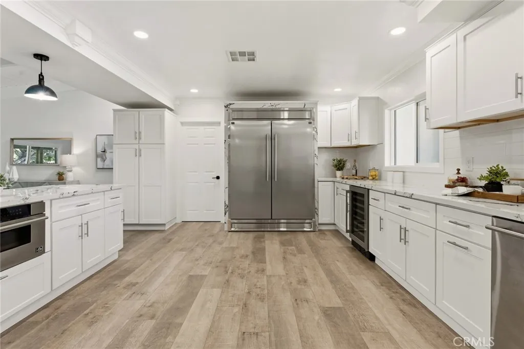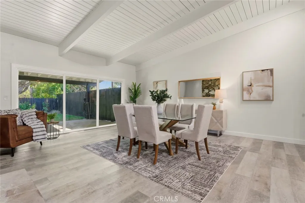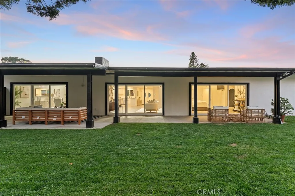 Meticulous and highly upgraded mid-century modern Charles Du Bois single level home with attached guest apartment with separate kitchen! The property sits elevated above the street on a sprawling 11k lot boasting almost 100 feet of frontage adorned with manicured front lawns and lush landscaping. An ascending stone pathway leads to the covered front porch cladded with original stone exterior. Step through double doors into the entry foyer that opens to expansive living & dining rooms each with tongue & groove wood beamed vaulted ceilings, original stone fireplaces, and glass sliders that open to the backyard for the perfect indoor/outdoor flow. The oversized remodeled kitchen boasts large island with breakfast bar seating, quartz counters with soft close custom cabinetry, wine fridge, and a suite of Forno gourmet stainless appliances including a 60 fridge/freezer and built-in range with double ovens and 8-burner stove with pot filler. The spacious primary suite features high vaulted ceiling, glass slider that opens to the yard, large walk-in closet, separate makeup vanity, and en-suite upgraded bathroom with dual sinks, spa tub, and separate walk-in shower. One bedroom wing has the primary suite and two additional secondary bedrooms each with high vaulted ceilings and they share a spacious remodeled bathroom with new vanity with stone counter, dual sinks, and walk-in shower. There is a separate wing/guest apartment of the home which has both interior and exterior access making it the ideal flex space for extended family, home office/studio space, or great rental income feat