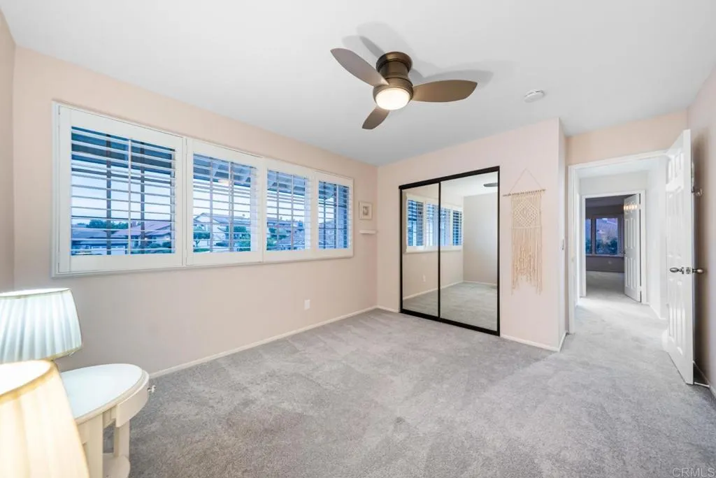 Rare opportunity in the Montelena community! This beautifully maintained cul-de-sac home offers stunning sunset and Battle Mountain views, paid-off solar, and a spacious 5-bedroom, 3-bath layout with a bedroom downstairs perfect for guests or multi-gen living. Enjoy abundant natural light from Andersen two-story living room windows and a large view window in the primary suite. The primary bath features a remodeled walk-in shower and premium bidet, while the upstairs office and walk-in closet have been thoughtfully remodeled for maximum functionality. Step into your private backyard retreat with a pool, usable yard space ideal for entertaining or gardening, and mature high-producing citrus trees. Additional upgrades include a recently replaced water heater, energy-saving lighting throughout, and a large garage with built-in workbench and extra storage. Homes in Montelena rarely come available dont miss this move-in-ready home with views, efficiency, and luxury touches in one of San Diegos most desirable communities