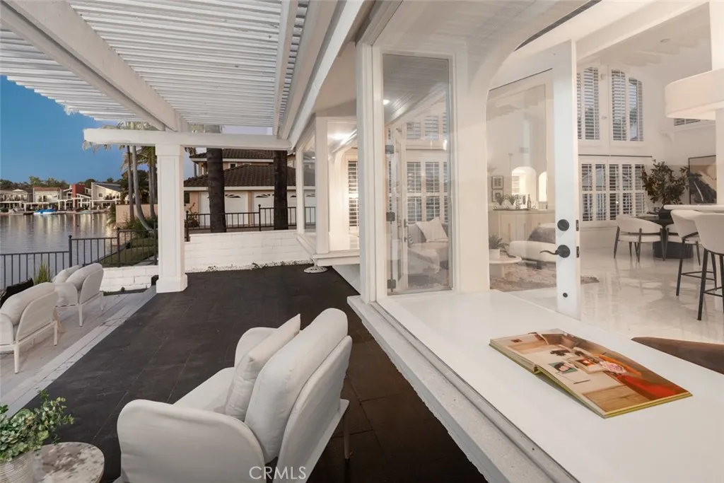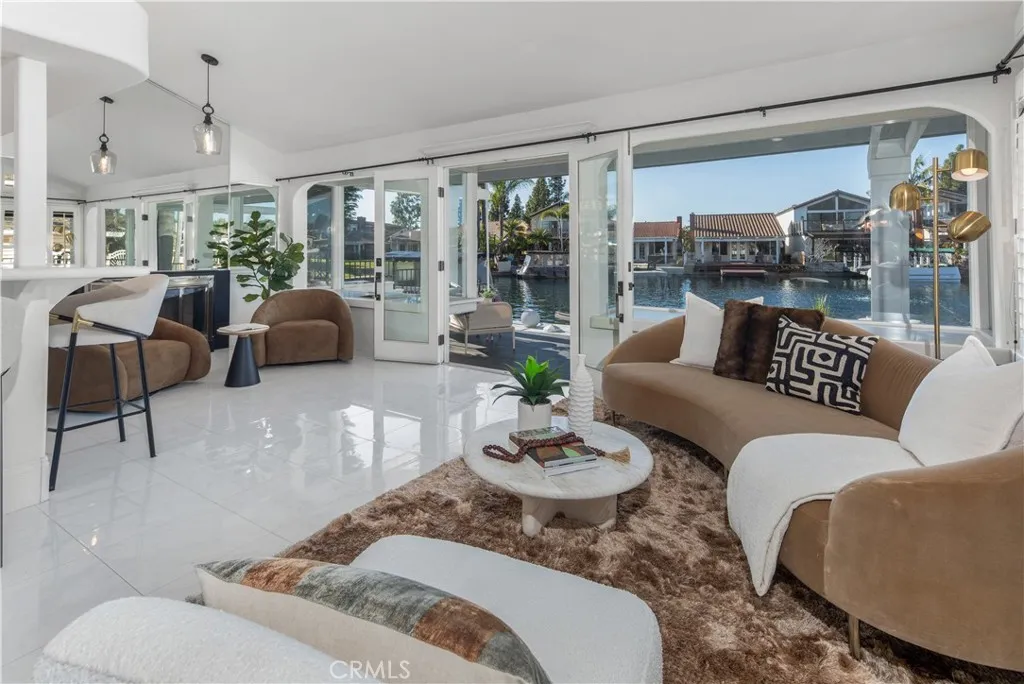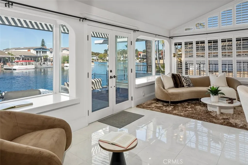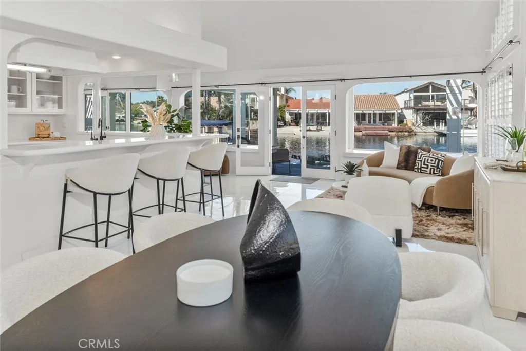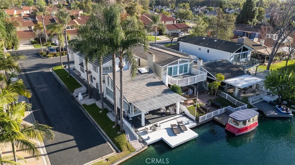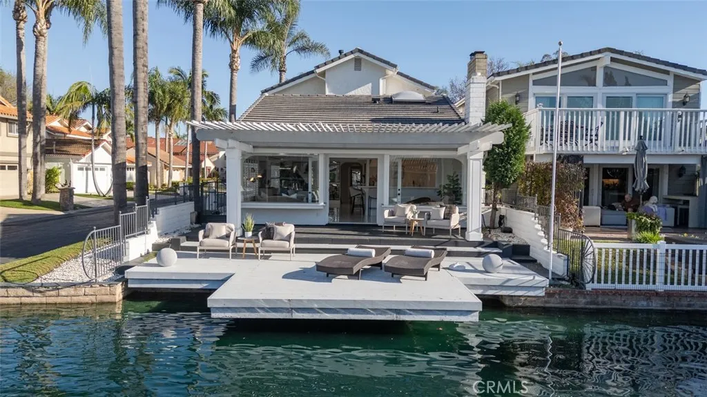 This residence reads less like a conventional home and more like a study in proportion, light, and reflection. Positioned on a rare inside corner lot, the property opens outward to a broad main channel panorama where the water widens and the horizon lingers. From nearly every vantage point, the lake becomes part of the composition, not simply a backdrop but a constantly shifting material that animates the house throughout the day. The exterior presents a restrained modernist language, crisp planes of white softened by shadow lines from mature palms and the geometry of the dock beyond. As the home wraps the corner, it reveals itself gradually, a sequence rather than a faade. The waterline deck extends like a continuation of the living space, dissolving the boundary between structure and shoreline. Inside, the plan unfolds with an almost gallery-like clarity. Surfaces remain intentionally calm, allowing volume and perspective to take precedence. Wide openings frame long water views that shift as you move, producing a subtle sense of procession through the home. The living spaces orient toward the channel, while softer, more intimate moments appear along the periphery, reading corners, curved seating arrangements, and layered sightlines that create both openness and refuge. The kitchen sits as a sculptural center rather than a separate room, its soft forms and pale palette reflecting daylight deeper into the interior. Two primary suites, one upstairs and one downstairs, allow the home to function across different rhythms of living. The lower suite maintains immediate connectio