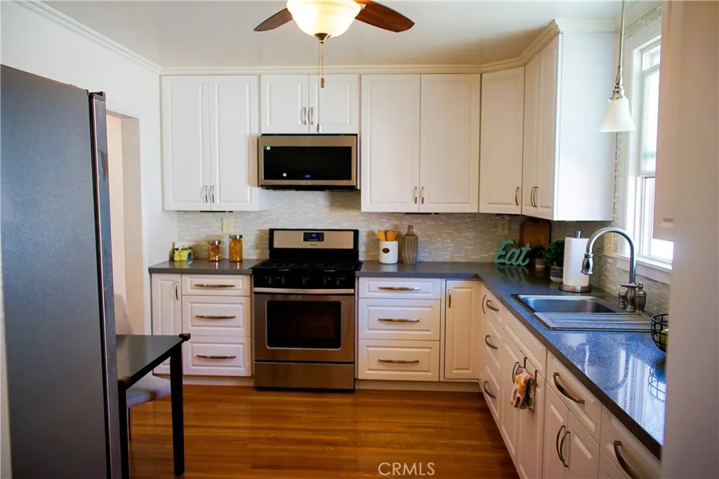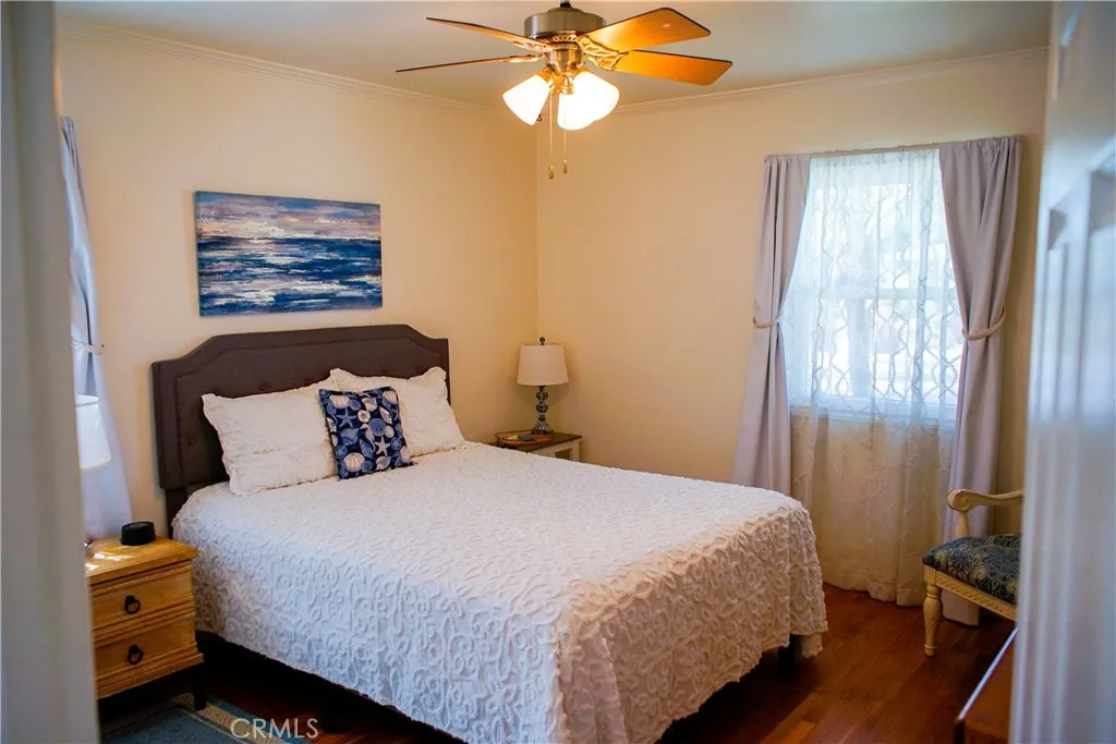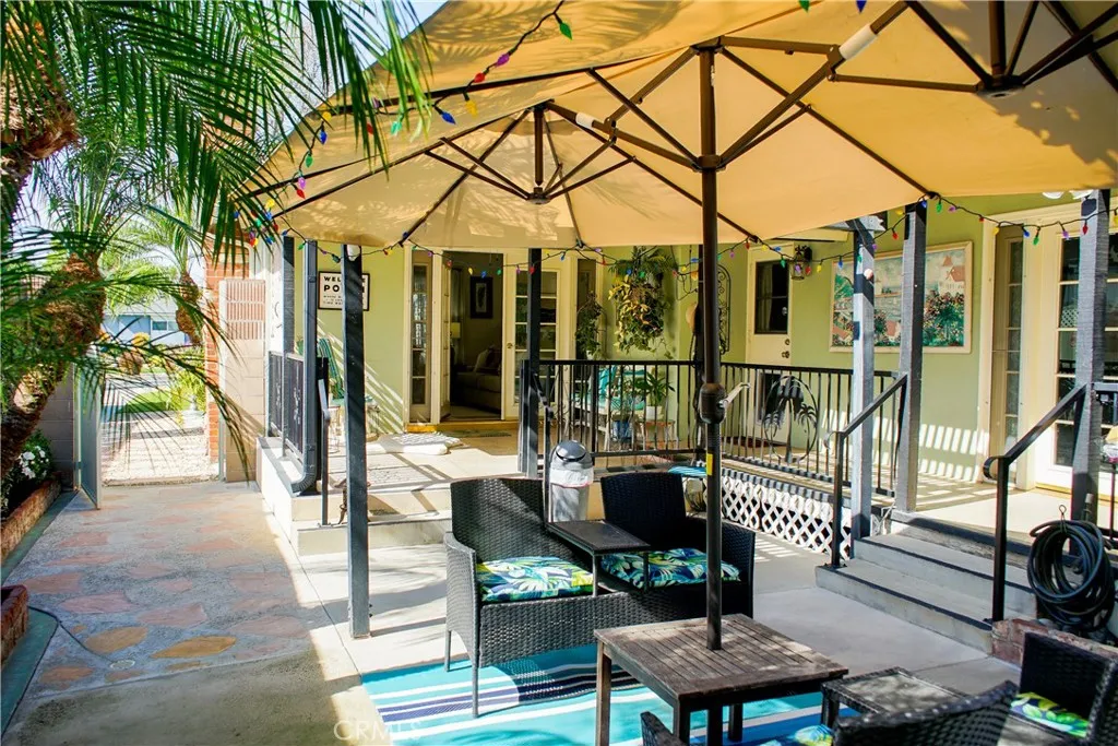 Experience a one-of-a-kind estate in the prestigious Park Santiago community, masterfully redesigned to balance high-end entertaining with absolute serenity. Situated on an expansive, deep lot with a Walk Score of 99, the residence welcomes you with custom stone hardscape and a deluxe electric-gated driveway spanning the full length of the property. Inside, the open-concept living space is detailed with gleaming hardwoods, custom crown moulding, and a chef-inspired kitchen featuring Corian stone, soft-close pull-outs, and clever storage enhancements. Thoughtfully designed for flexibility, the kitchen is also fully plumbed for a future dishwasher installation. The homes artistic character is showcased through unique tile murals positioned along the exterior, perfectly framed by the windows of the kitchen and all three guest bedrooms. For ultimate quiet, the primary suite serves as a soundproofed sanctuary, featuring high-density insulation and elegant French doors. The rear grounds are an entertainers "Oasis," fully enclosed by a block wall and wood fencing with added height for maximum privacy. This outdoor retreat is enhanced by water-efficient turf, professional lighting, and flagstone inlays. Completing the estate is a large 2-car garage with an integrated bonus room, plus a separate gated studio shedideal for a home office or art gallery. With a newer HVAC system, solar lighting tubes, and a newer composition shingle roof, this home offers rare quality and character in a premier location.