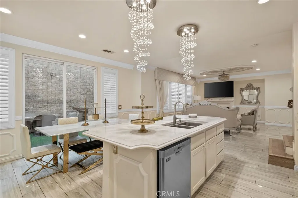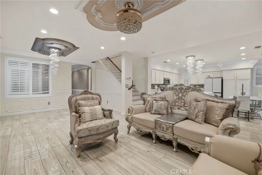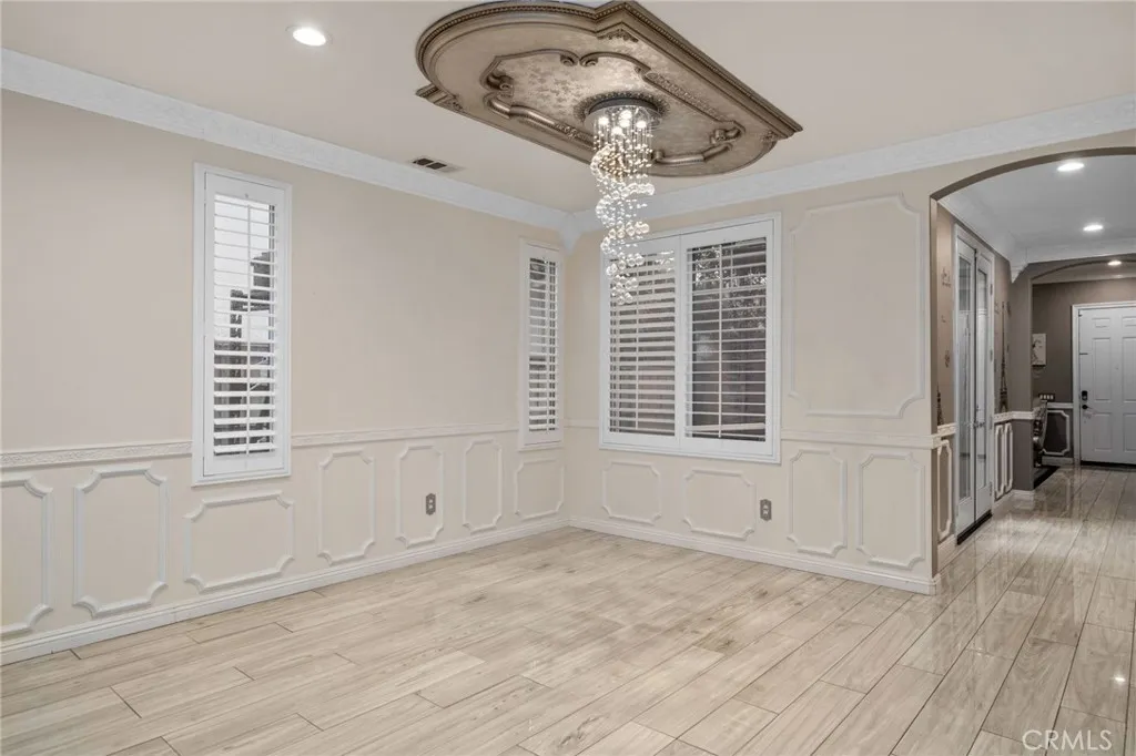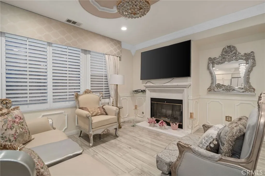 Take a trip into Parisian elegance with stunning wall woodwork and dazzling chandeliers that evoke timeless European charm. Welcome to this stunning West Covina residence, where classic sophistication meets thoughtful upgrades throughout. From the moment you arrive, the paved front porch sets the tone for the grace and refinement found inside. Step through the entry into the formal living room featuring plantation shutters, detailed wall woodworking, a breathtaking chandelier, and crown molding that adds warmth and character. French doors open to a serene courtyard, creating the perfect indoor-outdoor flow. The formal dining room is equally impressive with exquisite wall dcor, plantation shutters, and an eye-catching chandelier that elevates every gathering with a touch of Paris-inspired luxury. Deeper into the home, the open-concept family room shines with custom drapery, striking chandeliers, rich wall woodwork, and a cozy fireplace. The space flows seamlessly into the beautifully upgraded kitchen and breakfast nook, offering both style and functionality. Sliding doors from the breakfast nook lead to the backyard, making entertaining effortless. A recently renovated full bathroom is conveniently located on the main floor. The garage has been thoughtfully converted into a bedroom complete with a custom closet, built-in cabinetry, ceiling fan, crown molding, and detailed wall woodworkideal for guests, extended family, or a private office. Upstairs, a versatile loft area provides additional living space, with crown molding continuing throughout. The primary suite is truly a