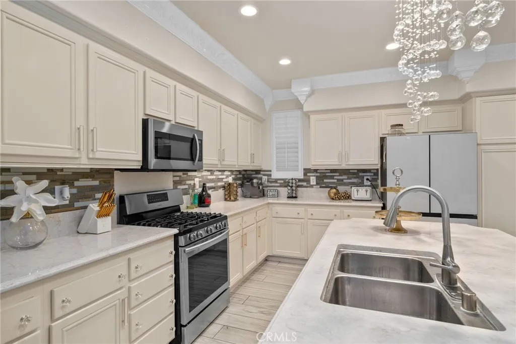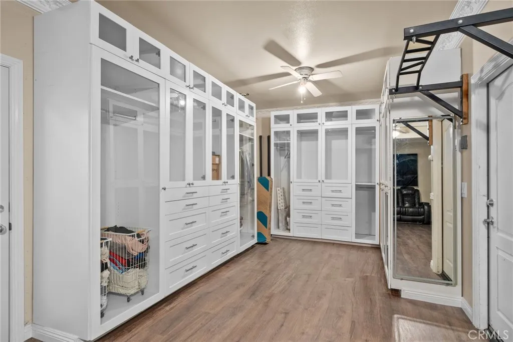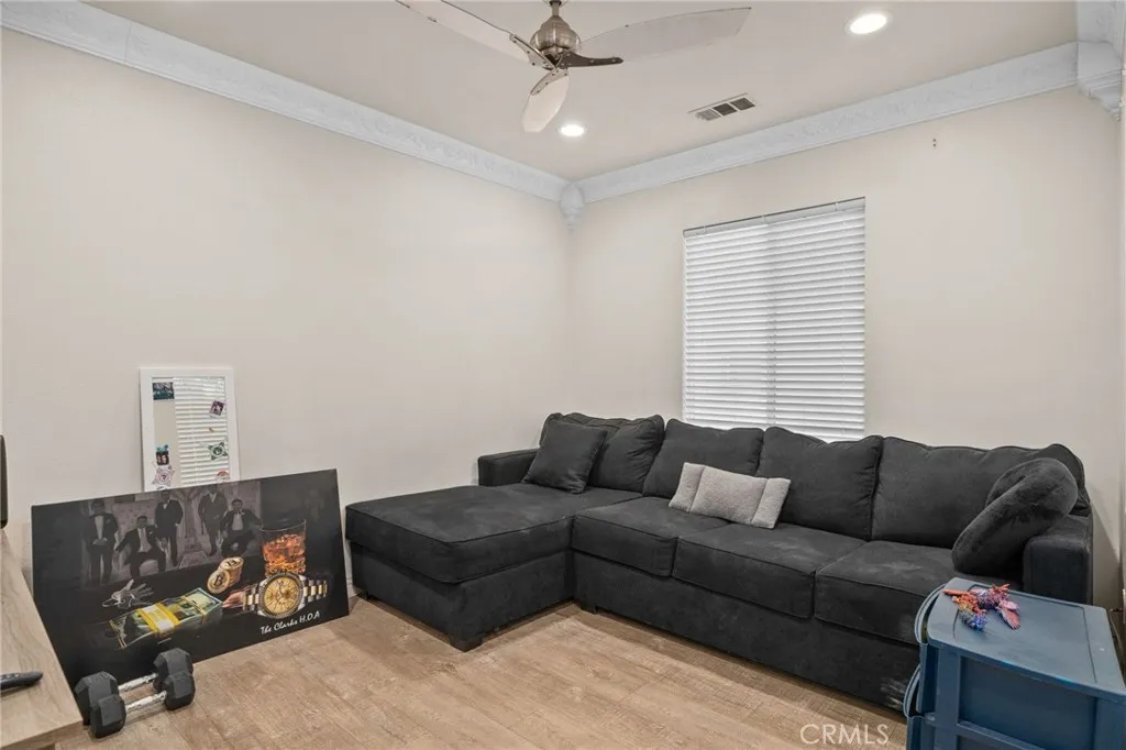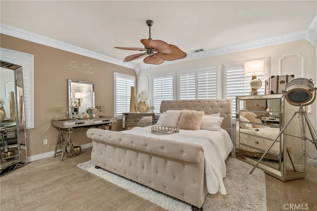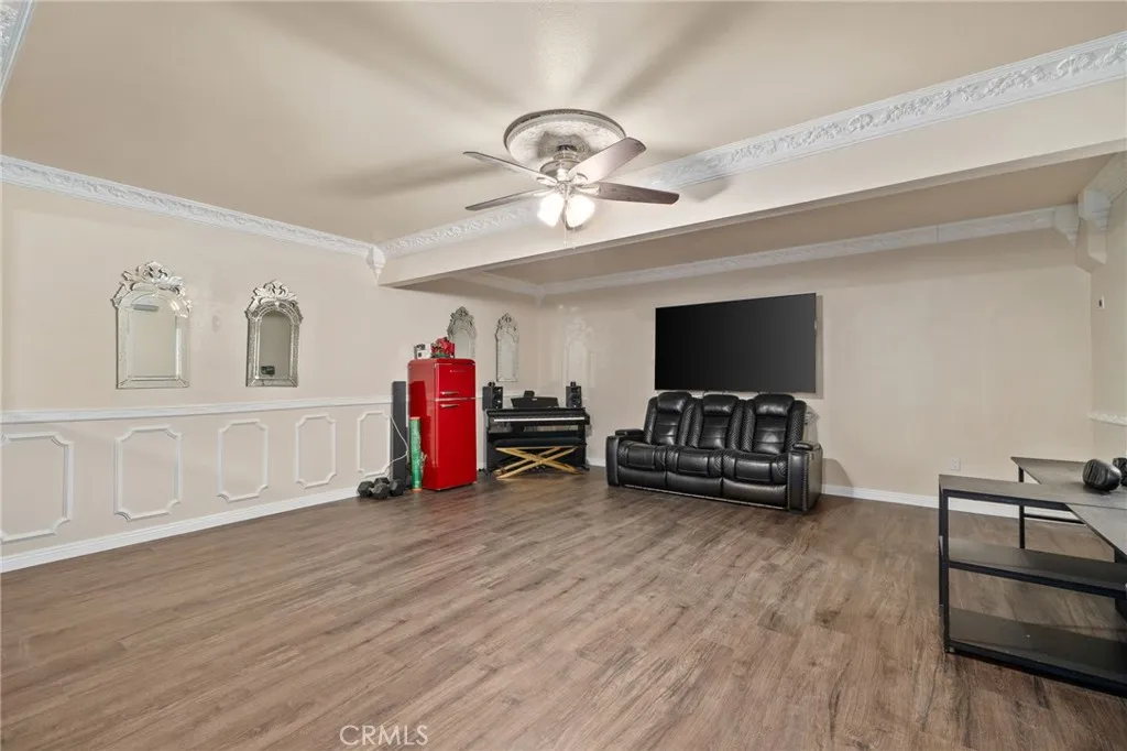 Take a trip into Parisian elegance with stunning wall woodwork and dazzling chandeliers that evoke timeless European charm. Welcome to this stunning West Covina residence, where classic sophistication meets thoughtful upgrades throughout. From the moment you arrive, the paved front porch sets the tone for the grace and refinement found inside. Step through the entry into the formal living room featuring plantation shutters, detailed wall woodworking, a breathtaking chandelier, and crown molding that adds warmth and character. French doors open to a serene courtyard, creating the perfect indoor-outdoor flow. The formal dining room is equally impressive with exquisite wall dcor, plantation shutters, and an eye-catching chandelier that elevates every gathering with a touch of Paris-inspired luxury. Deeper into the home, the open-concept family room shines with custom drapery, striking chandeliers, rich wall woodwork, and a cozy fireplace. The space flows seamlessly into the beautifully upgraded kitchen and breakfast nook, offering both style and functionality. Sliding doors from the breakfast nook lead to the backyard, making entertaining effortless. A recently renovated full bathroom is conveniently located on the main floor. The garage has been thoughtfully converted into a bedroom complete with a custom closet, built-in cabinetry, ceiling fan, crown molding, and detailed wall woodworkideal for guests, extended family, or a private office. Upstairs, a versatile loft area provides additional living space, with crown molding continuing throughout. The primary suite is truly a