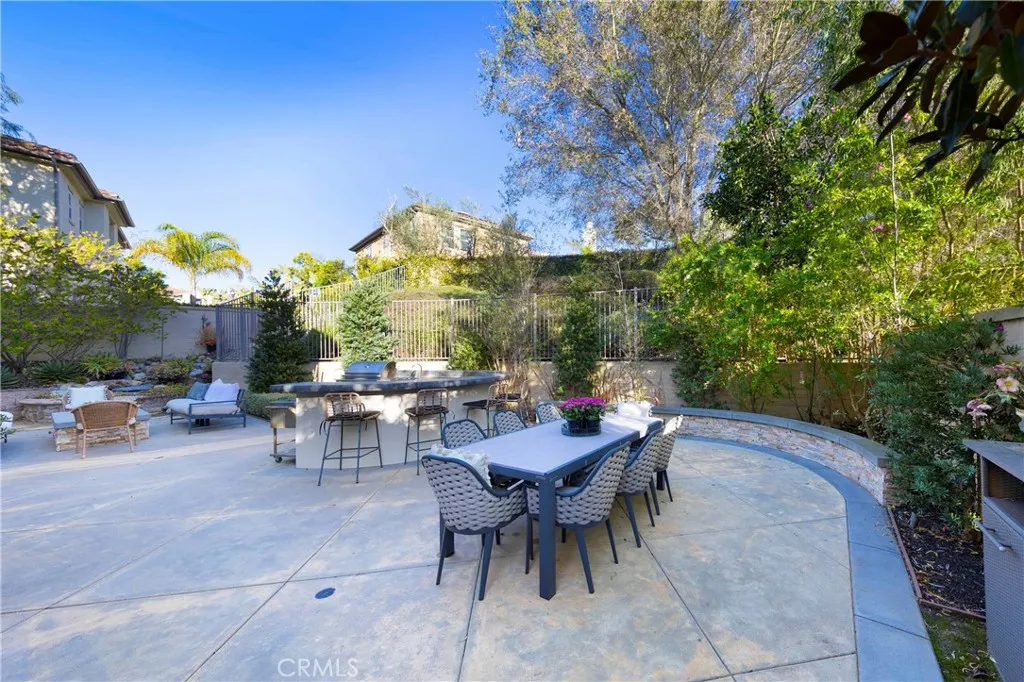 Upon entering the gated community of Vittoria atop the hill on Avenida Talega, this 5-bedroom home welcomes you with a xeriscape-inspired front yard retreat. Walk into the inviting dining room that leads to a living room ready to be reimagined as a bonus media room, music room, or study. The gourmet kitchen with oversized island overlooks the family room and breakfast nook where gatherings can be hosted. French doors lead out to an entertainer's backyard featuring a generously sized built-in bar with barbecue. Warm up by the large fire pit while listening to the tranquil sounds of the nearby waterfall. The main floor includes a bedroom, a three-quarter bathroom, and another room that can serve as a guest room, workout room, or office. Create your luxury sanctuary upstairs in the large primary suite that leads to the en suite complete with walk-in shower, soaking tub, and dual sinks, and organize your apparel and accessories in the large walk-in closet. Three light and bright upstairs secondary bedrooms are waiting to be decorated with your finishing touches. Upstairs laundry room, Jack & Jill bathroom with separate shower, and niches with cabinetry keep spaces tidy and organized. Newer wood-like French oak-inspired vinyl planks throughout are neutral and durable. Extensive crown moulding and wainscot finishes add elegance to this two-story home. Exterior features include a drip system allowing for responsible watering of lower maintenance landscaping in the front and back yards. Light, bright, and airy, this home is ready for you to share good times and make memories. This