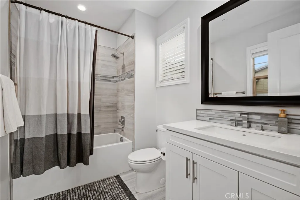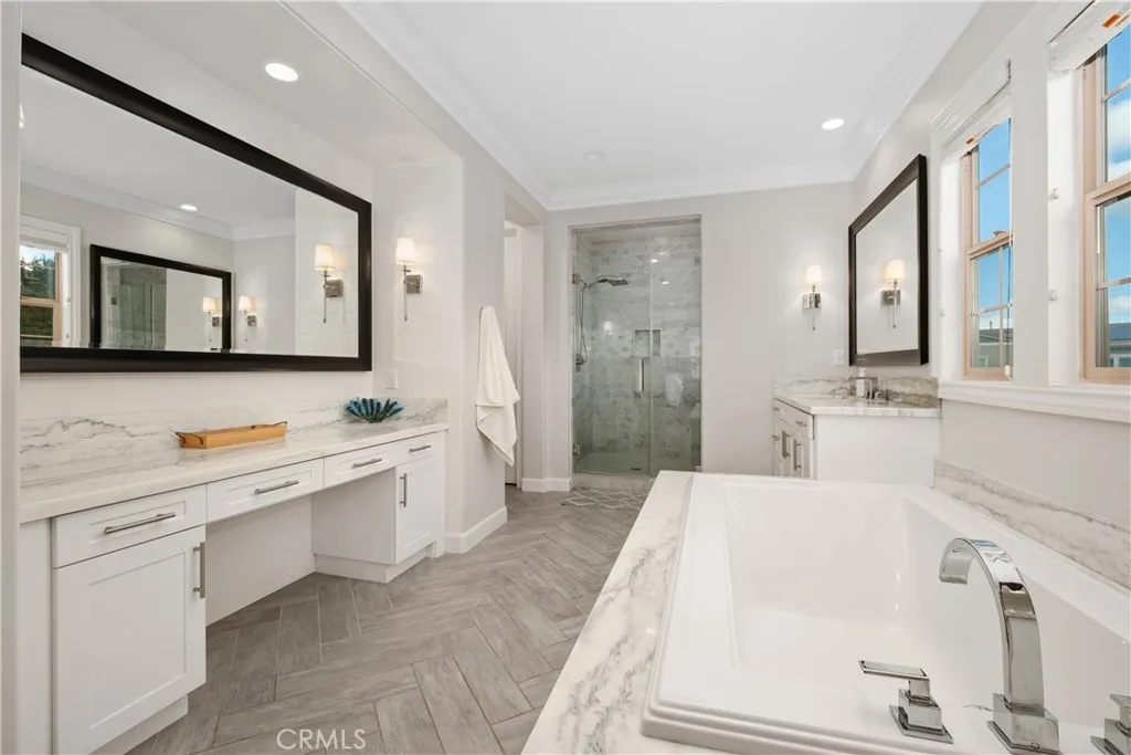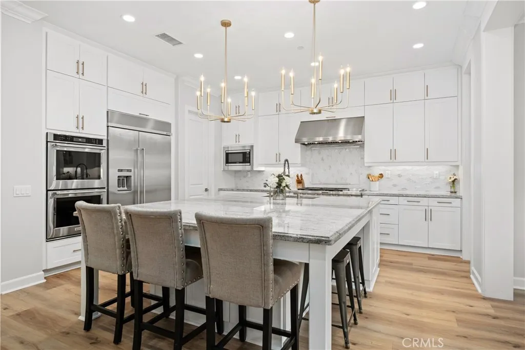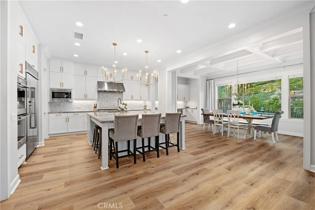 Nestled within the coveted Esencia community of Rancho Mission Viejo, this exceptional 5-bedroom, 5.5-bath Aubergine Plan 3 residence has been thoughtfully upgraded and meticulously designed. Refreshed with new exterior paint, the home offers impressive curb appeal. A charming courtyard welcomes you and separates the home from the casita, ideal as an office or guest suite with its own entrance, newer AC, and full bathroom. Inside, wainscoting frames the grand staircase and elegant foyer. Fresh interior paint and new luxury vinyl flooring on the first level create a bright, contemporary aesthetic. Every window features custom casing, complemented by 10" crown molding and dimmable smart switches. A flexible downstairs den offers endless possibilities. The open-concept living space is the heart of the home, where the kitchen seamlessly connects to the family and dining areas. The kitchen showcases white cabinetry with new champagne gold hardware, an oversized granite island, and premium stainless-steel appliances including a built-in refrigerator, double oven, 6-burner cooktop, and microwave. Coffered ceilings and new chandeliers elevate the dining area, while the extended dry bar has dual beverage refrigerators. A walk-in pantry and timeless backsplash complete the space. Stackable sliders open to a serene California room, where you can enjoy fireplaces both inside and out. The private backyard features low-maintenance turf with app-controlled sprinklers, pavers, apple trees, and a saltwater pebble tech spool with waterfall and fire pit. Upstairs, the primary suite offers bea