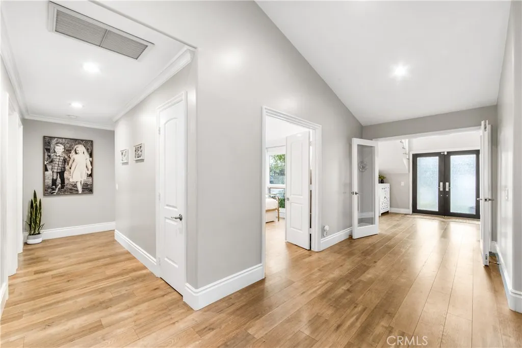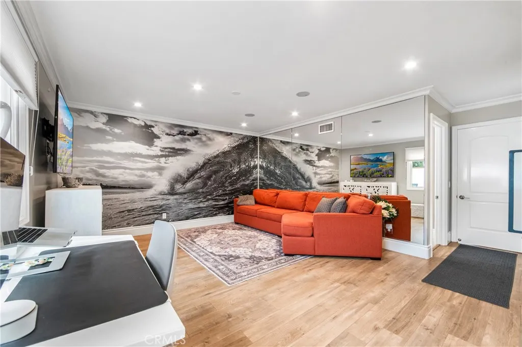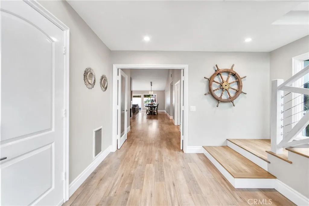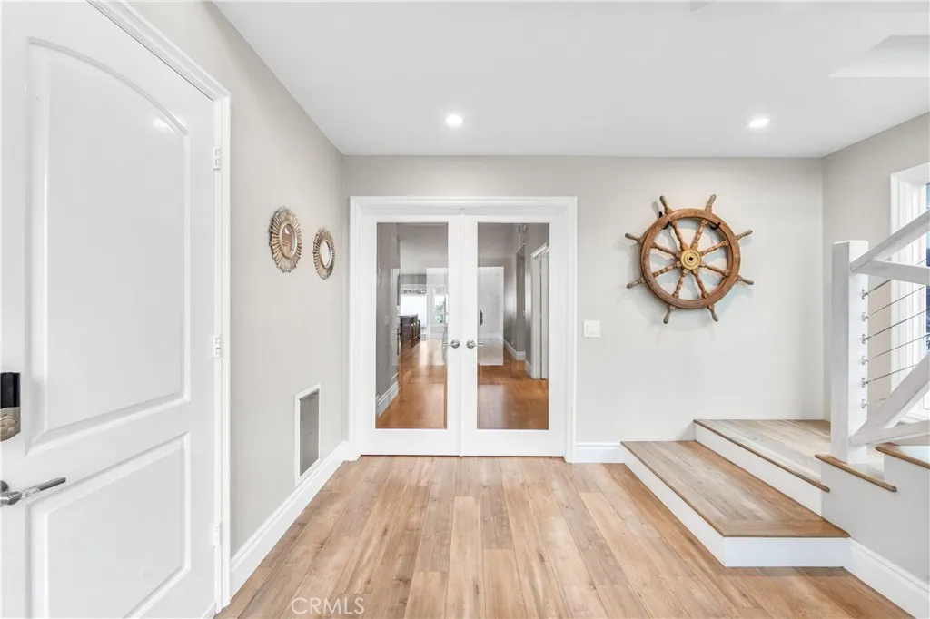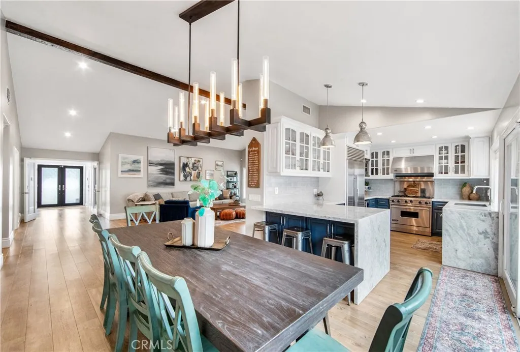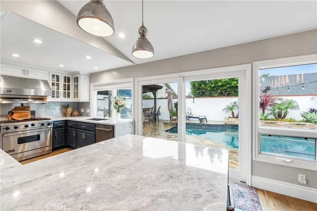 Walk to the wetlands, bike to the beach, and come home to a beautifully remodeled retreat designed for both connection and privacy. With rare dual primary suites and resort-style outdoor living, this home adapts effortlessly to every stage of life. Set on a quiet cul-de-sac near the Bolsa Chica wetlands and coastal trails, this thoughtfully expanded 4-bedroom, 3-bath home is designed for real life, whether that means morning trail walks, multigenerational living, or simply enjoying a refined coastal retreat. From the moment you enter through the custom glass door, natural light, soaring ceilings, and a sense of calm welcome you in. The main living space centers around a marble fireplace and opens through French doors to a charming side yard and resort-style backyard, creating seamless indoor-outdoor flow for both daily living and entertaining. The kitchen blends beauty and function with marble countertops, custom cabinetry, designer fixtures, and a built-in wine fridge equally suited to quiet mornings or lively gatherings. A standout feature is the rare dual-suite layout. The main level includes a spacious private suite ideal for guests or extended family, while upstairs a dramatic primary retreat offers cathedral ceilings, skylights, a Juliet balcony, soaking tub, marble shower, dual vanities, and a custom walk-in closet perfectly suited for multigenerational living or long-term flexibility. An office nook provides ideal space for remote work or study. Outdoors, the property becomes a private resort with pool, spa, waterfalls, outdoor kitchen, and lush tropical landscapi