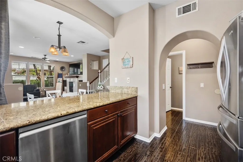 A BLEND OF MODERN AMERICAN FARMHOUSE AND A TROPICAL OASIS! Located on a corner lot in the charming Surrey Farm neighborhood of Wycliffe Village, this highly sought-after Plan 3 home showcases the most desirable floorplan in Surrey Farm, known for its unique layout, distinctive side porch entry, and exceptional livability. From the moment you step through the quaint picket fence, youll understand why this home feels like a private retreat. The porch entry is tucked along the side of the home behind lush tropical landscaping and custom stone pavers, creating a warm and welcoming approach. Inside, abundant natural light fills the inviting living room centered around a custom fireplace, ideal for relaxing or entertaining. The signature feature of this model is Surreys largest kitchen configuration, offering upgraded granite countertops, ample cabinetry and counterspace, pantry storage, bar seating, a water purification system, and newer appliances. The adjacent dining area opens to the yard through sliding doors, creating a seamless indoor-outdoor, semi-al fresco experience. The first level also includes a powder room and a utility closet that can easily be converted into a second pantry. Upstairs, the expansive primary suite serves as a private retreat with brand new carpet, a private balcony with views of the West Ridge Hills, dual sinks, a stone walk-in shower, separate Jacuzzi tub, and a custom-designed California Closets system, along with dual closets that make this layout especially sought after. Secondary bedrooms are notably spacious and filled with natural light, comp
