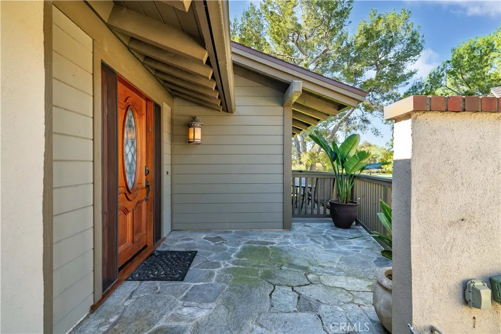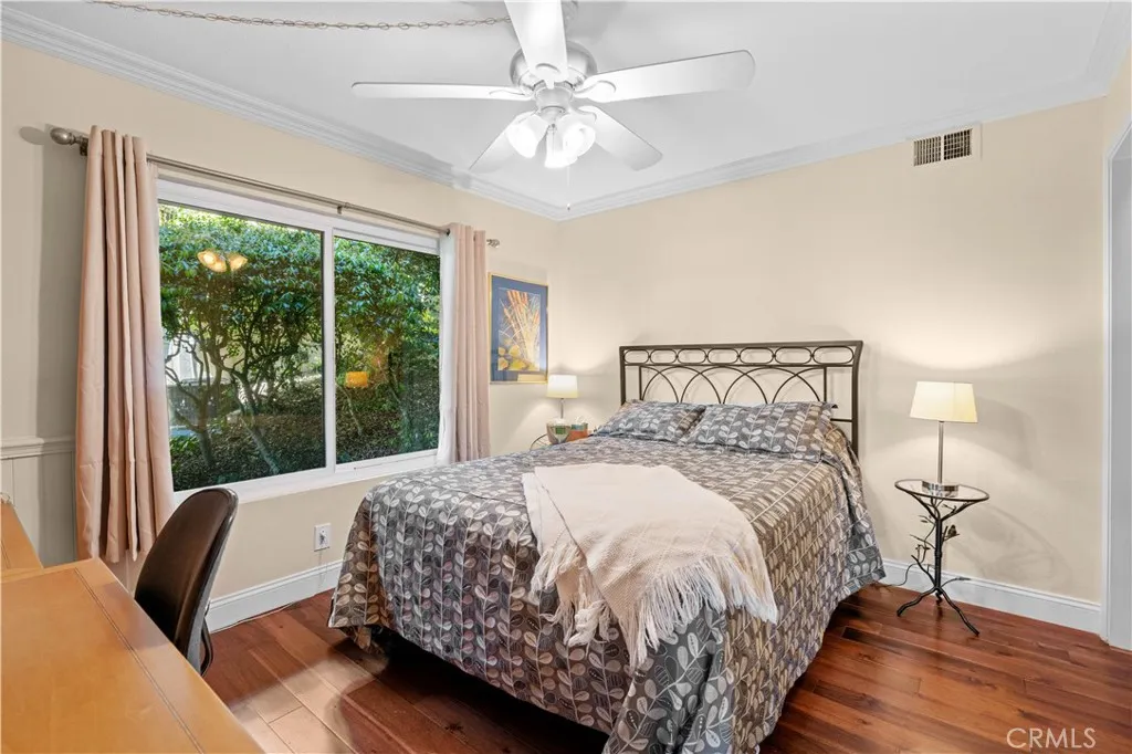 Beautifully remodeled home on a private cul-de-sac, offering panoramic views of the golf course, pond, city skyline, and sunsets, perfectly situated near the 6th and 7th fairways. Through the front gate is a courtyard featuring a fountain and rock waterfall. Inside the front door is an open room, illuminated by a skylight, that flows into the main living spaces, making it ideal for a playroom or guest area. This home has an open floor plan with cathedral ceilings and recessed lighting, enhanced by dual-pane windows that fill the space with natural light. Beautiful hardwood flooring throughout (with tile flooring in kitchen, bathrooms and laundry area). The living room seamlessly connects to the dining area and the gourmet kitchen, complete with Quartzite countertops and custom cabinetry. Sliding glass doors from both the dining room and kitchen lead to separate outdoor decks, perfect for relaxing amid lush greenery. The primary bedroom features a sliding glass door that opens to a back patio with amazing golf course views. It also includes a spacious ensuite bathroom with two vanity areas, each with its own sink and cabinets, a walk-in shower, and a privacy door to the toilet. The second back bedroom offers wide-open golf views and can easily serve as an office. Each bedroom is thoughtfully equipped with a ceiling fan for added comfort. Enjoy the convenience of a finished storage area, accessed through the downstairs front bedroom walk-in closet. The kitchen, main floor bathroom, and primary bathroom were all beautifully remodeled four years ago, while dual-pane windows wer