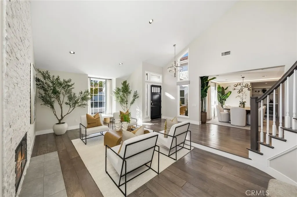 Welcome to this stunning 5-bedroom, 3-bath Orange County retreat where resort-style living meets everyday comfort in one of Irvine's most sought-after neighborhoods. From the moment you step inside, soaring ceilings and sun-drenched living spaces exude warmth and sophisticated contemporary styling throughout this beautifully maintained 3,000 sq. ft. home. The heart of the home is a sleek, well-appointed kitchen featuring quartz counters, custom cabinetry, and a chef-inspired appliance suite perfect for everything from casual family meals to elegant entertaining. A gracious living room anchored by a stunning ledger stacked stone fireplace flows effortlessly to the dining room, while a convenient downstairs bedroom and full bath offer ideal flexibility for guests or multigenerational living. Wide plank wood flooring, soaring ceilings, solid core doors, 5-inch baseboards, and newly installed energy-efficient windows speak to the quality of finishes found throughout. Upstairs, the spacious primary suite is a true sanctuary, complete with a spa-inspired bath featuring a soaking tub, walk-in shower, dual vanities, and a generous walk-in closet, while three additional bedrooms and a dedicated home office provide space and flexibility for every lifestyle. Step outside to your own private paradise a breathtaking pool and spa framed by soaring palms, lush tropical landscaping, and elegant stone pillar accents with cascading water features, all flowing seamlessly to a generous covered patio where a pendant-lit dining area and built-in BBQ set the stage for unforgettable gatherings u