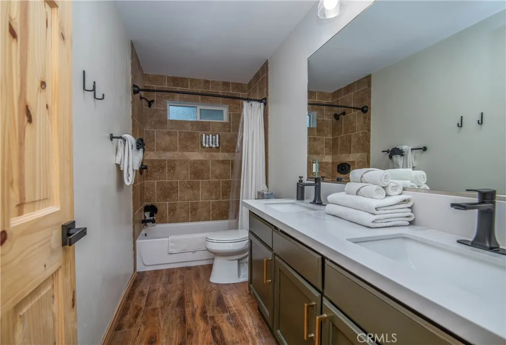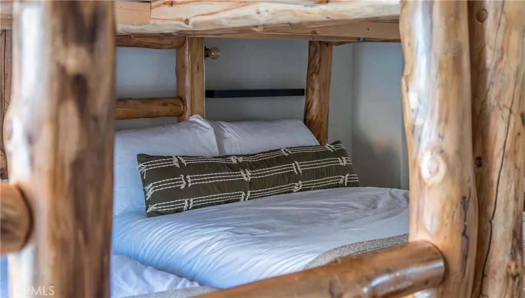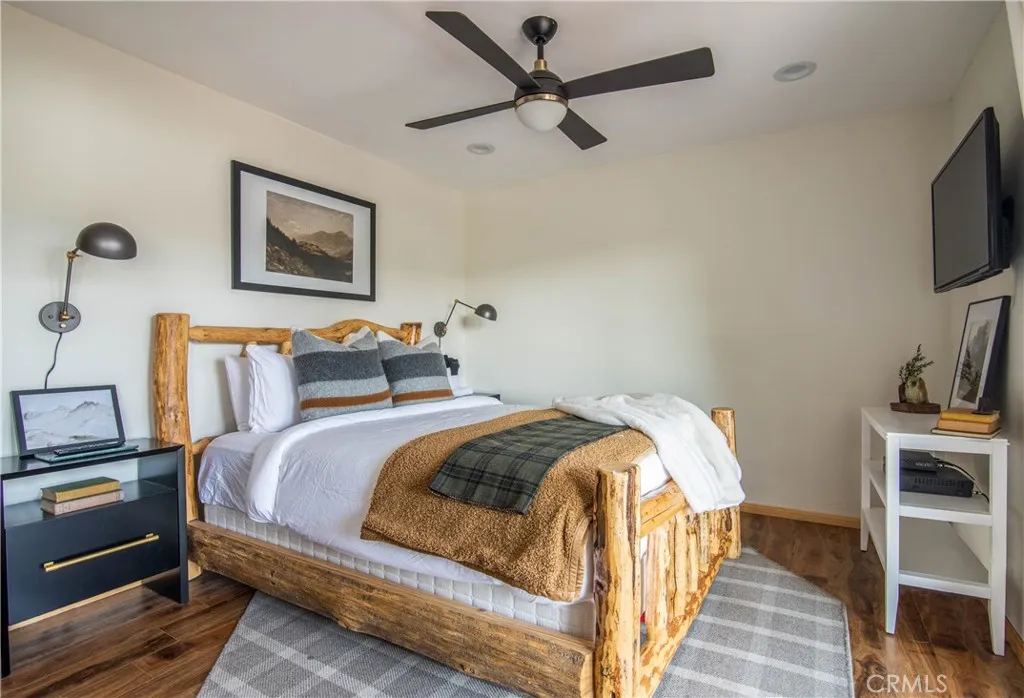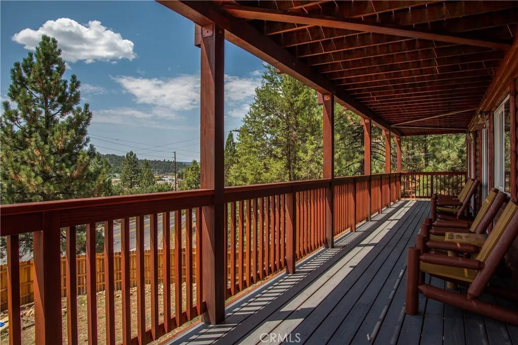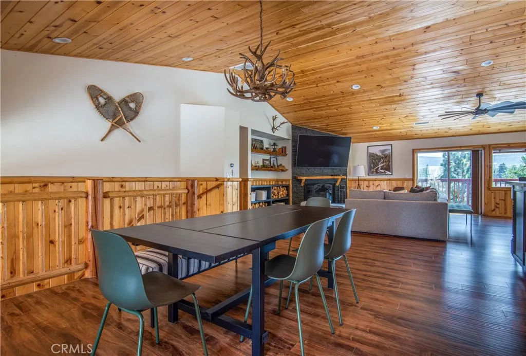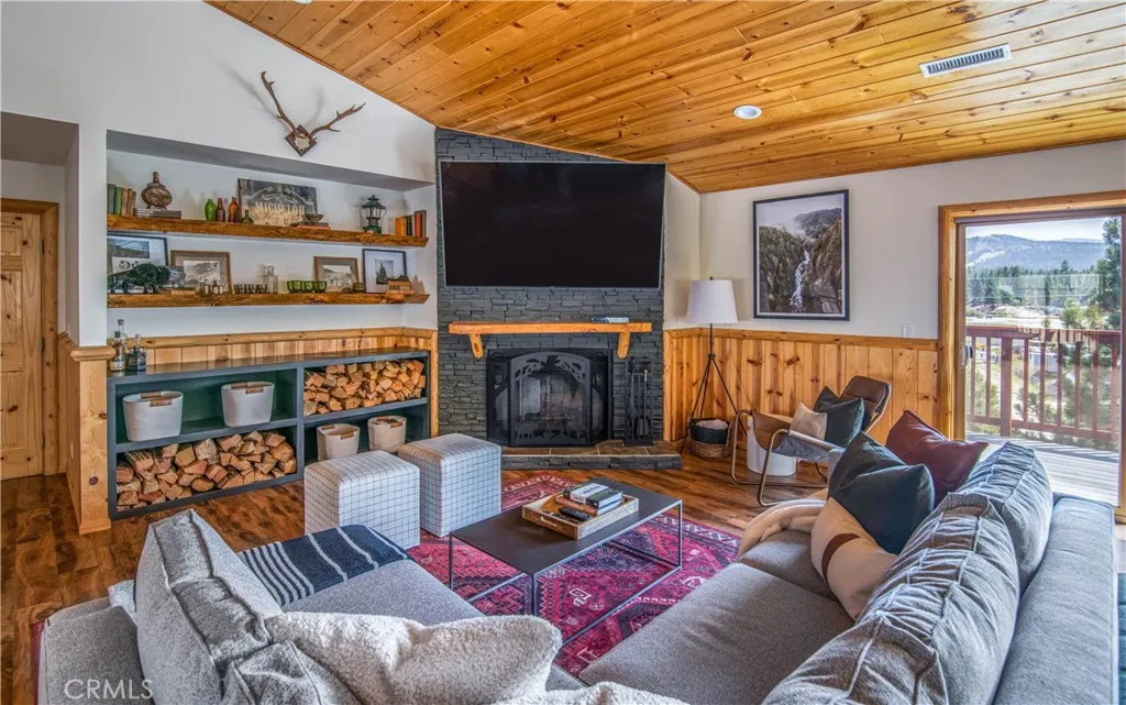Southern exposure and ski slope views define this spacious custom log-style home in Whispering Forest. Built in 2007, the property combines scale, quality construction, and thoughtful updates in one of Big Bears most desirable neighborhoods. Designed with a reverse floor plan, the upper level showcases vaulted tongue and groove ceilings, expansive windows, and an open great room that captures natural light and mountain views. The living area centers around a fireplace and built-ins, while the adjacent dining space and entertainers kitchen flow seamlessly together. The remodeled kitchen features abundant counter space, dual islands with extra wash sink and breakfast bar seating, updated cabinetry, and a layout ideal for hosting gatherings. The primary suite is also located on the upper level and offers its own fireplace, deck access, and a spacious bath with dual vanity, soaking tub, and separate shower. Downstairs, additional bedrooms, bathrooms, and a family room provide excellent separation and flexibility for guests or extended stays. Outdoor living is a true highlight, with a long covered deck framing mountain and ski slope views and creating a natural extension of the main living space. The fenced yard includes a private hot tub and fire pit area, while the lower deck offers additional access to the backyard. Situated on a 10,710 square foot corner lot with level topography, the property provides generous parking, and a two-car attached garage. The garage is currently utilized as a finished recreation space, offering added versatility. An EV charger and recently instal