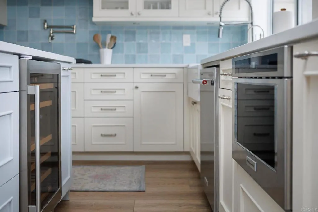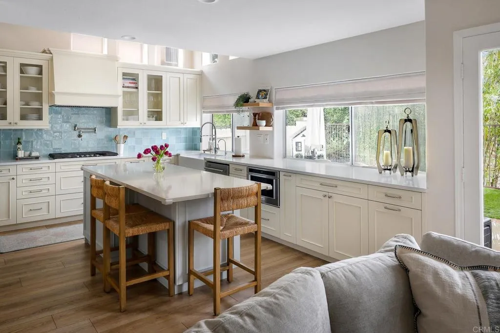 Highly sought-after Alga Hills home in Carlsbad, beautifully positioned on a premium elevated lot with sweeping La Costa Valley views from the primary suite. This two-story residence offers 1,990 sq ft of open-concept living with 3 bedrooms and 2 full baths upstairs, plus a downstairs powder room, and features over $180,000 in renovations completed since 2021. The formal living and dining areas welcome you with soaring ceilings and abundant natural light. The fully remodeled chefs kitchen includes custom cabinetry, an oversized island with seating and built-in storage, quartz countertops, farmhouse sink, double ovens, built-in microwave, pot filler, and wine refrigerator. The adjoining family room features a beautifully updated custom-tile fireplace, creating open-concept living. Luxury vinyl plank flooring extends throughout the home, complemented by a full interior repaint, refreshed lighting and electrical, plantation shutters, and remodeled bathrooms with modern fixtures and finishes. A new A/C unit was installed in 2022. Exterior improvements include fresh paint, low-maintenance turf in the backyard, and more. Community amenities include two pools and parks, with convenient access to beaches, shopping, dining, and award-area schools including La Costa Meadows Elementary School, San Elijo Middle School, and San Marcos High School.