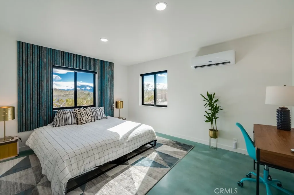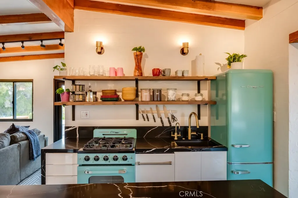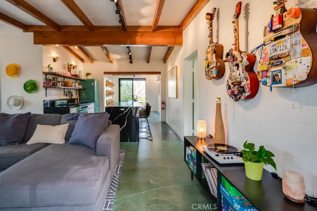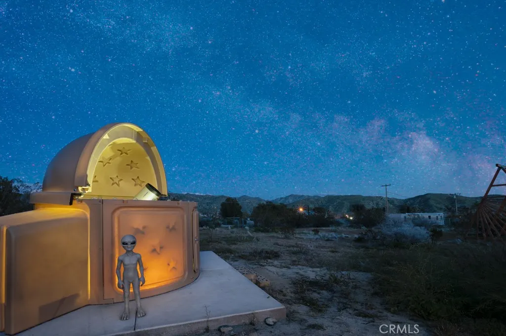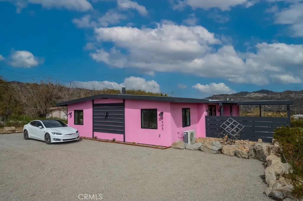 Pink Galaxy holds strong chromatic themes, original art, and is a star grazers dream in a special paradise. Halfway between Joshua Tree and Palm Springs exists a special medium between stars, city, alpine, and an always oasis climate. Magically cooler in summer and warmer in winter than its neighboring areas, large fruit trees grow next to stark Joshua Trees in this special zone of the desert due to its high water table, subterranean rivers, natural springs, creeks and marshes. This home is a 1961 homestead with a low modern roof line and beamed ceilings, the floor is polished concrete is stained aqua marine in juxtaposition of its pink exterior like an image from Hubble. The Kitchen is socially open to both the living room and dining room separately to left and right. It features under counter appliances and open shelving to preserve head space. The stove and fridge are retro Classic brand in power coated aqua further nodding to the home's mid-century vibe. Island and counters are black marble quartz with waterfall ends, providing extra storage and under counter drawer microwave and dishwasher. There are 2 Large Bedrooms with a third flexible bonus room that is being used as a bedroom, but can be used as an office, den, or yoga room. The living room is centered on an original rock wall and wood stove with entertainment center, perpendicular is a contemporary record player station with high-fi speakers above hangs several vintage guitars formed as one-of-a-kind artworks. The dining room has an integrated lighting design consisting of backlit mounted rice hats and a dining s