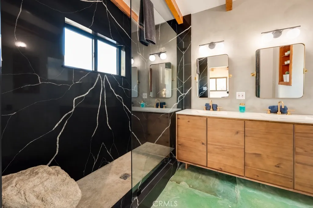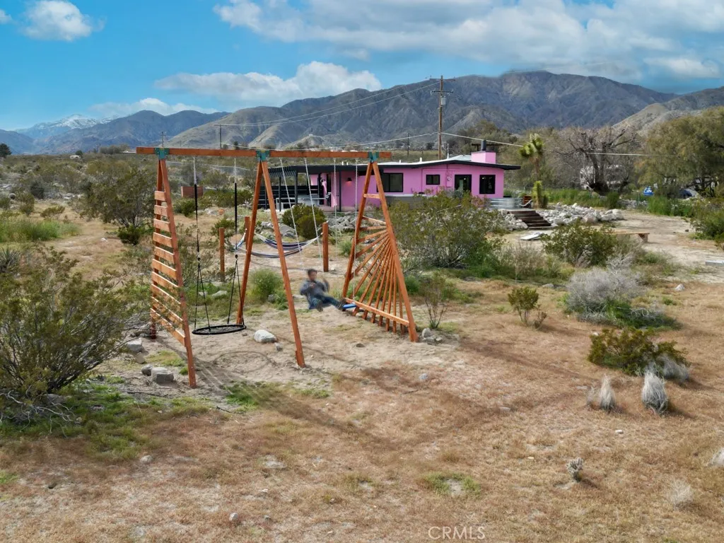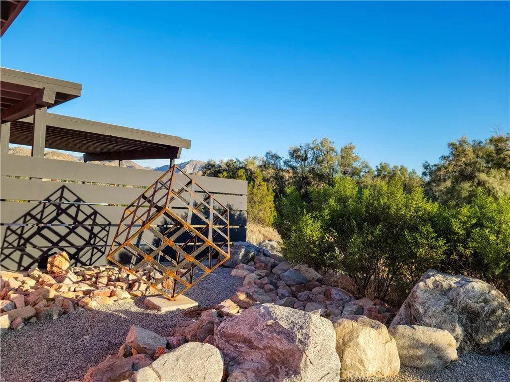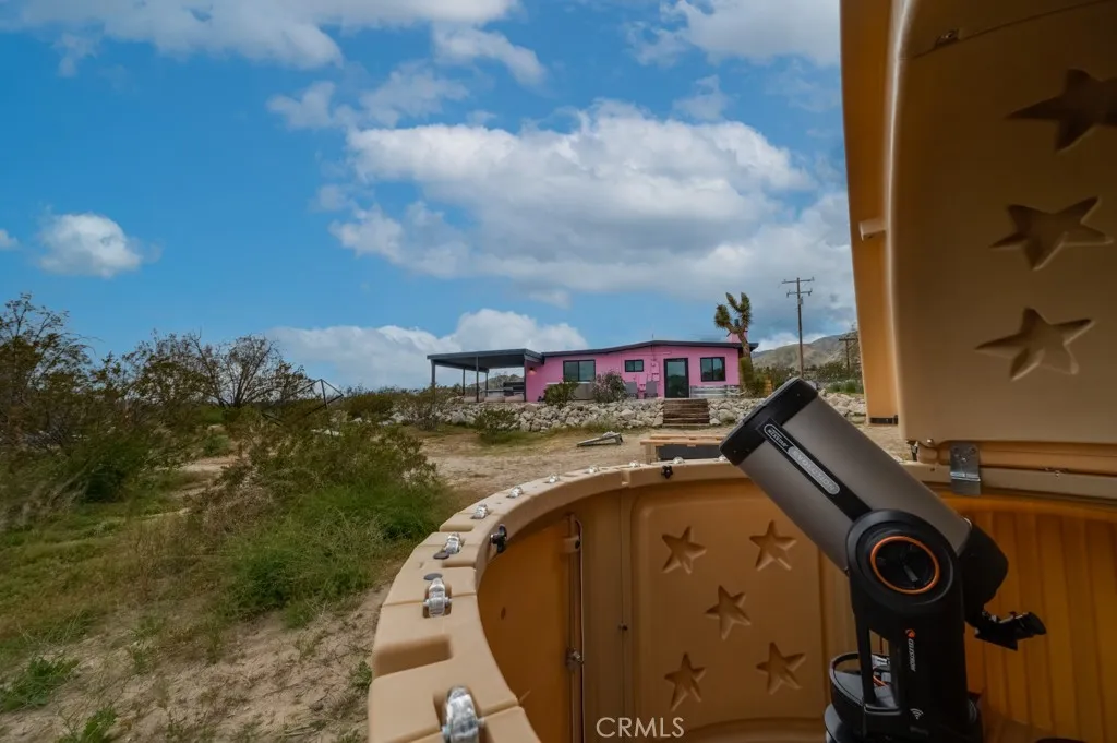 Pink Galaxy holds strong chromatic themes, original art, and is a star grazers dream in a special paradise. Halfway between Joshua Tree and Palm Springs exists a special medium between stars, city, alpine, and an always oasis climate. Magically cooler in summer and warmer in winter than its neighboring areas, large fruit trees grow next to stark Joshua Trees in this special zone of the desert due to its high water table, subterranean rivers, natural springs, creeks and marshes. This home is a 1961 homestead with a low modern roof line and beamed ceilings, the floor is polished concrete is stained aqua marine in juxtaposition of its pink exterior like an image from Hubble. The Kitchen is socially open to both the living room and dining room separately to left and right. It features under counter appliances and open shelving to preserve head space. The stove and fridge are retro Classic brand in power coated aqua further nodding to the home's mid-century vibe. Island and counters are black marble quartz with waterfall ends, providing extra storage and under counter drawer microwave and dishwasher. There are 2 Large Bedrooms with a third flexible bonus room that is being used as a bedroom, but can be used as an office, den, or yoga room. The living room is centered on an original rock wall and wood stove with entertainment center, perpendicular is a contemporary record player station with high-fi speakers above hangs several vintage guitars formed as one-of-a-kind artworks. The dining room has an integrated lighting design consisting of backlit mounted rice hats and a dining s