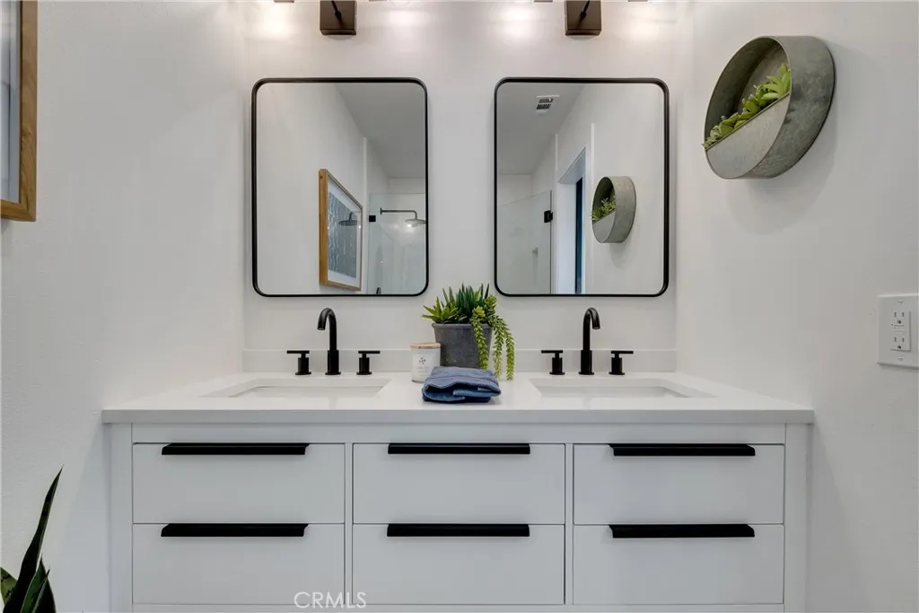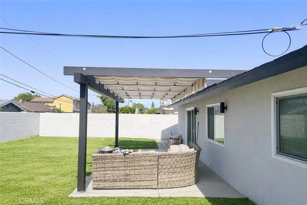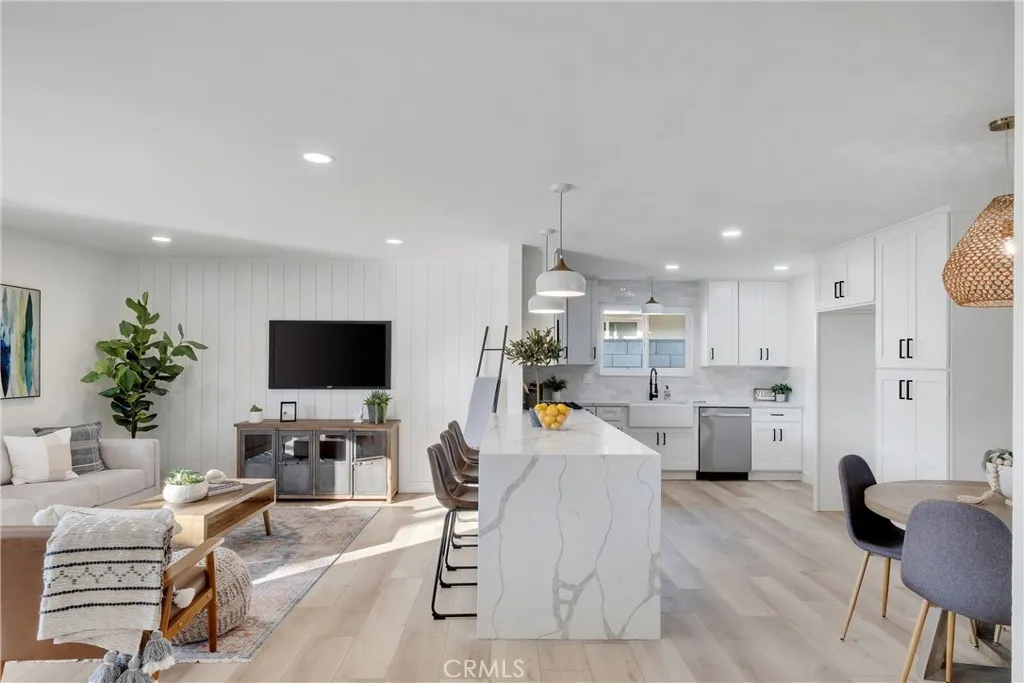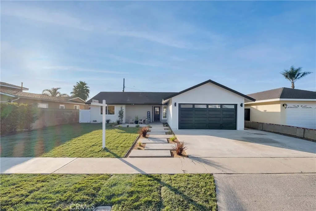 Absolutely breathtaking Huntington Beach home, nestled in a beautiful family neighborhood, completely re-imagined from top to bottom, inside & out in 2022! Every detail of the home has been meticulously taken into consideration, with impressive features, layout, and flow inspired by a professional design team. Some details include: breath-taking kitchen and bathrooms, whole house re-pipe, dual pane windows, new hardscape & landscape, finished garage, etc!! The dining area is appointed with massive windows and a boho style chandelier, bringing beautiful light into the space. The kitchen features a massive 8 foot peninsula with waterfall finish, crisp shaker cabinetry, and modern lighting and fixtures. The main living area features stunning floor to ceiling wide plank vertical shiplap that brings texture and personality. Your primary bedroom retreat features an enormous bathroom with stylish and unique finishes, not normally found in other homes on the market. The guest bathroom is extremely impressive with fun pattern tiles, a beautiful vanity, and gorgeous fixtures. Some additional key notes of the home include mentioning the large front and back patios, new landscape, concrete and hardscape, automatic sprinklers, finished garage with recessed lighting, epoxy flooring and newer garage door, Eternity Brand vinyl plank flooring, Bedrosian's tile & stone, Plantation shutters, Samsung appliances, Starbridge custom windows, black barn doors, recessed lighting, custom black modern fixtures, back patio pergola with retractable awning & so much more! This one level home is absolute