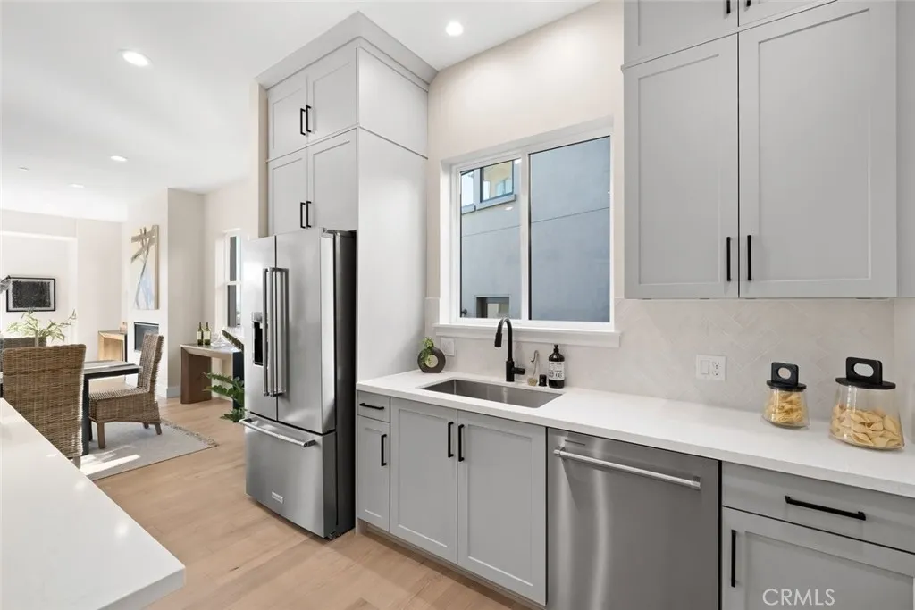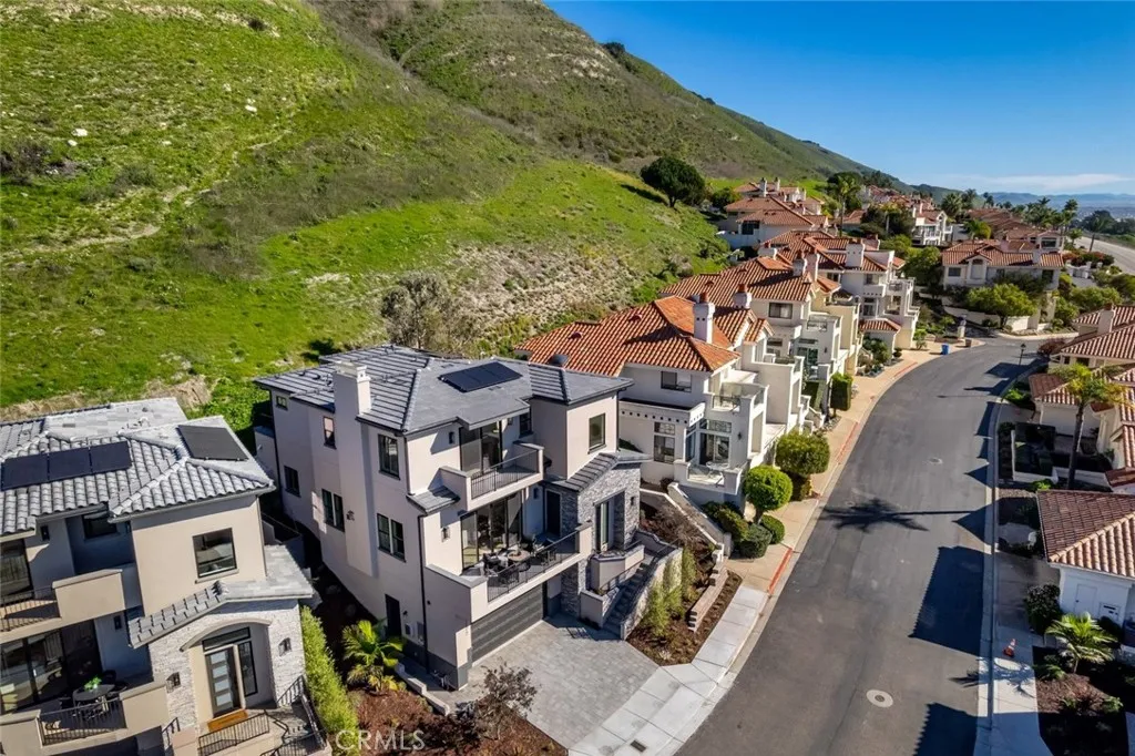 Perched to capture stunning west-facing ocean vistas and framed by the natural beauty of the Pismo Beach foothills, this newly built Mediterranean-inspired residence offers a refined take on modern coastal living. Thoughtfully planned with both elegance and practicality in mind, the home features owned solar, optional elevator capability, and impressive storage on every level. Striking professional landscaping and a paver driveway lead to the two-car garage and entry level, where deep storage spaces, under-stair storage, and a tankless water heater closet provide everyday convenience. Inside, rich Bravada hardwood floors, paneled interior doors, and quality craftsmanship create a warm, elevated atmosphere throughout. The main living level is filled with natural light and designed for easy entertaining, with a spacious living room centered around a gas fireplace and opening to an expansive deck with sweeping ocean views. The adjacent dining area flows into the chefs kitchen, equipped with all-new KitchenAid stainless steel appliances including a range, range hood, dishwasher, refrigerator with ice maker, and combo microwave wall oven. Quartz countertops, white shaker cabinetry, a walk-in pantry, and a large island with seating complete the space. A tranquil guest bedroom with its own ensuite bath offers flexibility in accomodation, while a convenient half bath and a peaceful terrace with privacy fencing complete the level. The upper level is dedicated to rest and retreat. The primary suite showcases exceptional ocean views from a private deck, a generous walk-in closet, and