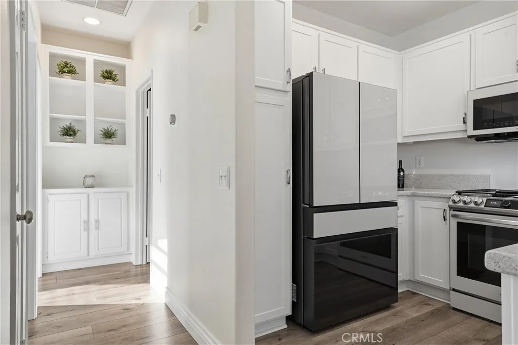 Modern updates and everyday comfort come together in this bright and inviting 2-bedroom, 2-bathroom corner carriage-style condo in Rancho Santa Margarita. With the garage below and all living space on one level, this thoughtfully refreshed home offers privacy, convenience, and a move-in-ready lifestyle. Inside, the home features new flooring installed in 2023, fresh interior paint, custom feature walls, and a restyled fireplace mantle that adds warmth and character to the living space. The kitchen has been refreshed with professionally resurfaced white cabinetry, new hardware, and a full suite of 2024 Samsung Bespoke smart appliances, including a gas stove, dishwasher, microwave, and refrigerator. Several key systems have also been recently updated for added peace of mind. Improvements include a brand-new water heater (2024), a Nest-controlled central AC system, and a Samsung top-load washer and dryer set (2023). The primary suite offers a comfortable retreat with mirrored closet doors and a new glass shower door installed in 2024. Additional highlights include a 1-car garage with epoxy flooring and a newer door mechanism, plus an additional reserved parking space. New blinds, upgraded outlet plates, and refinished stair railings add to the home's polished feel. Ideally located near parks, scenic hiking trails, shopping, and dining, this home offers convenient access to the lifestyle amenities that make living in Rancho Santa Margarita so desirable.